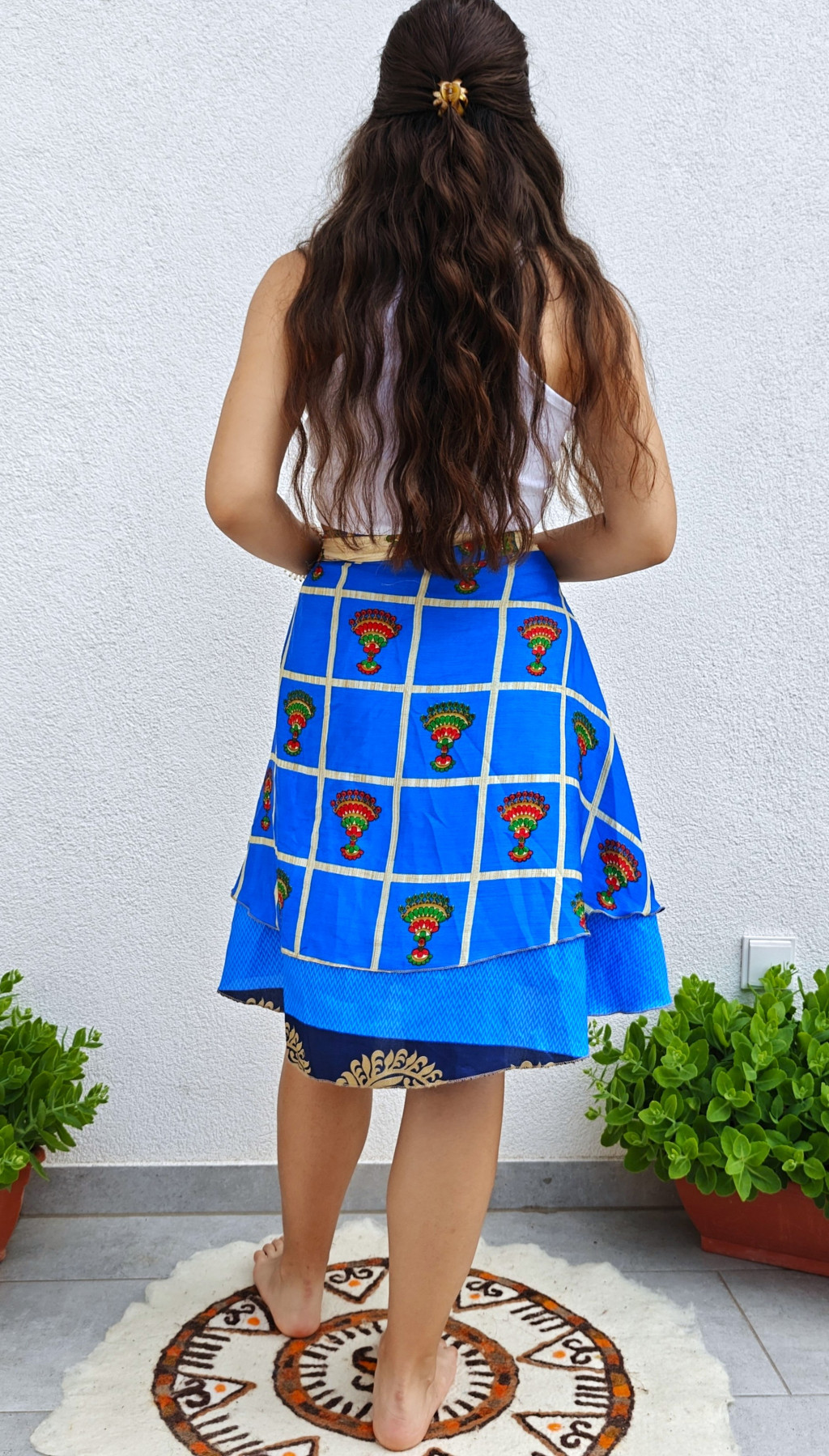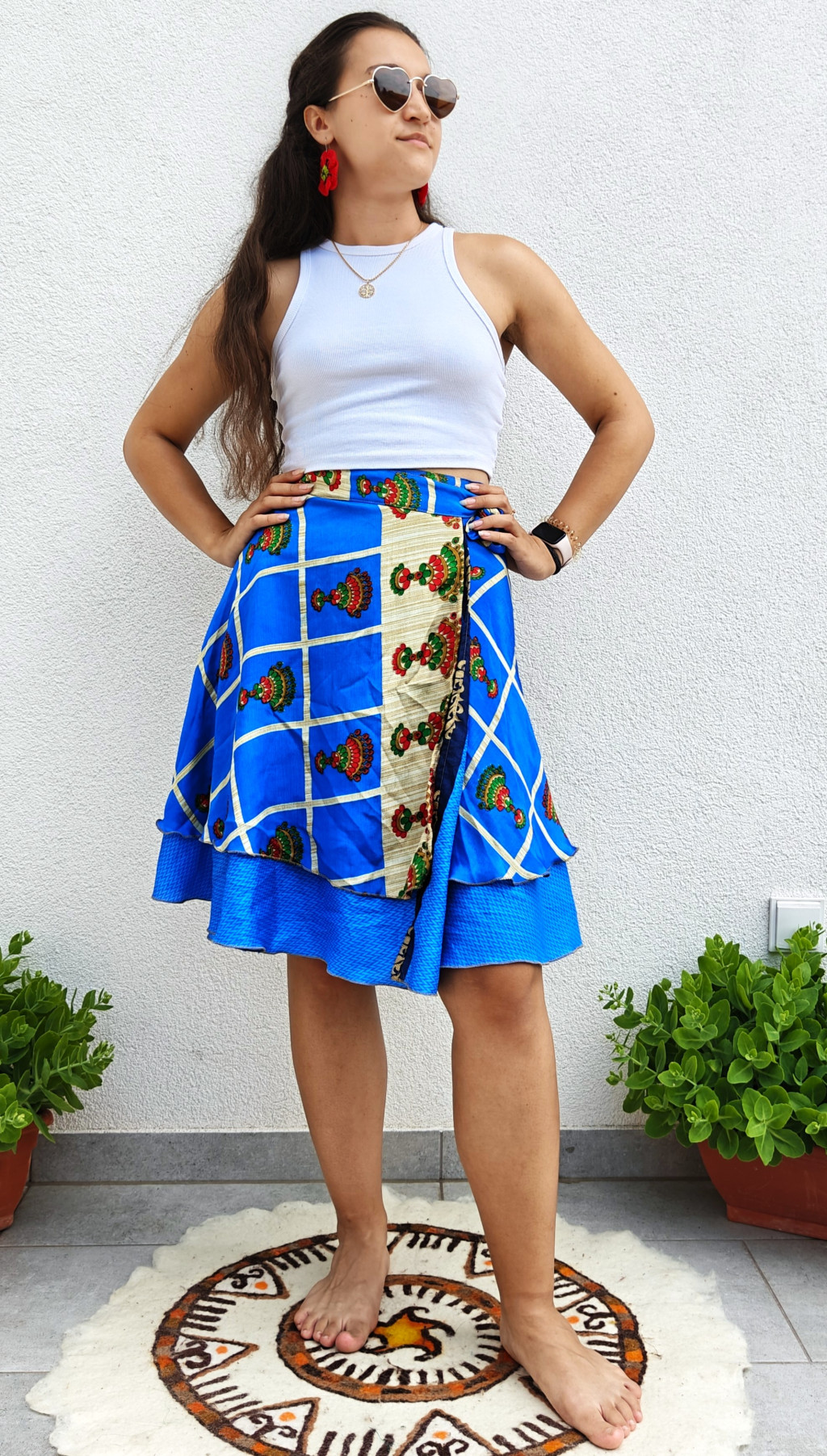 Lapszoknyáink újrahasznosított szárikból készülnek Indiában, egy hosszabb és egy rövidebb anyag derékban összevarrva! Kifordítható, mindkét oldala hordható, sokféleképpen köthető, variálható. Szoknyáinkból nincs két egyforma, mindegyikből csak EGY darab van, ha megtetszik, csapj le rá!