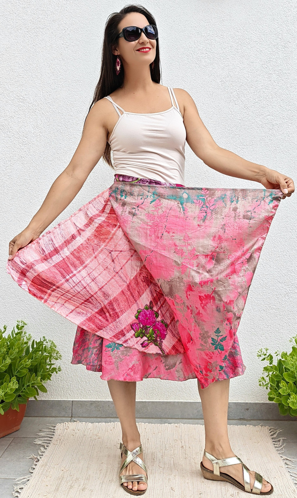 Lapszoknyáink újrahasznosított szárikból készülnek Indiában, egy hosszabb és egy rövidebb anyag derékban összevarrva! Kifordítható, mindkét oldala hordható, sokféleképpen köthető, variálható. Szoknyáinkból nincs két egyforma, mindegyikből csak EGY darab van, ha megtetszik, csapj le rá!