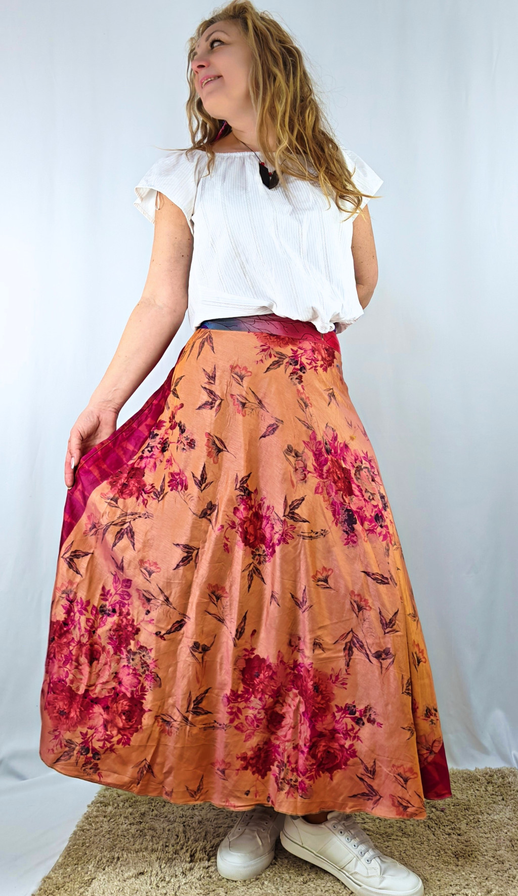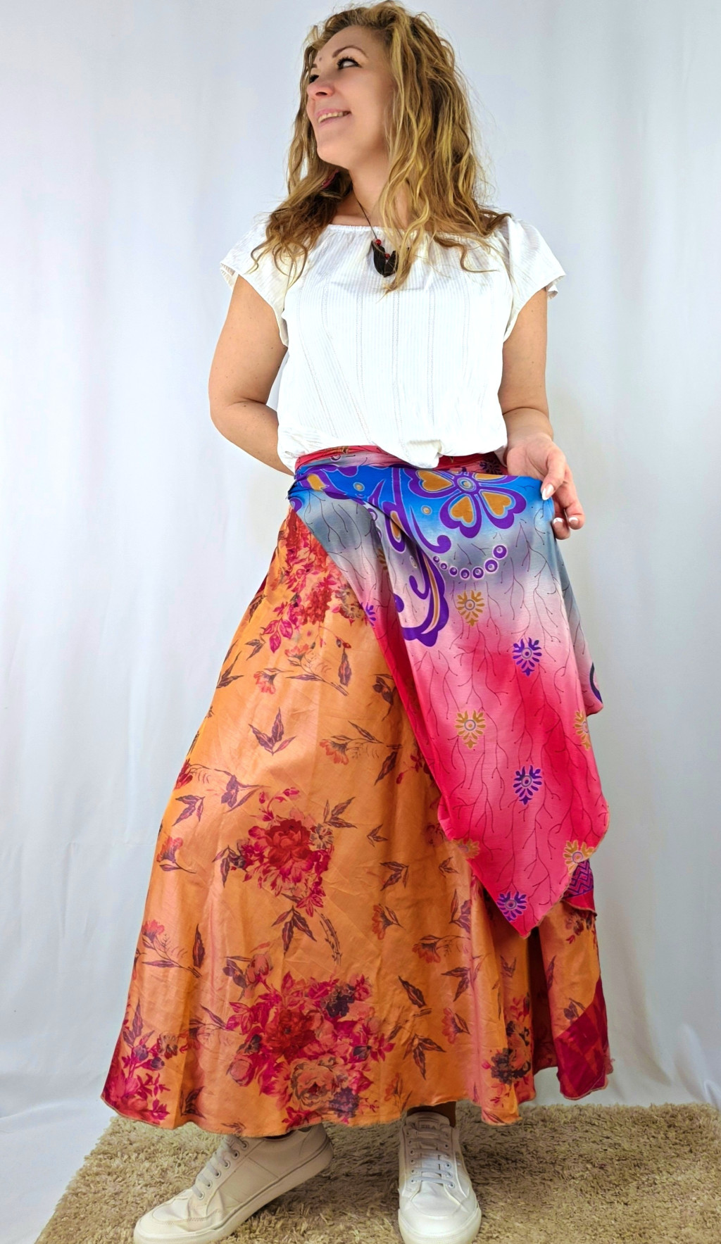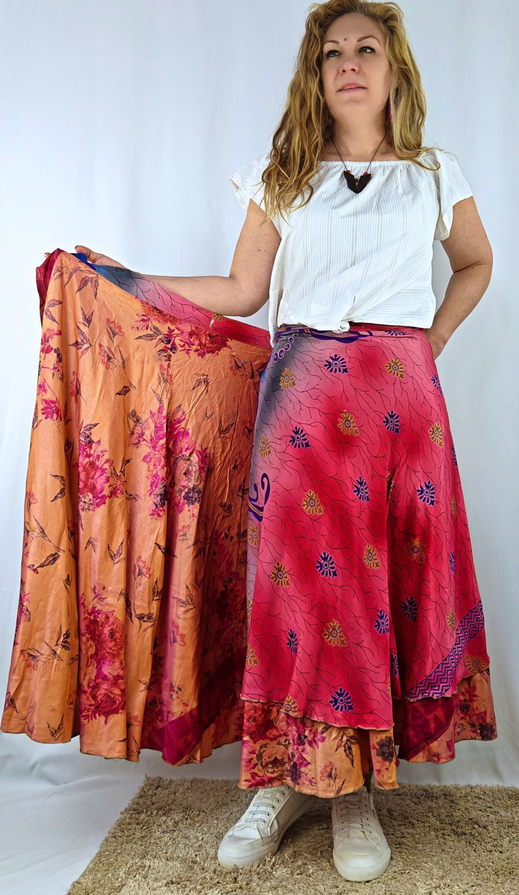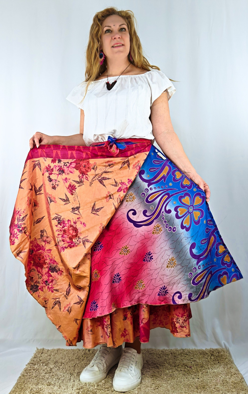 Lapszoknyáink újrahasznosított szárikból készülnek Indiában, egy hosszabb és egy rövidebb anyag derékban összevarrva! Két oldalú, kifordítható, mindkét oldala hordható, sokféleképpen köthető, variálható. Szoknyáinkból nincs két egyforma, mindegyikből csak EGY darab van, ha megtetszik, csapj le rá!