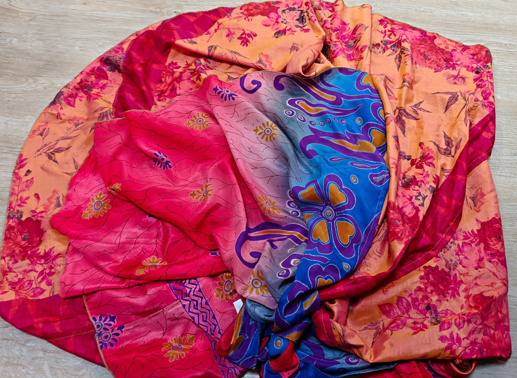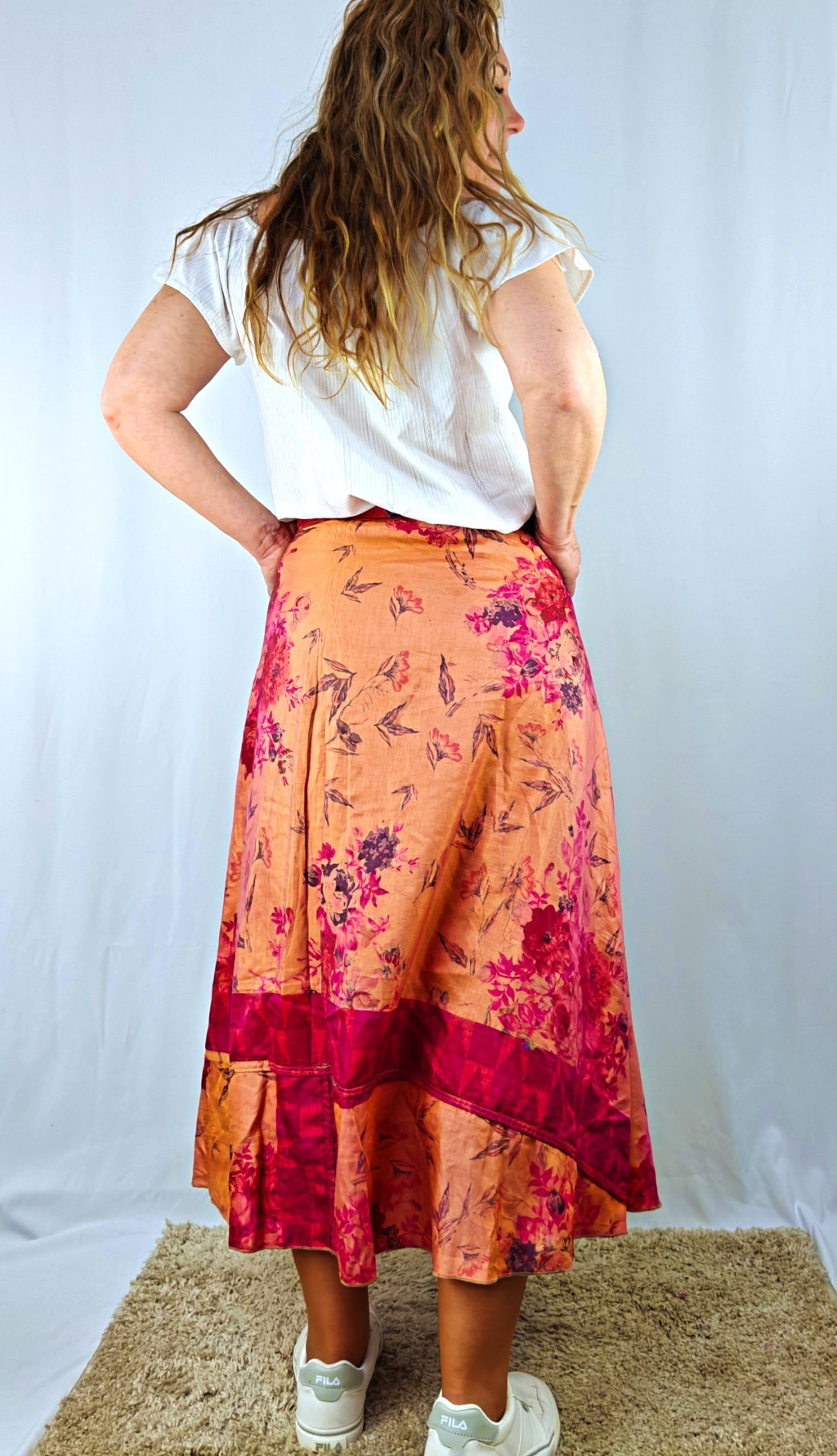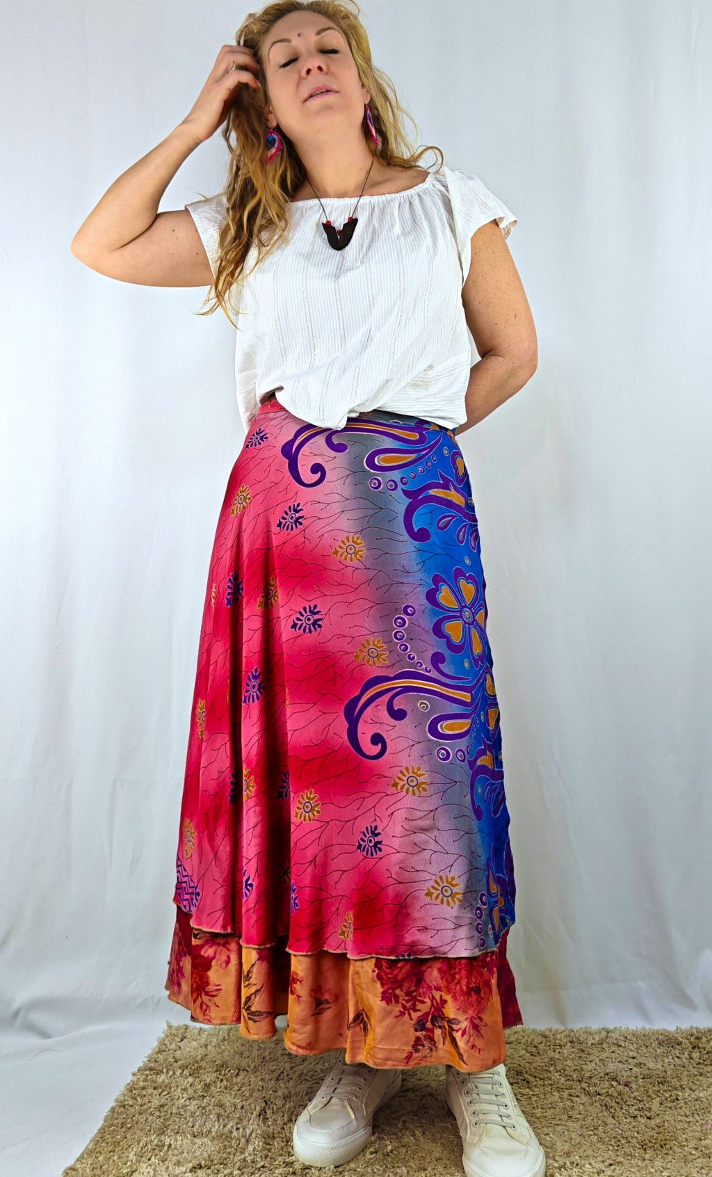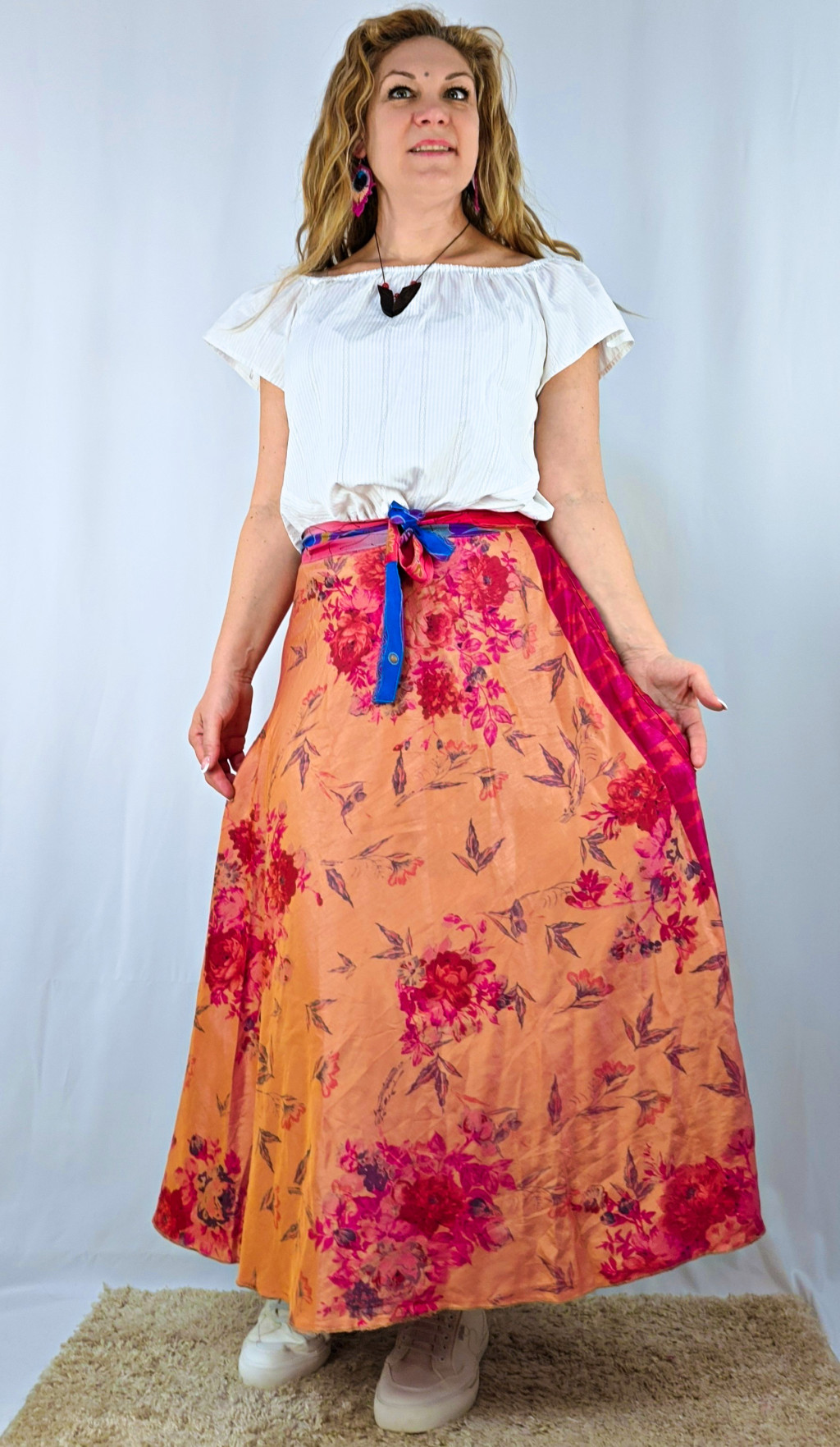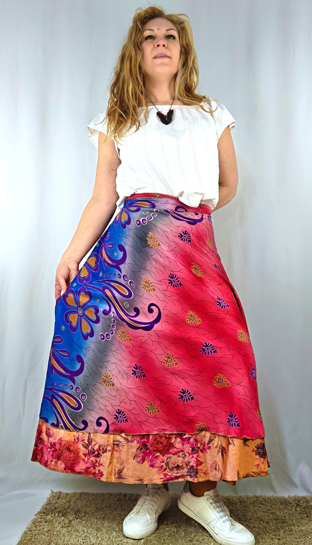 Lapszoknyáink újrahasznosított szárikból készülnek Indiában, egy hosszabb és egy rövidebb anyag derékban összevarrva! Két oldalú, kifordítható, mindkét oldala hordható, sokféleképpen köthető, variálható. Szoknyáinkból nincs két egyforma, mindegyikből csak EGY darab van, ha megtetszik, csapj le rá!