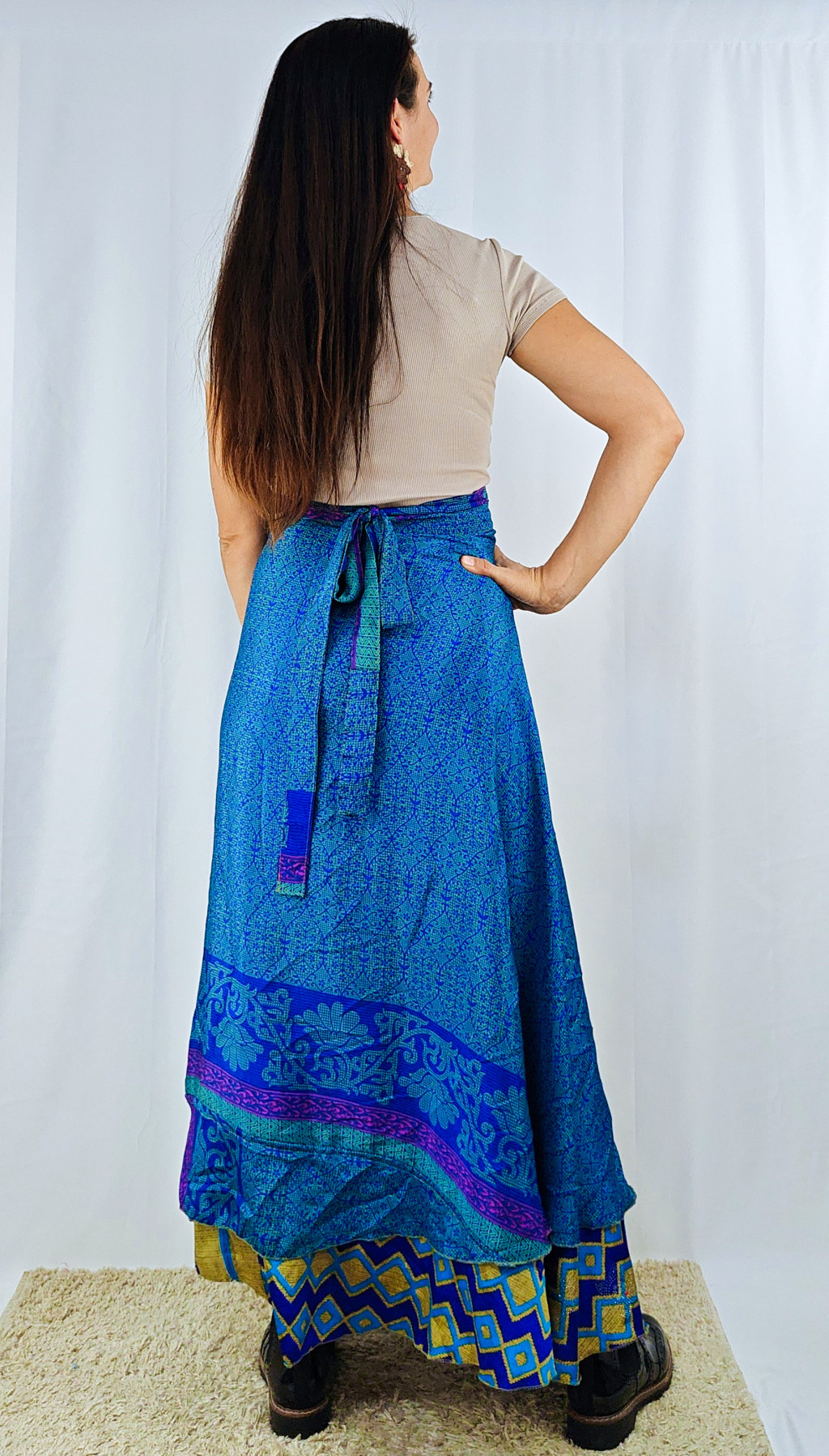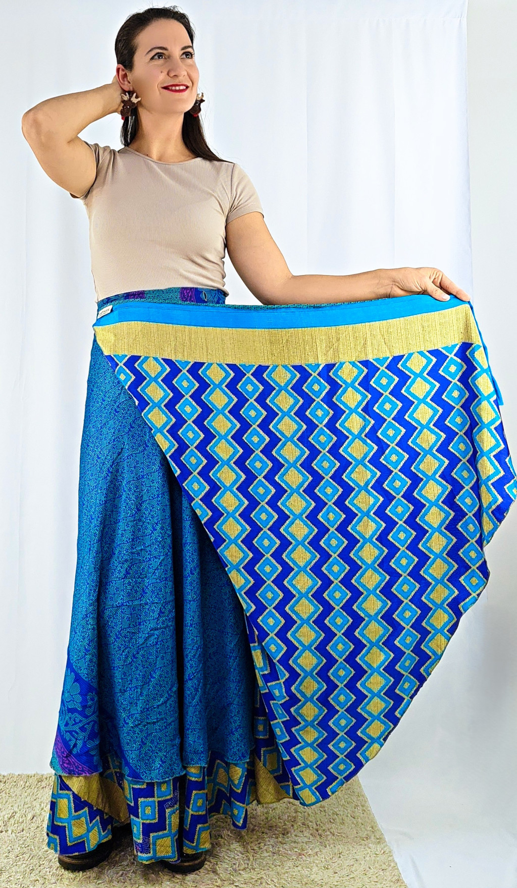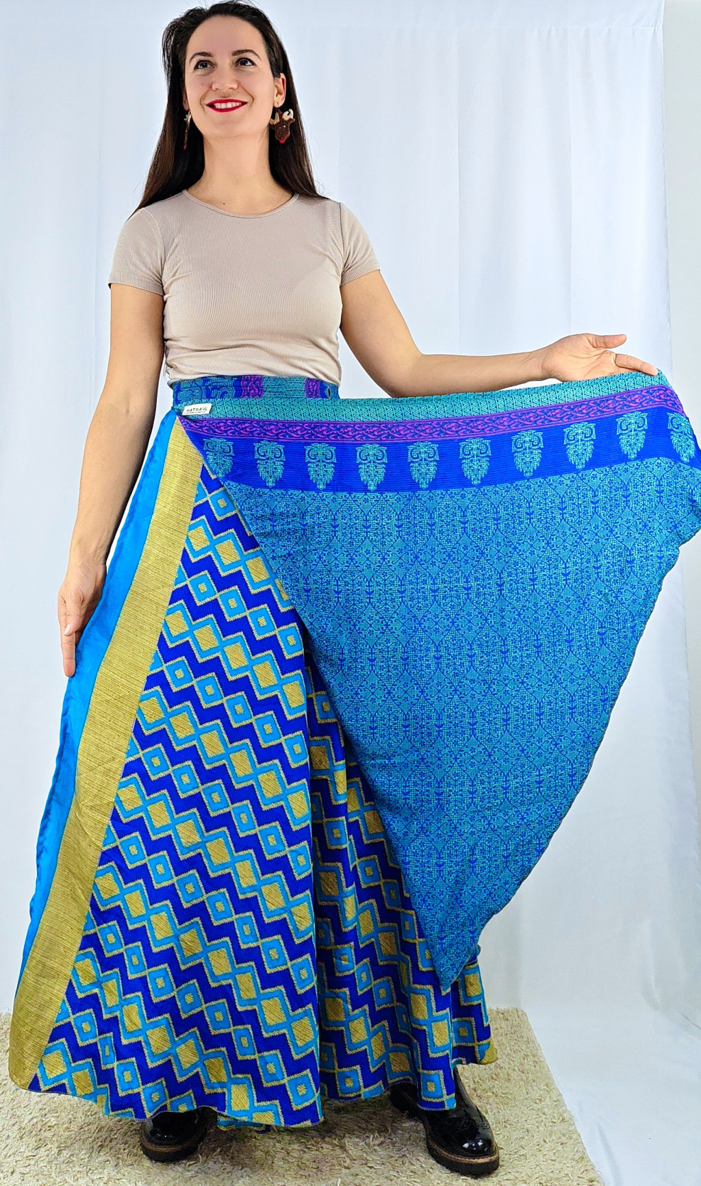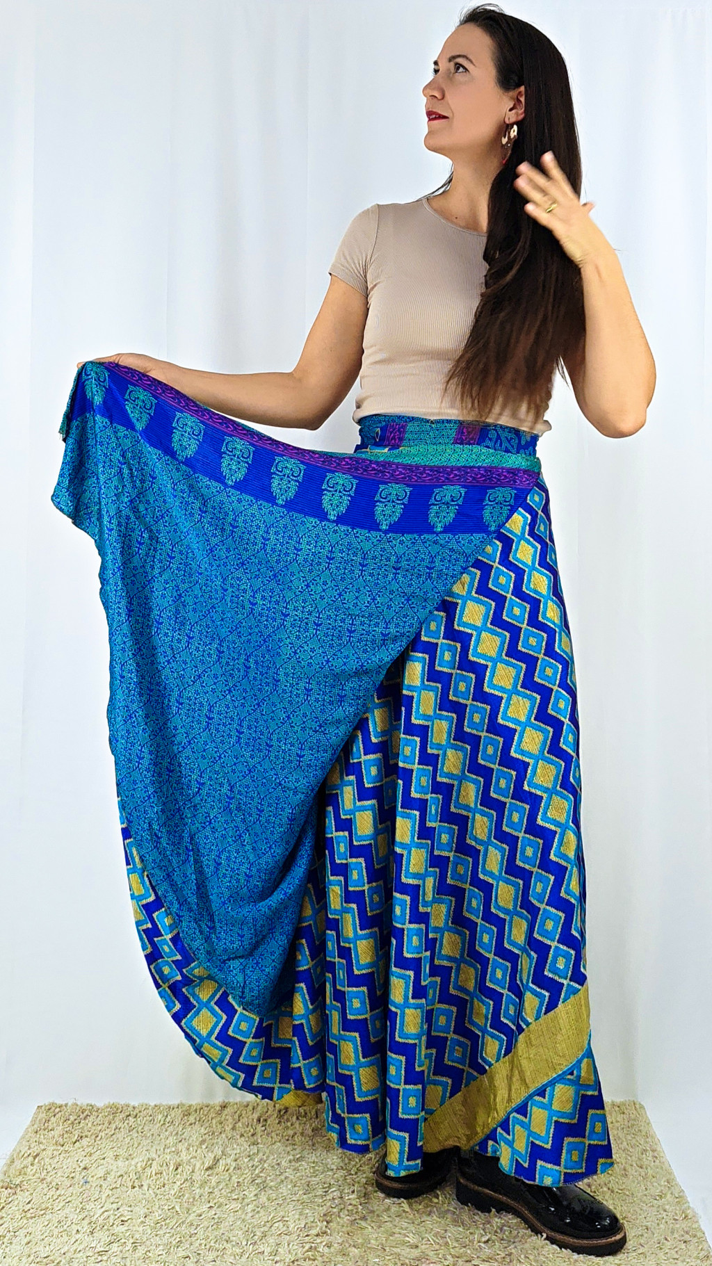 Lapszoknyáink újrahasznosított szárikból készülnek Indiában, egy hosszabb és egy rövidebb anyag derékban összevarrva! Két oldalú, kifordítható, mindkét oldala hordható, sokféleképpen köthető, variálható. Szoknyáinkból nincs két egyforma, mindegyikből csak EGY darab van, ha megtetszik, csapj le rá!