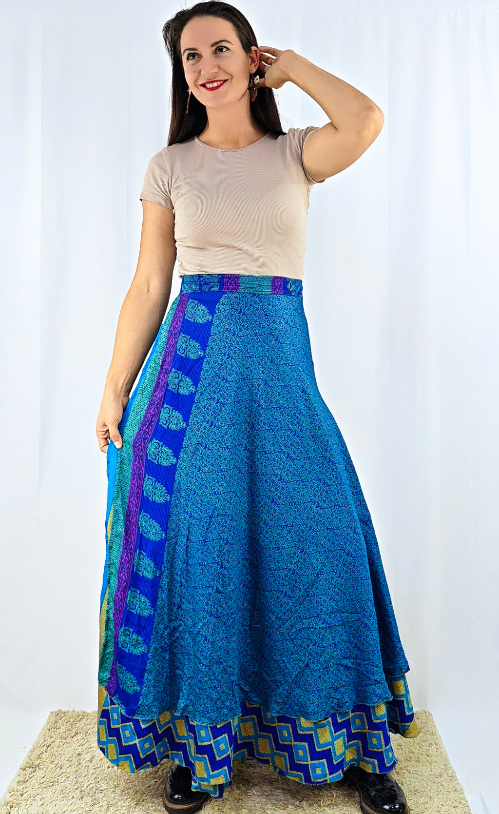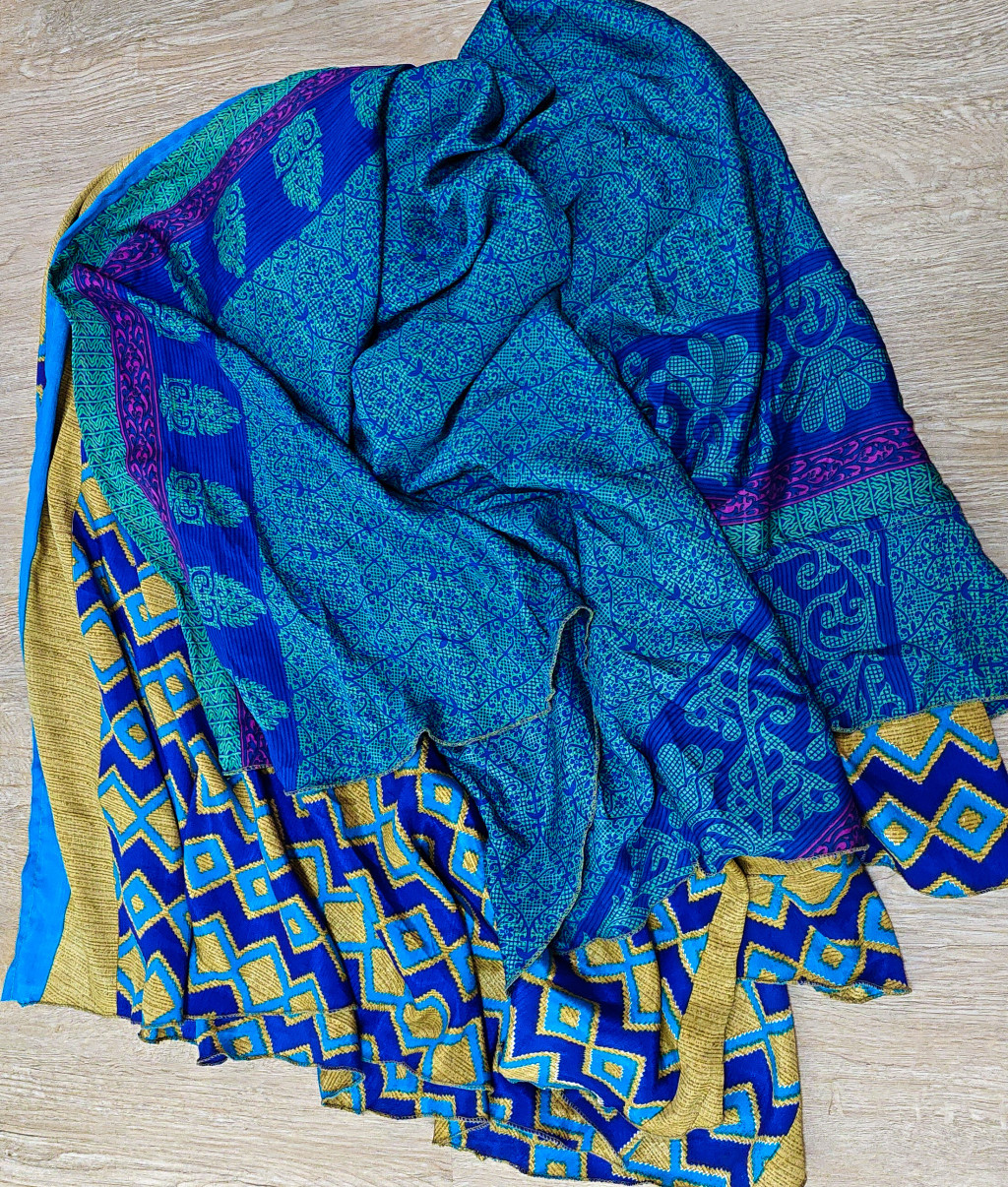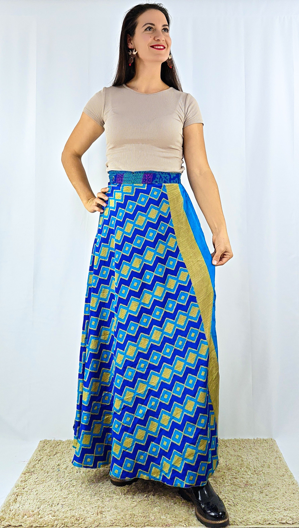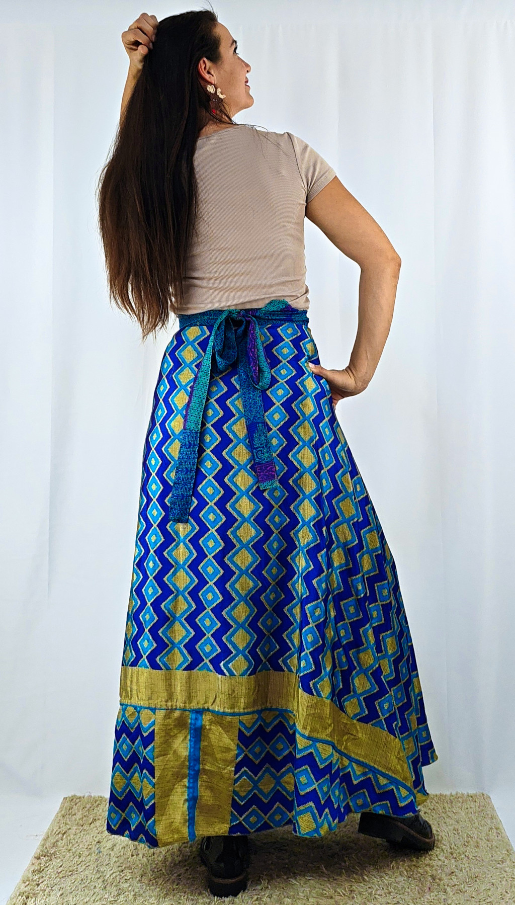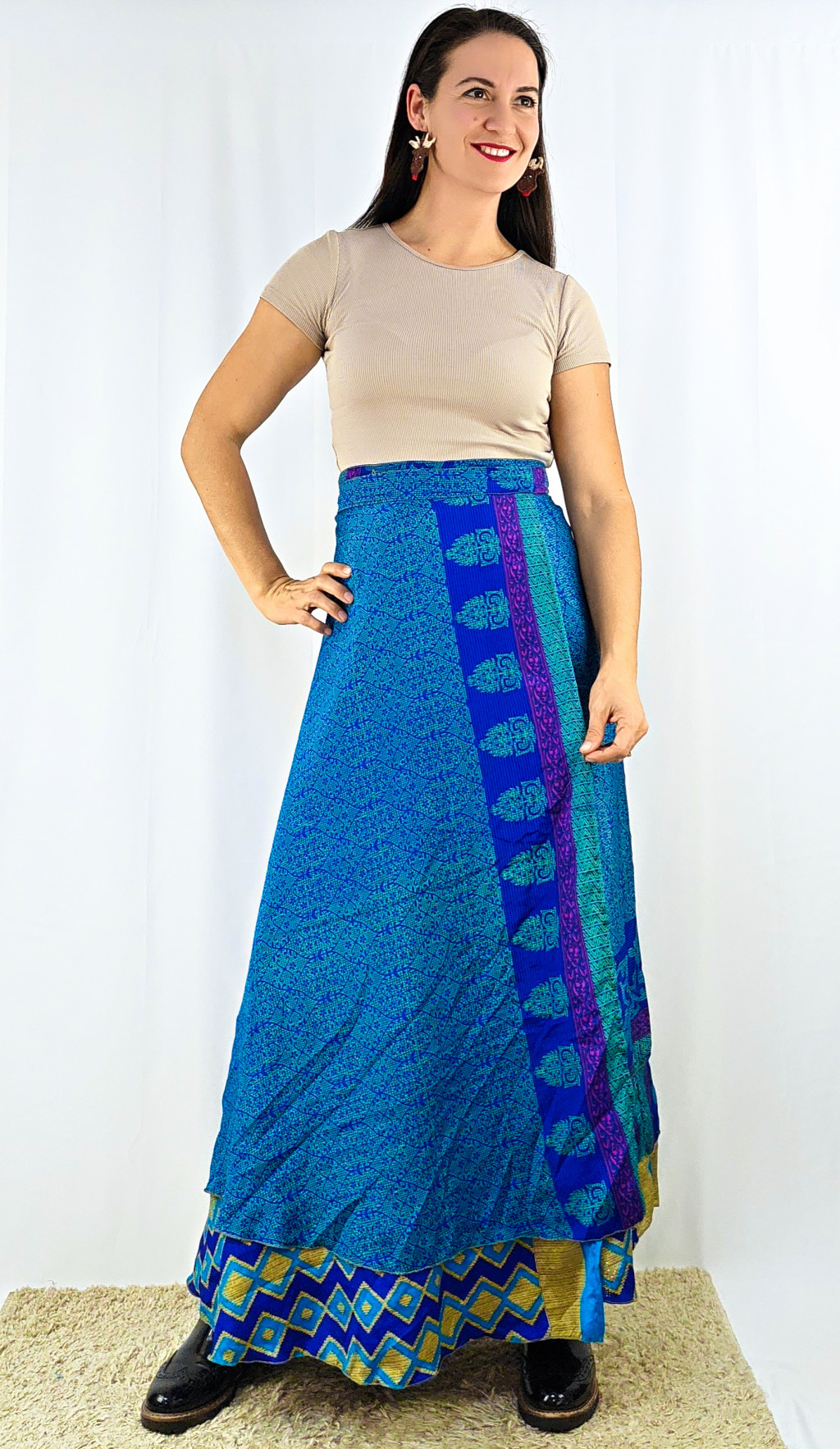 Lapszoknyáink újrahasznosított szárikból készülnek Indiában, egy hosszabb és egy rövidebb anyag derékban összevarrva! Két oldalú, kifordítható, mindkét oldala hordható, sokféleképpen köthető, variálható. Szoknyáinkból nincs két egyforma, mindegyikből csak EGY darab van, ha megtetszik, csapj le rá!