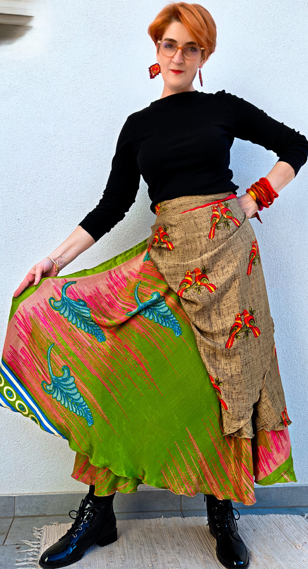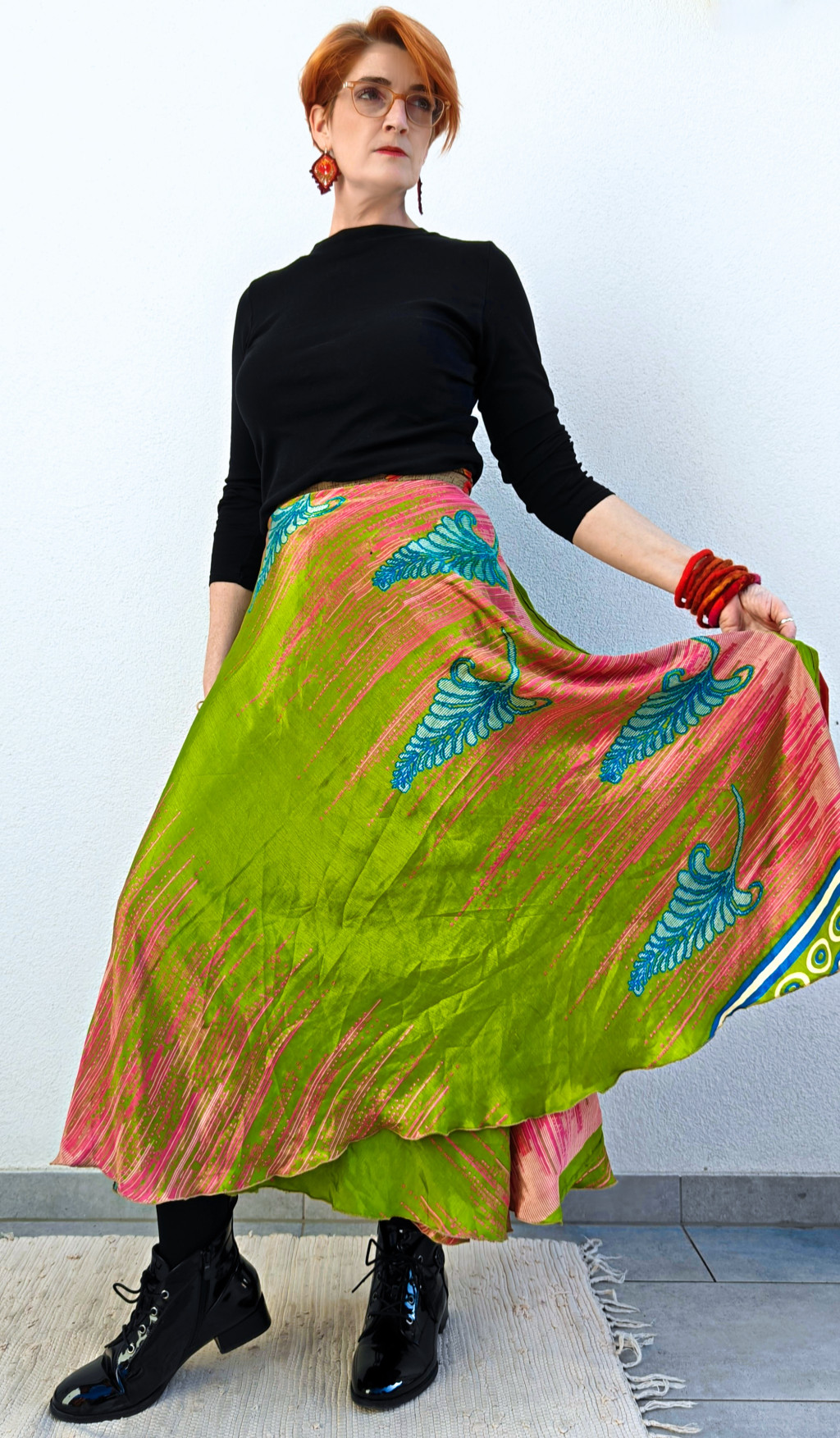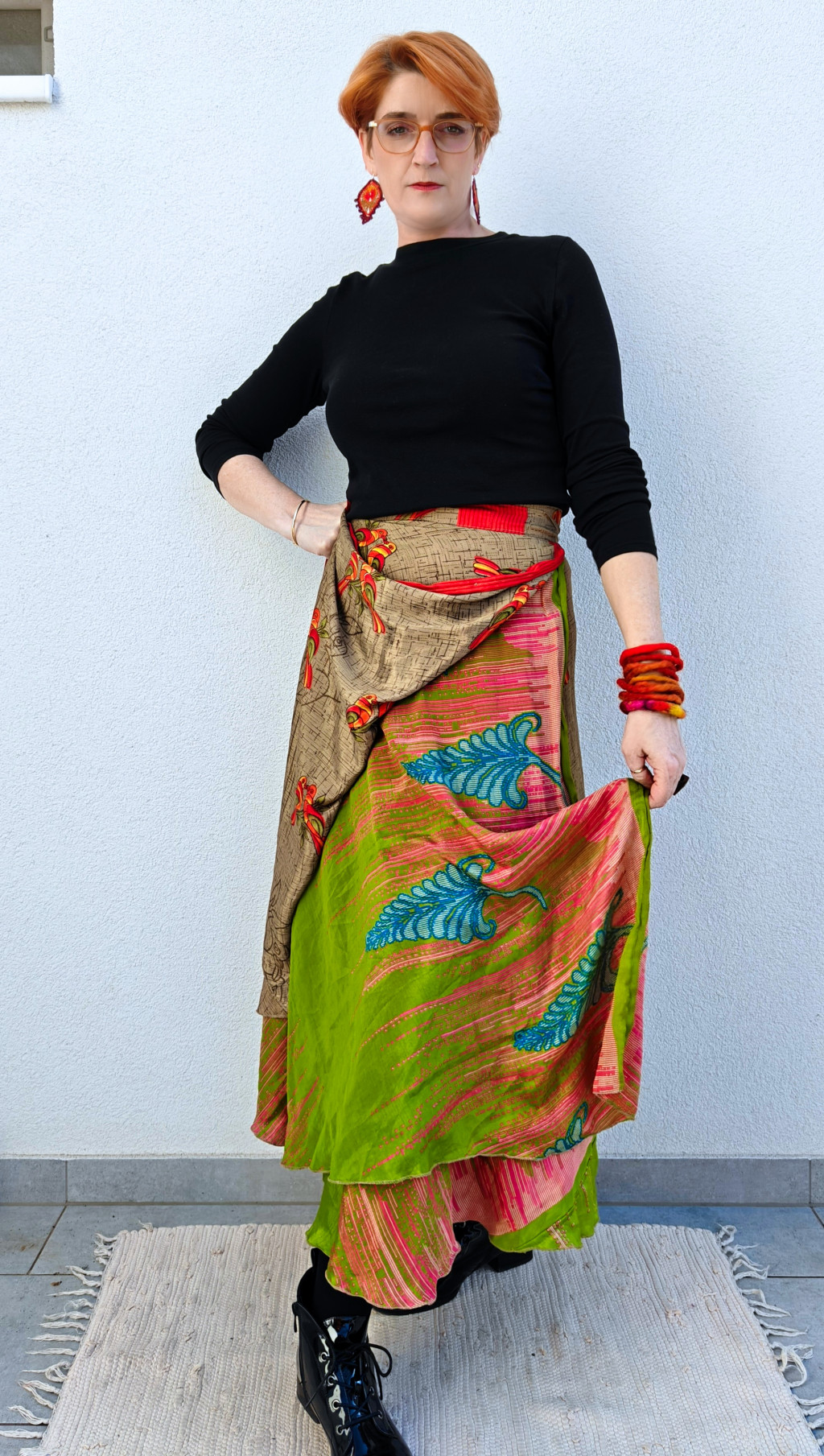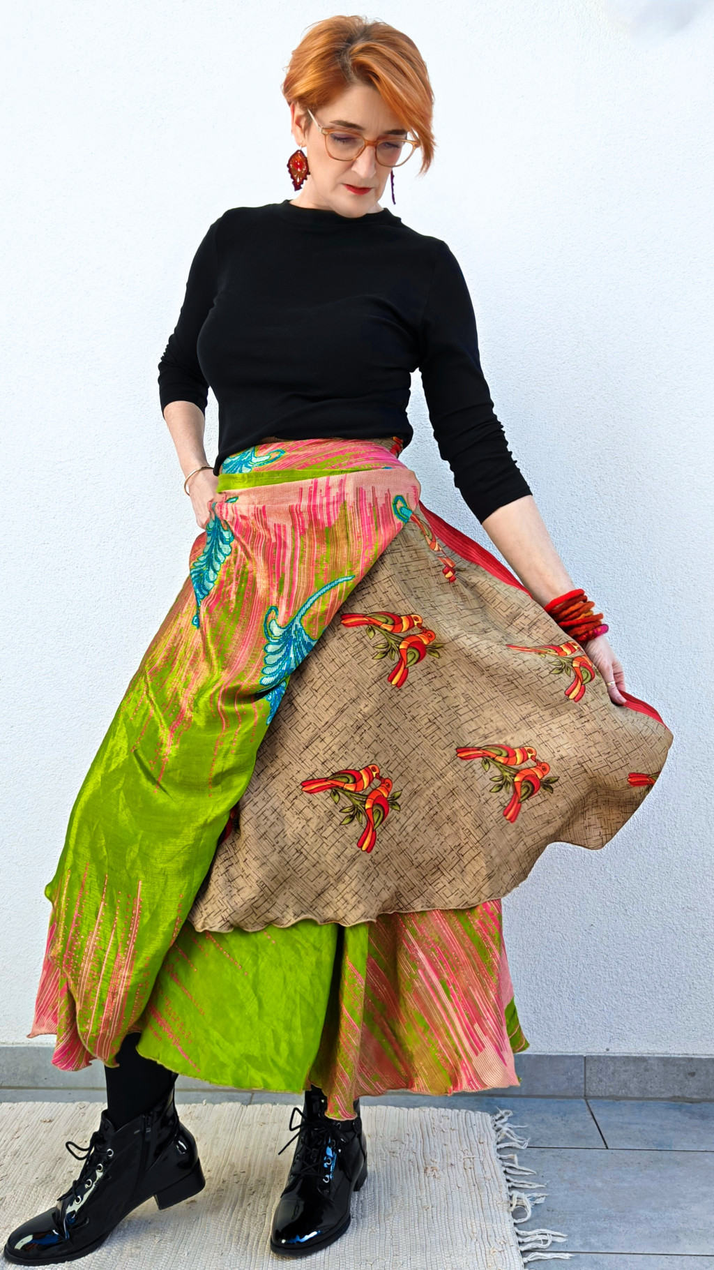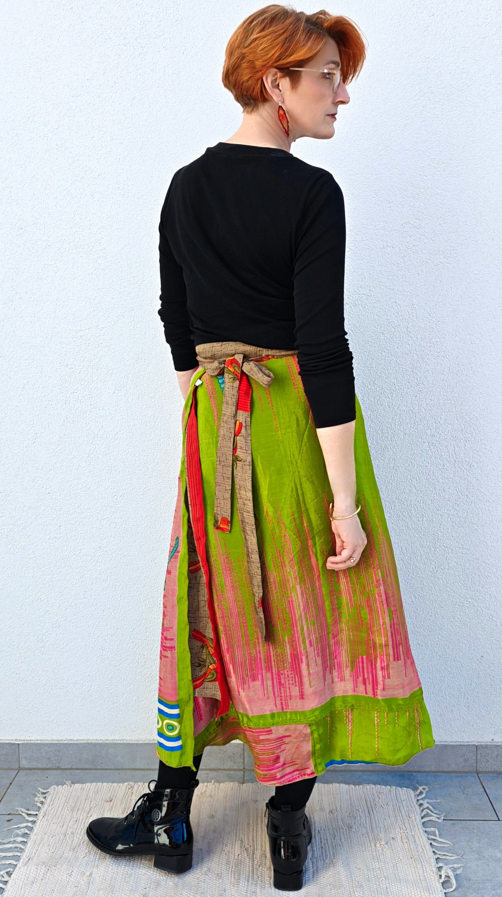 Lapszoknyáink újrahasznosított szárikból készülnek Indiában, egy hosszabb és egy rövidebb anyag derékban összevarrva! Két oldalú, kifordítható, mindkét oldala hordható, sokféleképpen köthető, variálható. Szoknyáinkból nincs két egyforma, mindegyikből csak EGY darab van, ha megtetszik, csapj le rá!