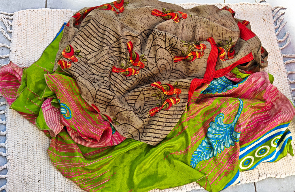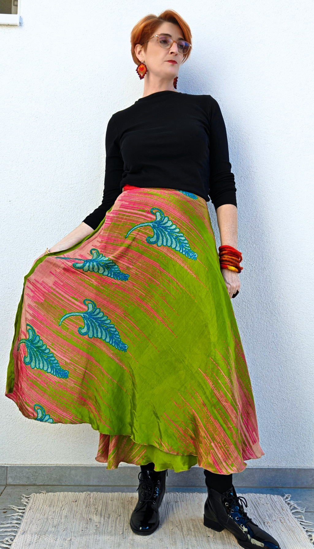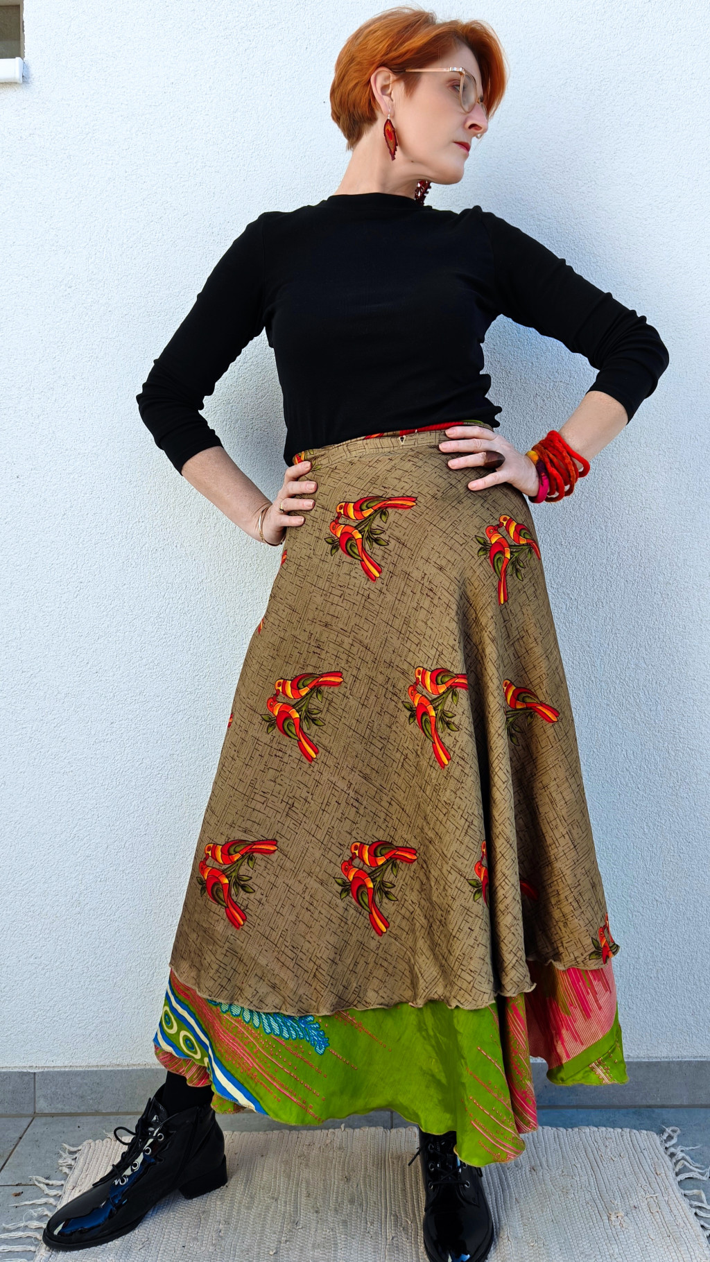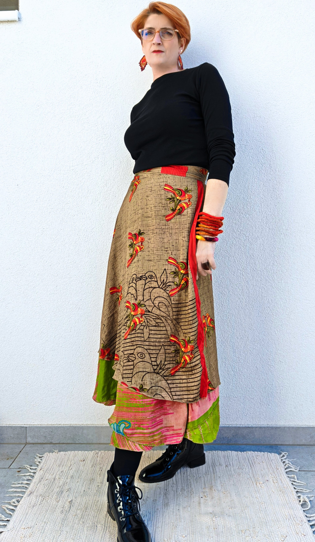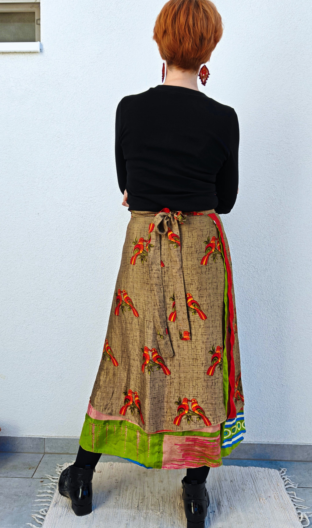 Lapszoknyáink újrahasznosított szárikból készülnek Indiában, egy hosszabb és egy rövidebb anyag derékban összevarrva! Két oldalú, kifordítható, mindkét oldala hordható, sokféleképpen köthető, variálható. Szoknyáinkból nincs két egyforma, mindegyikből csak EGY darab van, ha megtetszik, csapj le rá!