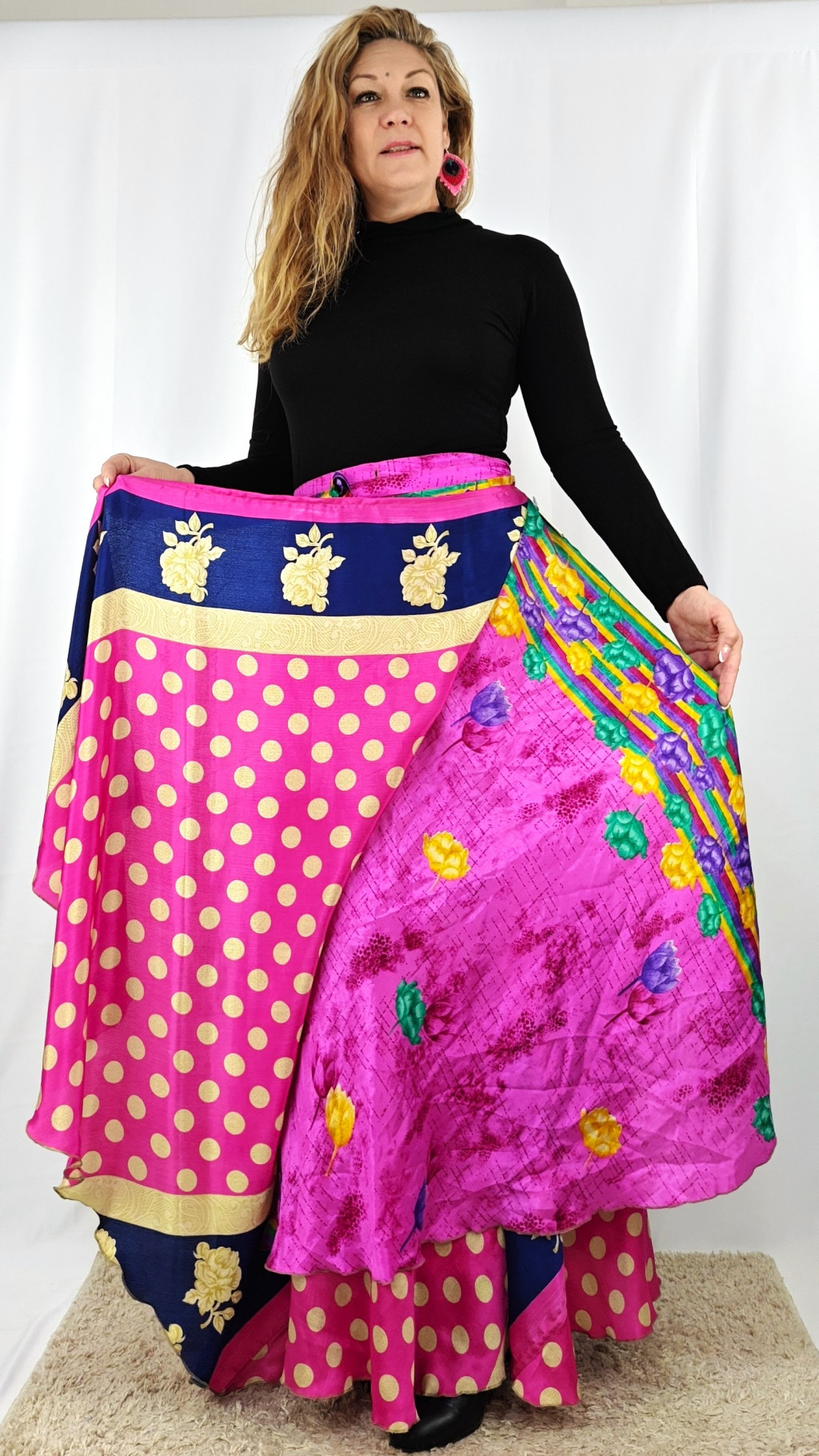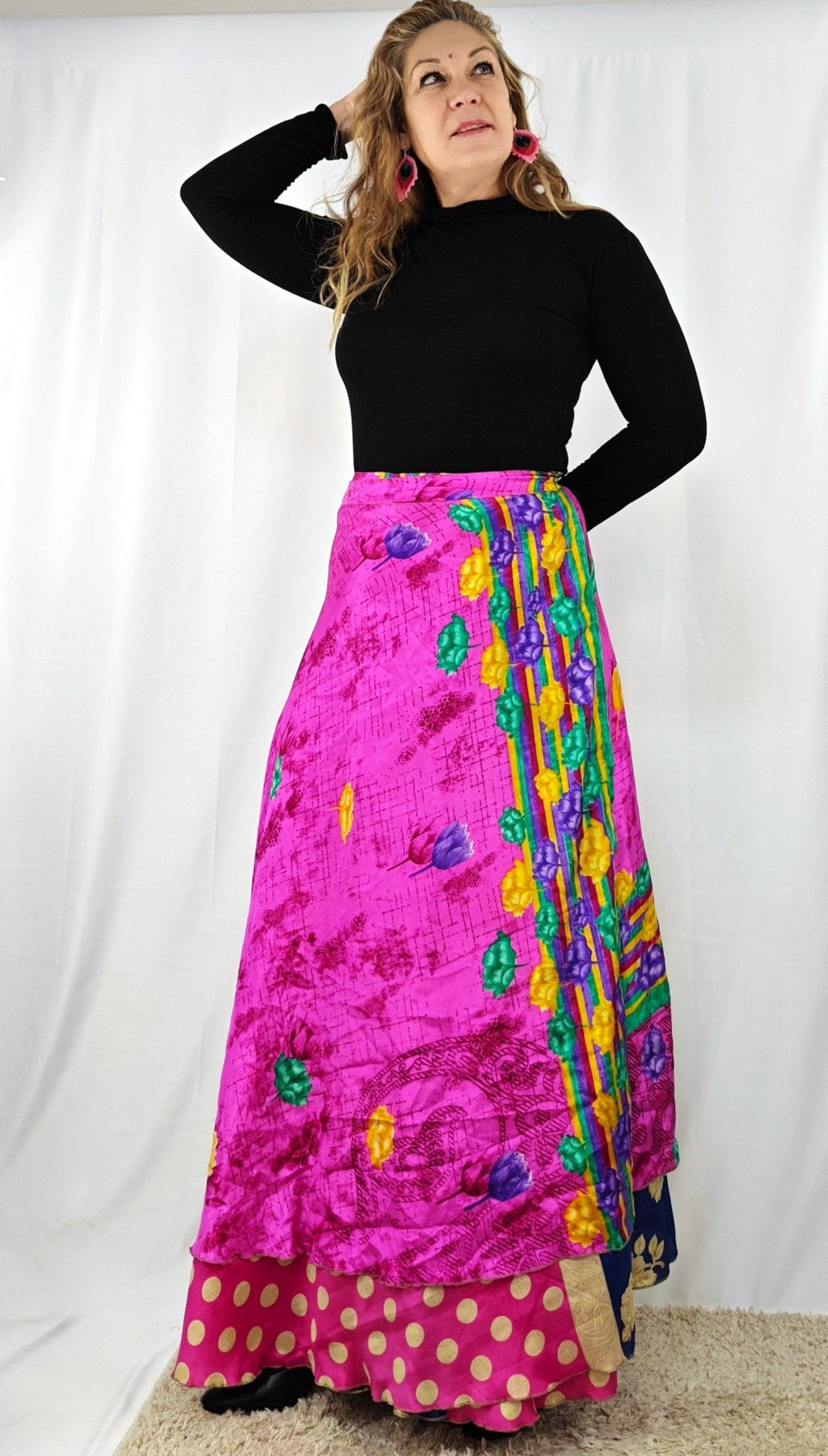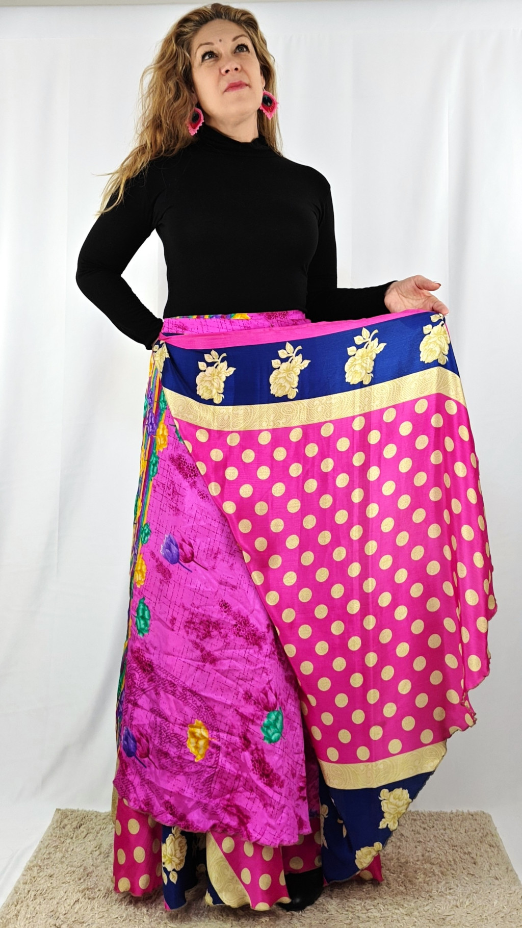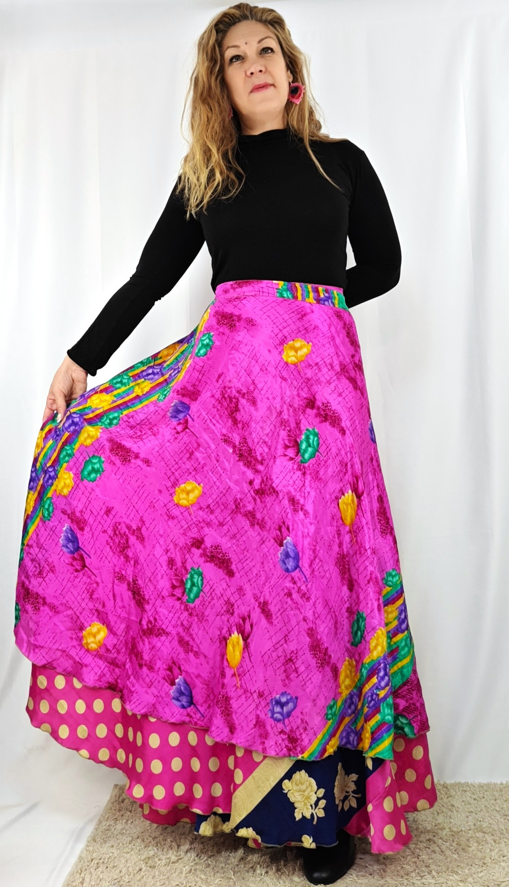 Lapszoknyáink újrahasznosított szárikból készülnek Indiában, egy hosszabb és egy rövidebb anyag derékban összevarrva! Két oldalú, kifordítható, mindkét oldala hordható, sokféleképpen köthető, variálható. Szoknyáinkból nincs két egyforma, mindegyikből csak EGY darab van, ha megtetszik, csapj le rá!