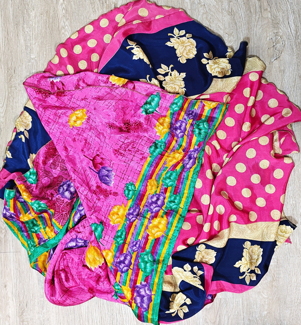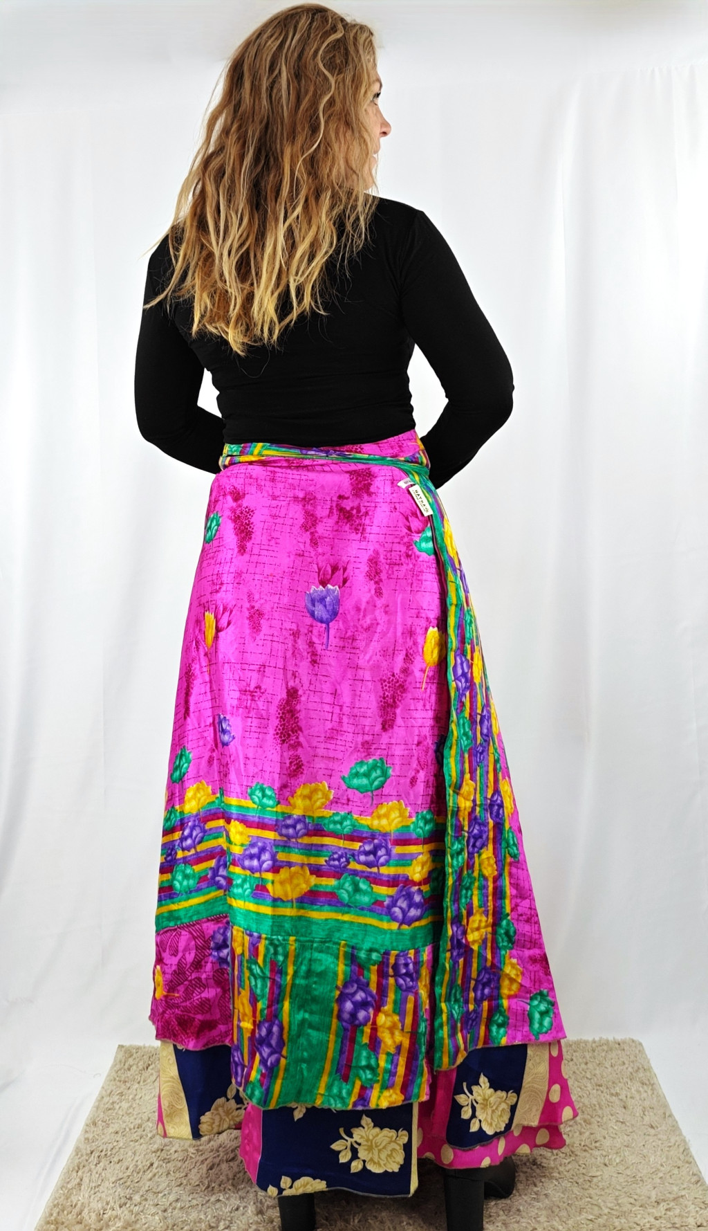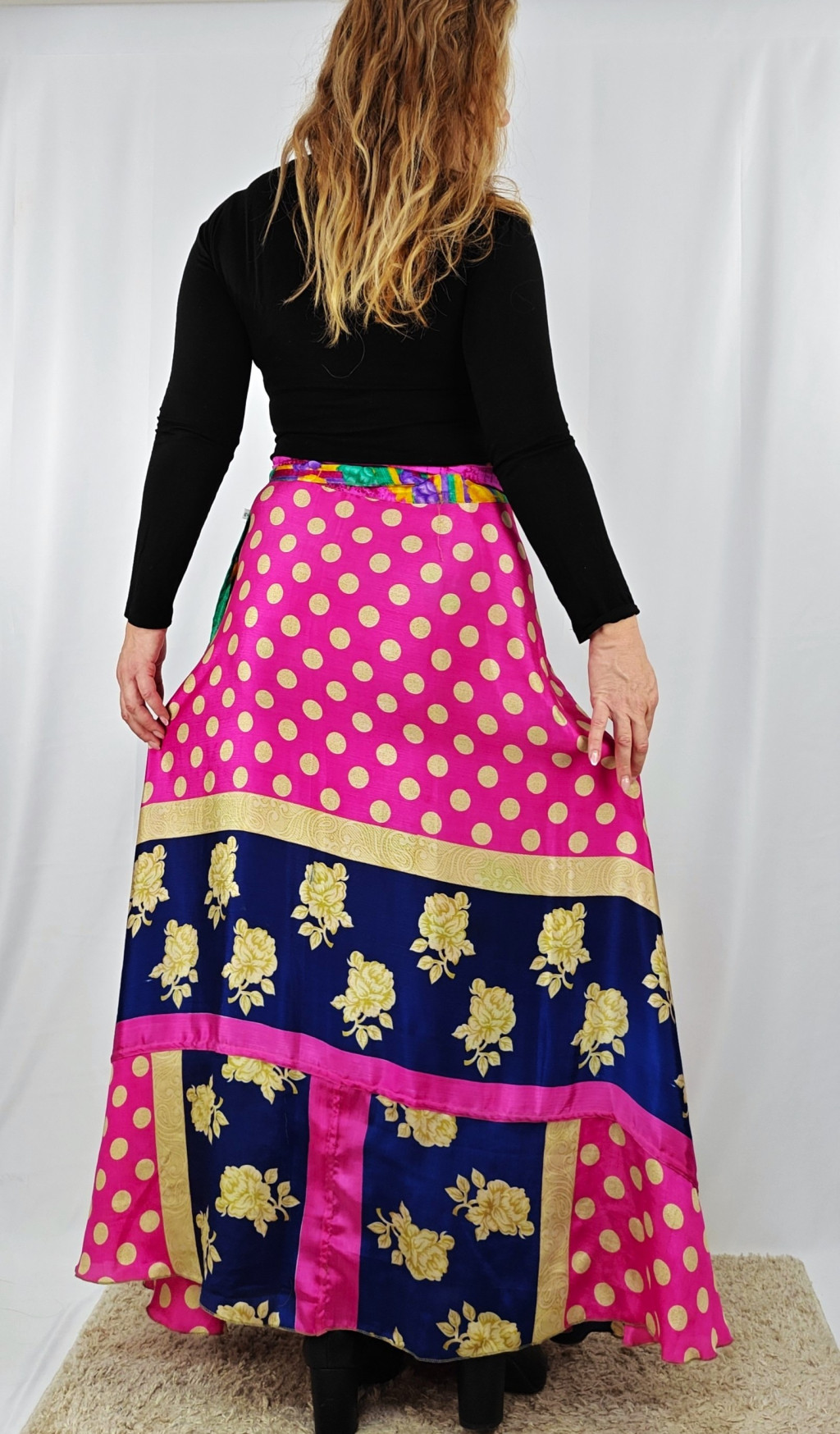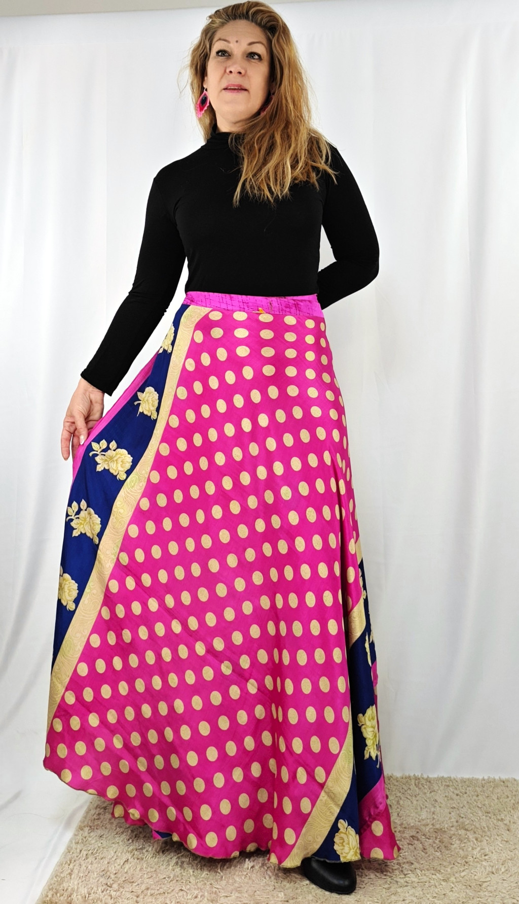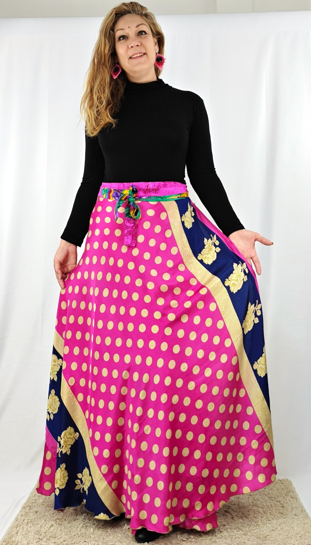 Lapszoknyáink újrahasznosított szárikból készülnek Indiában, egy hosszabb és egy rövidebb anyag derékban összevarrva! Két oldalú, kifordítható, mindkét oldala hordható, sokféleképpen köthető, variálható. Szoknyáinkból nincs két egyforma, mindegyikből csak EGY darab van, ha megtetszik, csapj le rá!