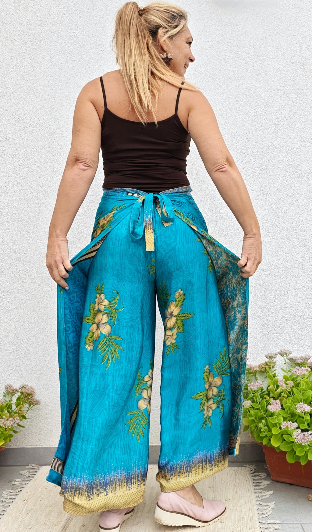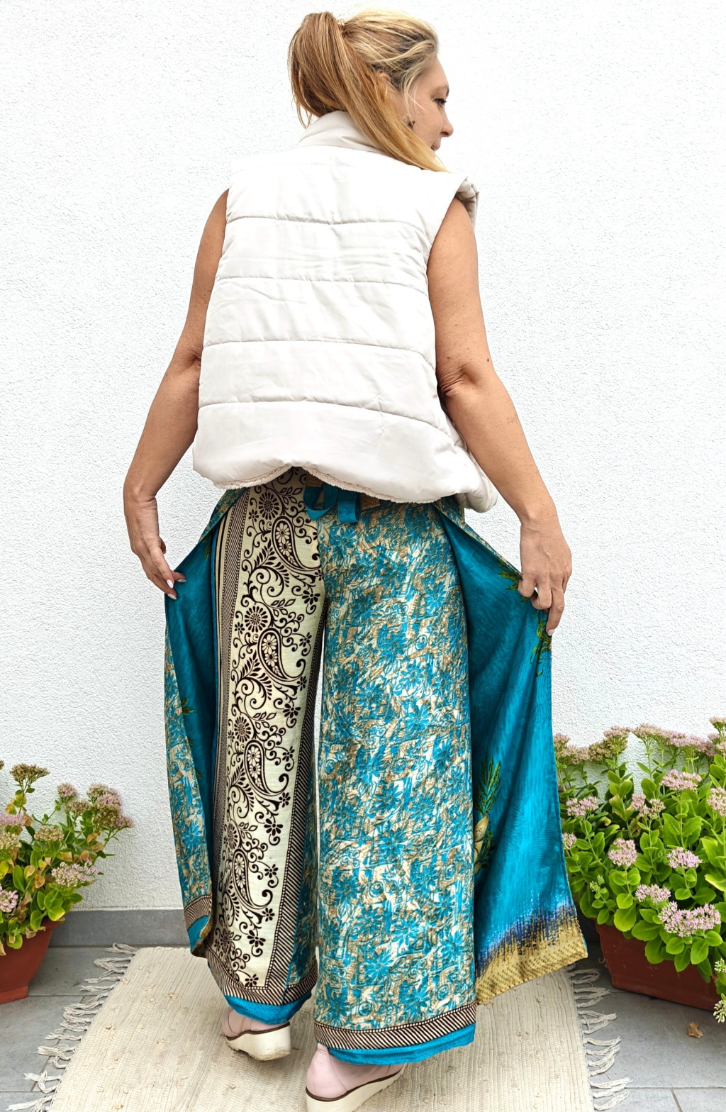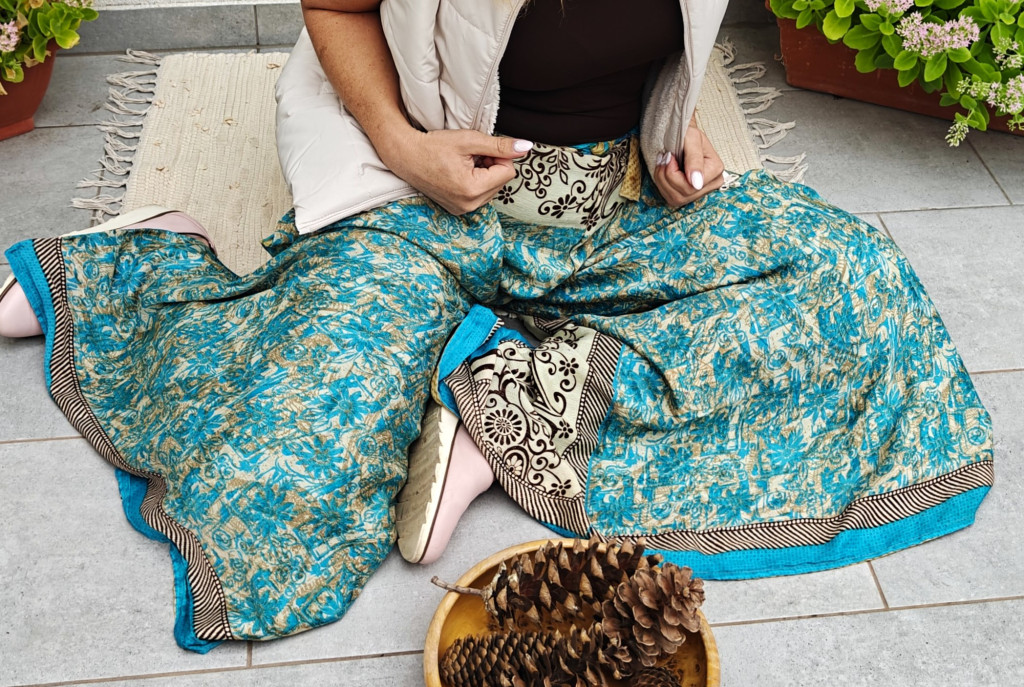 Lapnadrágjaink újrahasznosított szárikból készülnek Indiában. Két különböző csodás anyagot varrnak össze, így a külső és belső fele is hordható!