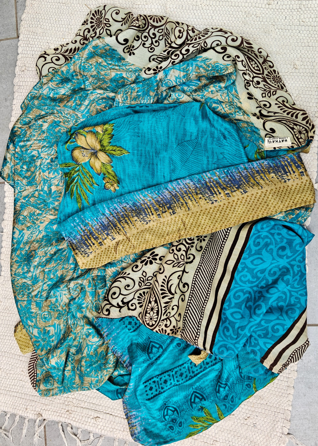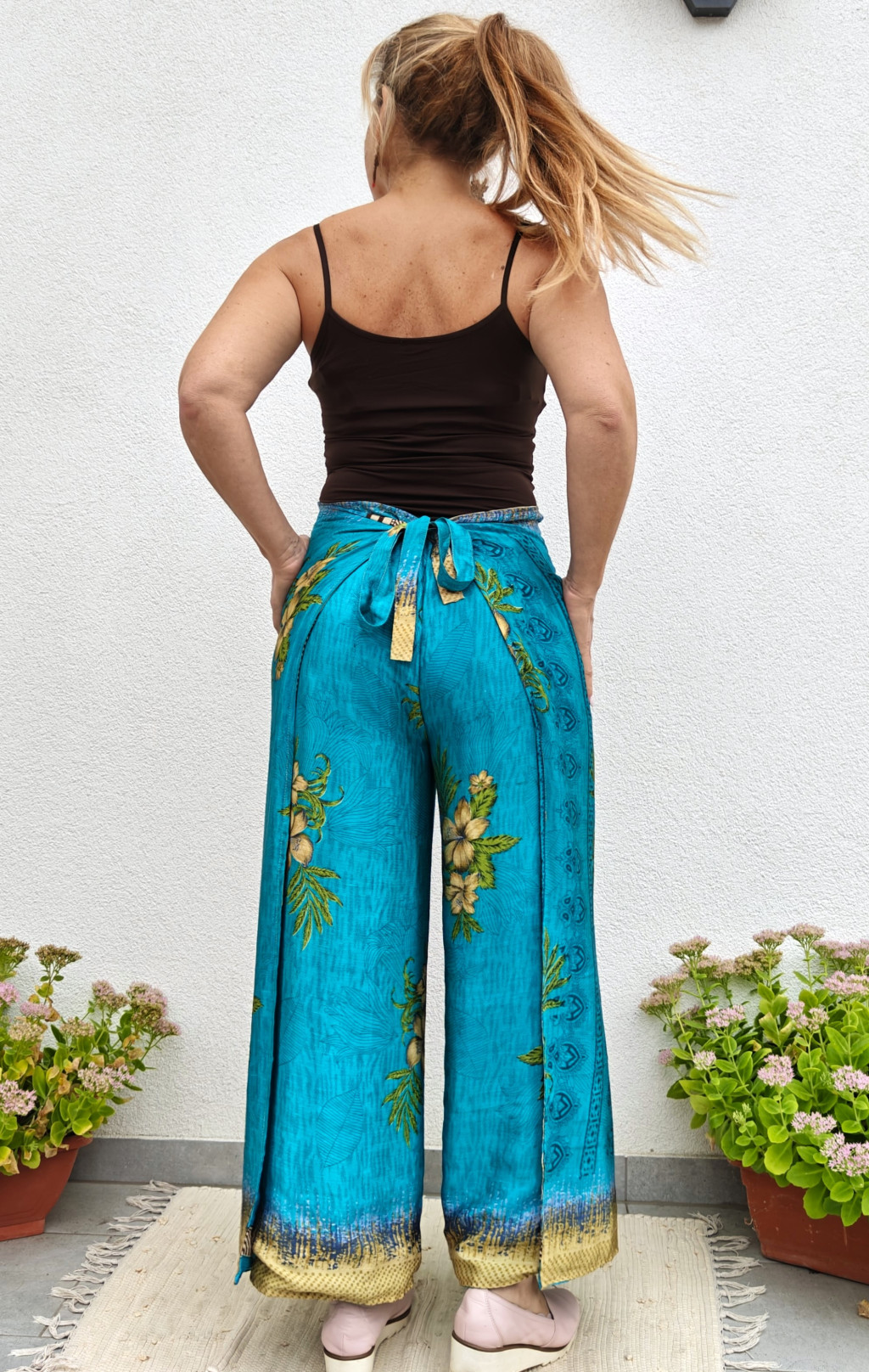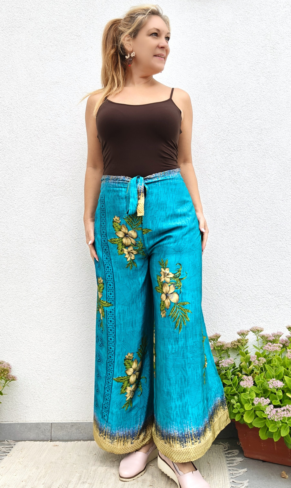 Lapnadrágjaink újrahasznosított szárikból készülnek Indiában. Két különböző csodás anyagot varrnak össze, így a külső és belső fele is hordható!