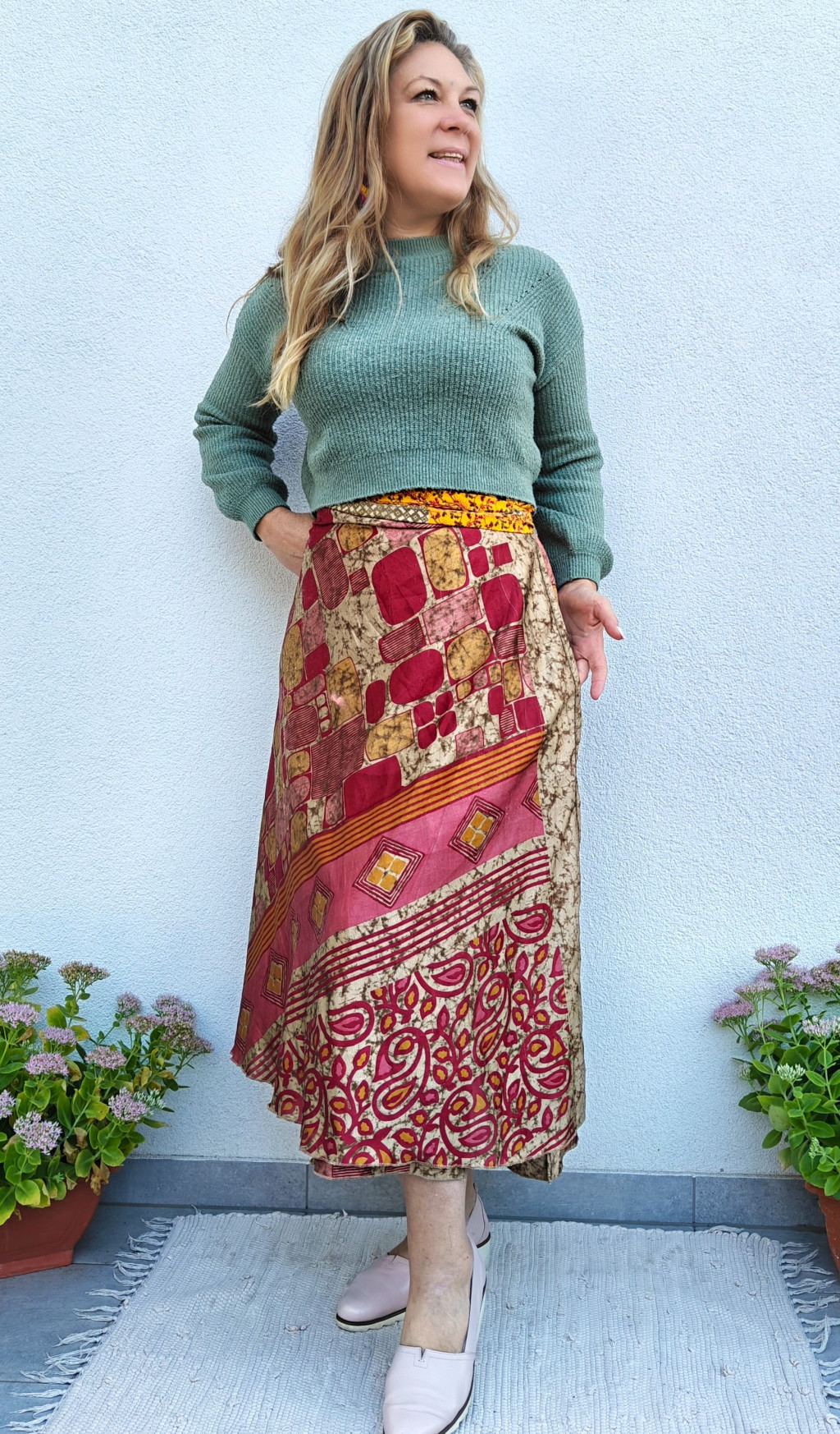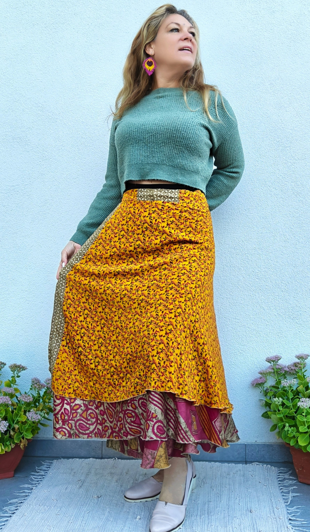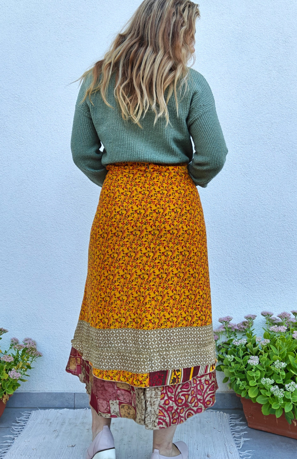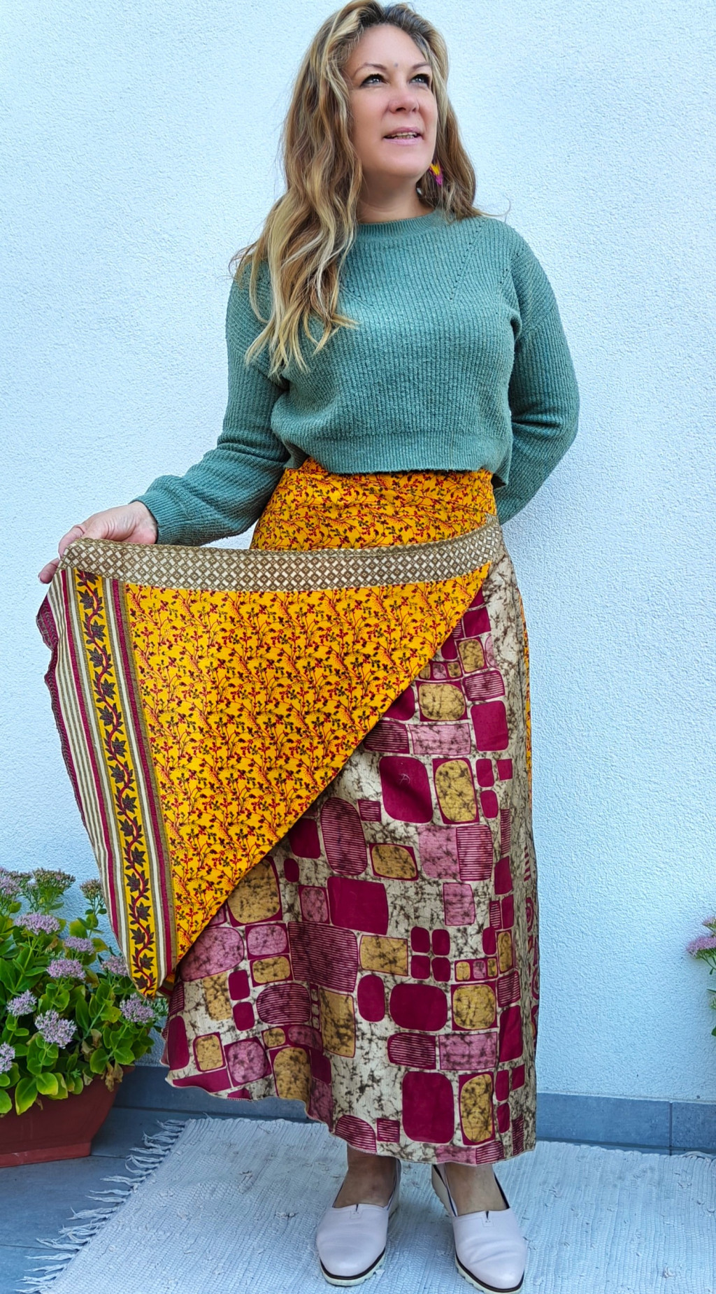 Lapszoknyáink újrahasznosított szárikból készülnek Indiában, egy hosszabb és egy rövidebb anyag derékban összevarrva! Két oldalú, kifordítható, mindkét oldala hordható, sokféleképpen köthető, variálható. Szoknyáinkból nincs két egyforma, mindegyikből csak EGY darab van, ha megtetszik, csapj le rá!