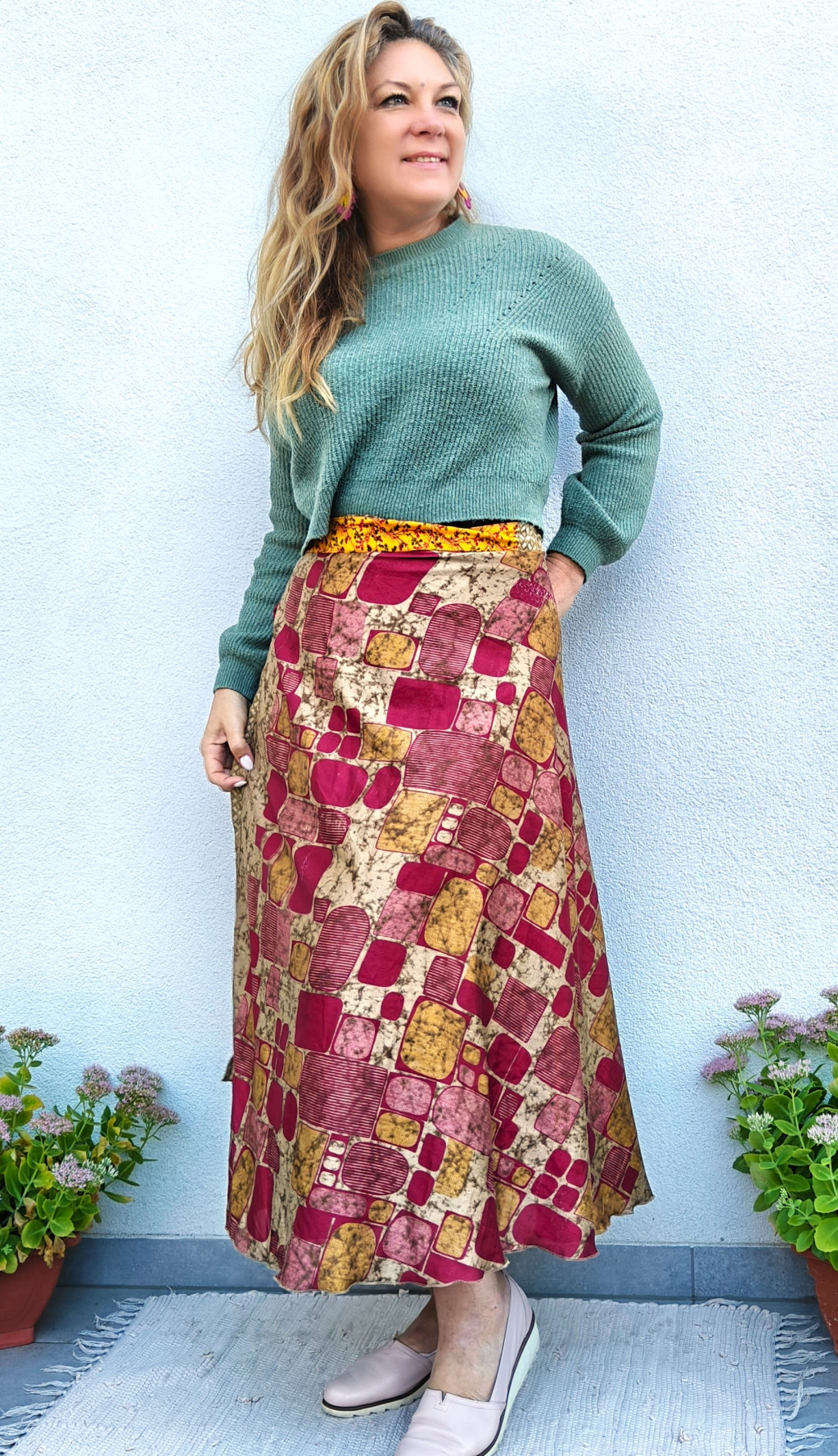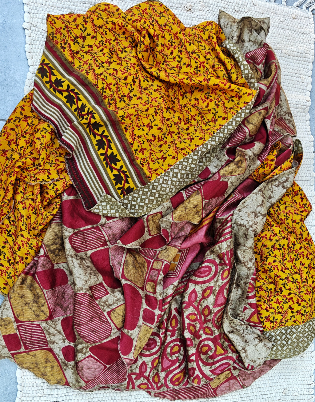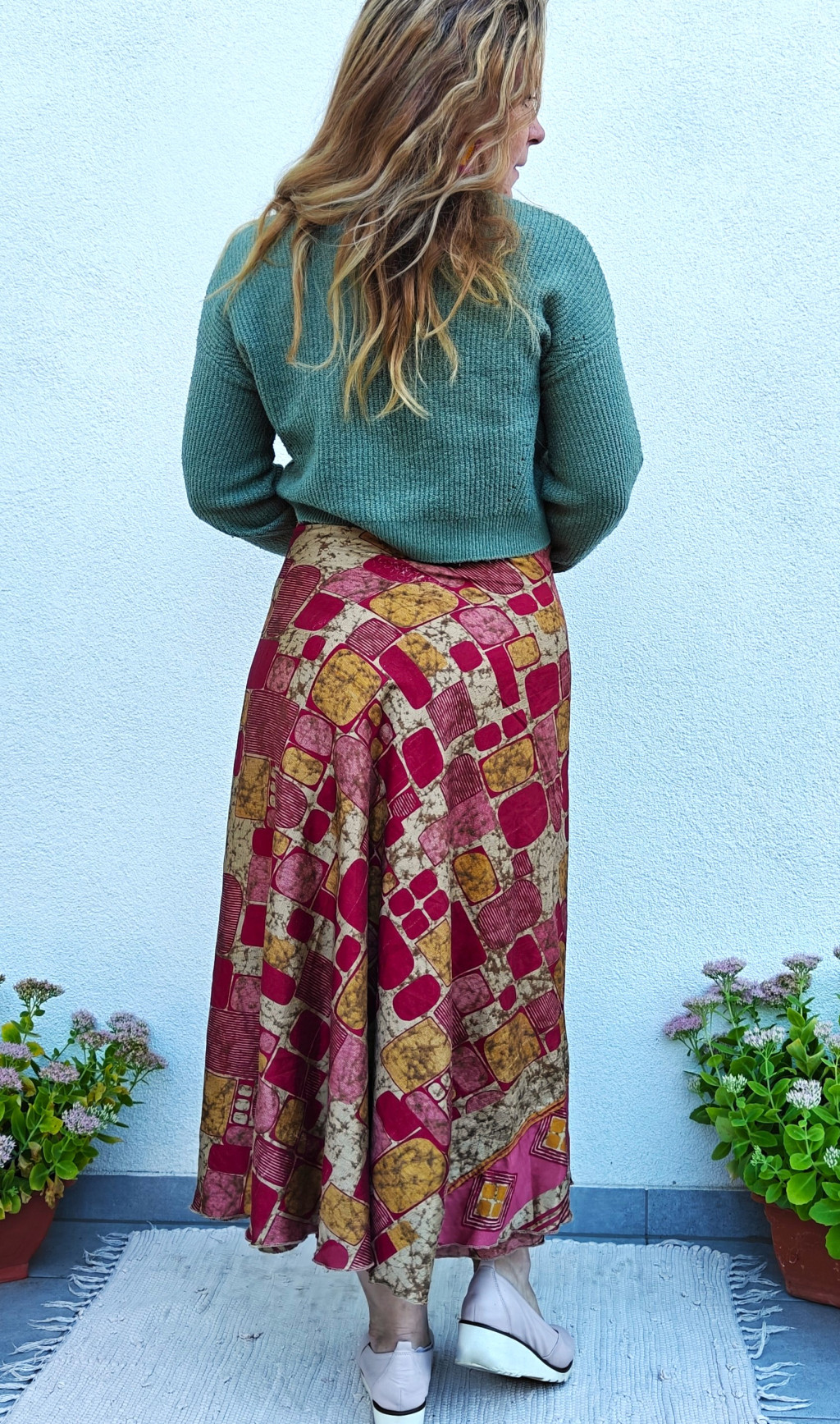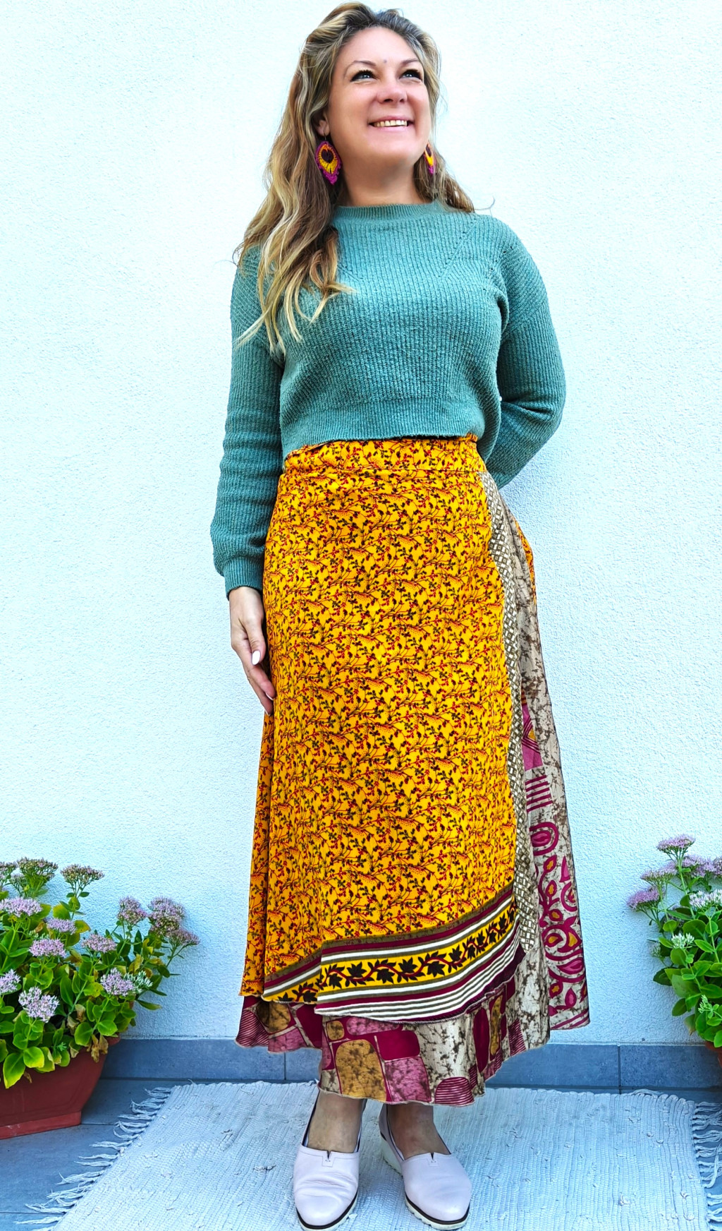 Lapszoknyáink újrahasznosított szárikból készülnek Indiában, egy hosszabb és egy rövidebb anyag derékban összevarrva! Két oldalú, kifordítható, mindkét oldala hordható, sokféleképpen köthető, variálható. Szoknyáinkból nincs két egyforma, mindegyikből csak EGY darab van, ha megtetszik, csapj le rá!