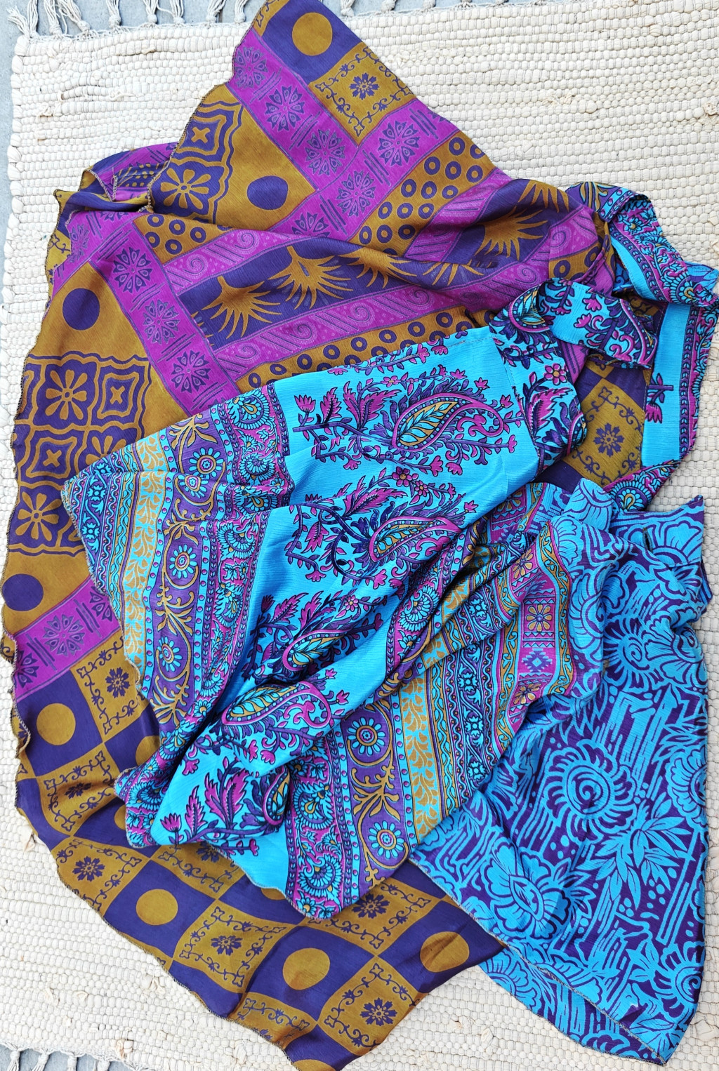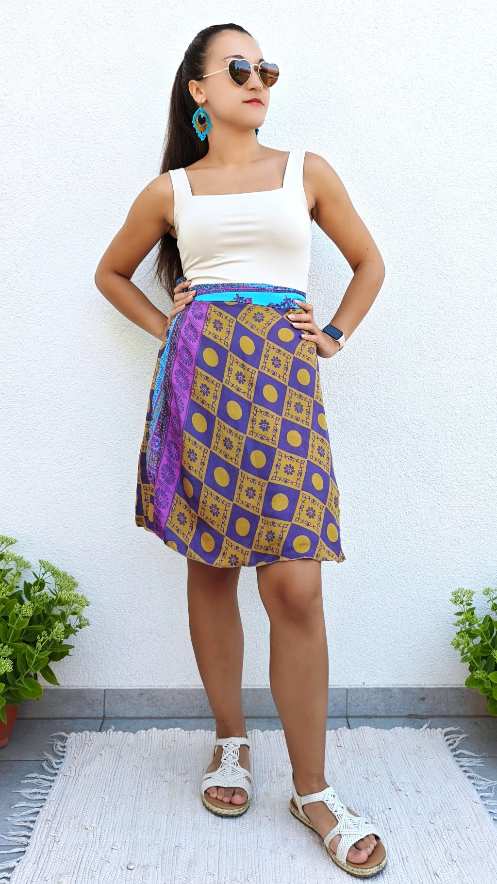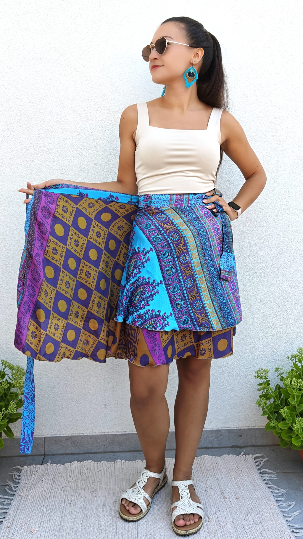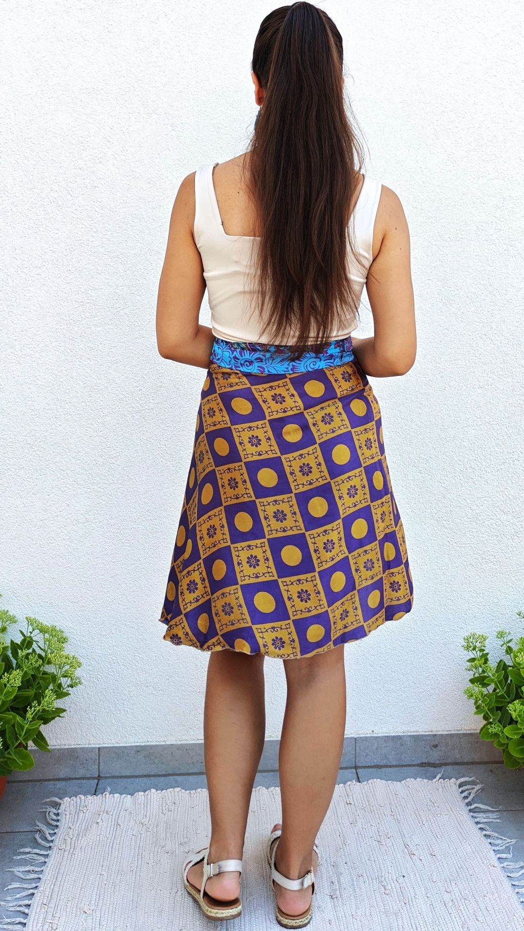 Lapszoknyáink újrahasznosított szárikból készülnek Indiában, egy hosszabb és egy rövidebb anyag derékban összevarrva! Két oldalú, kifordítható, mindkét oldala hordható, sokféleképpen köthető, variálható. Szoknyáinkból nincs két egyforma, mindegyikből csak EGY darab van, ha megtetszik, csapj le rá!