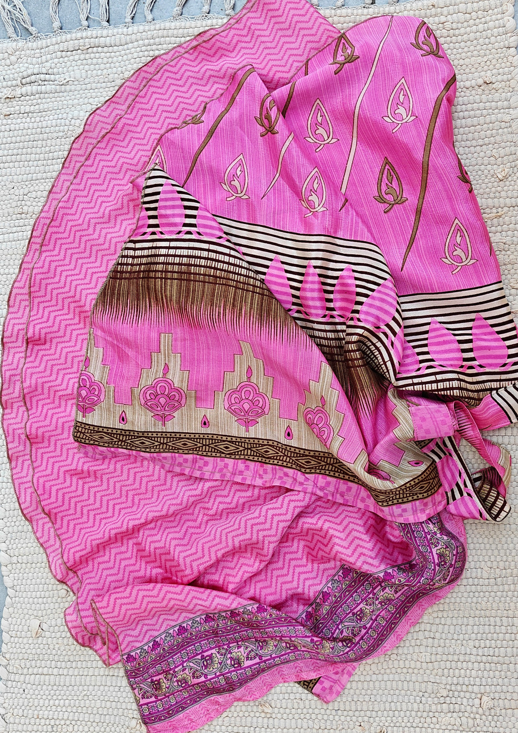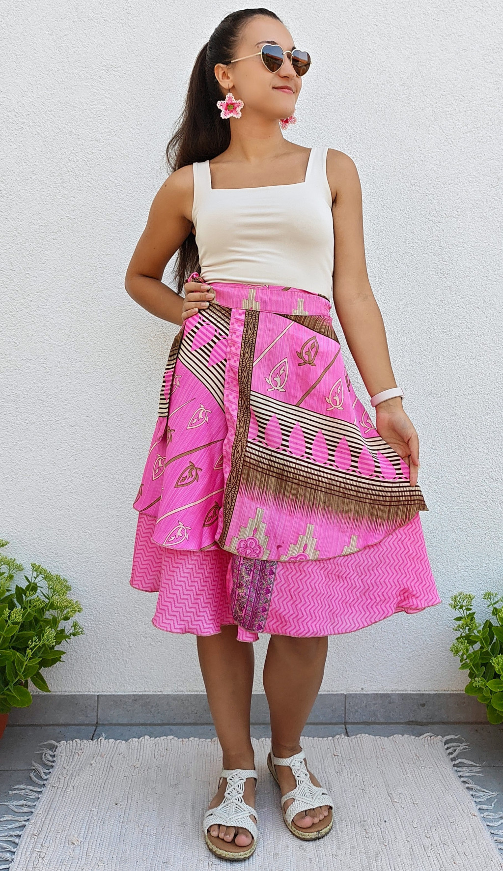Lapszoknyáink újrahasznosított szárikból készülnek Indiában, egy hosszabb és egy rövidebb anyag derékban összevarrva! Két oldalú, kifordítható, mindkét oldala hordható, sokféleképpen köthető, variálható. Szoknyáinkból nincs két egyforma, mindegyikből csak EGY darab van, ha megtetszik, csapj le rá!