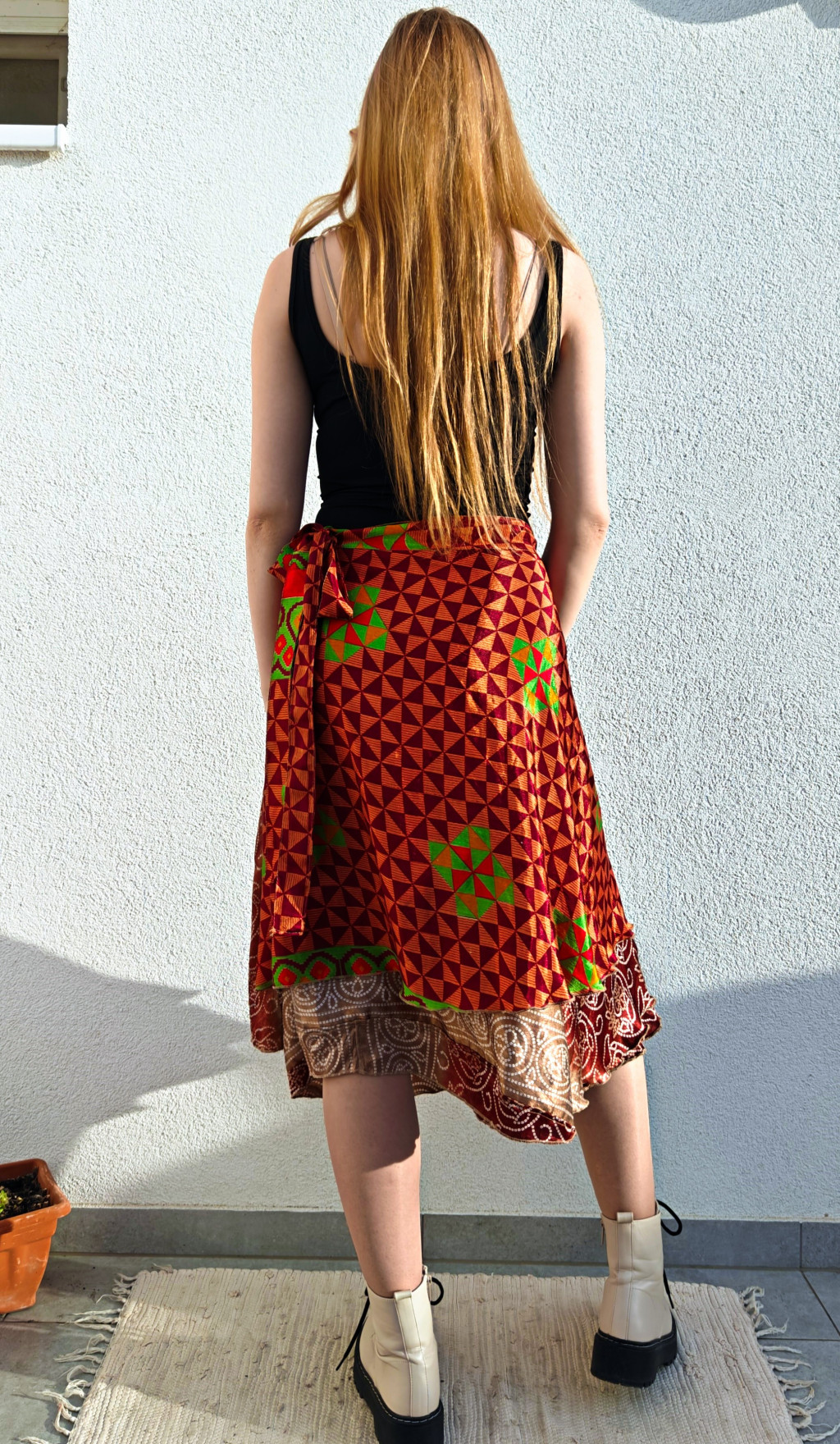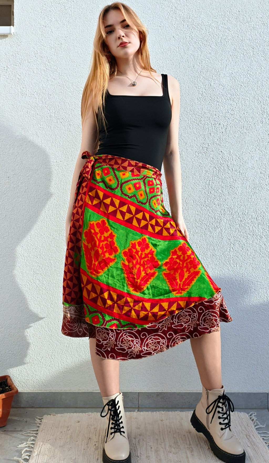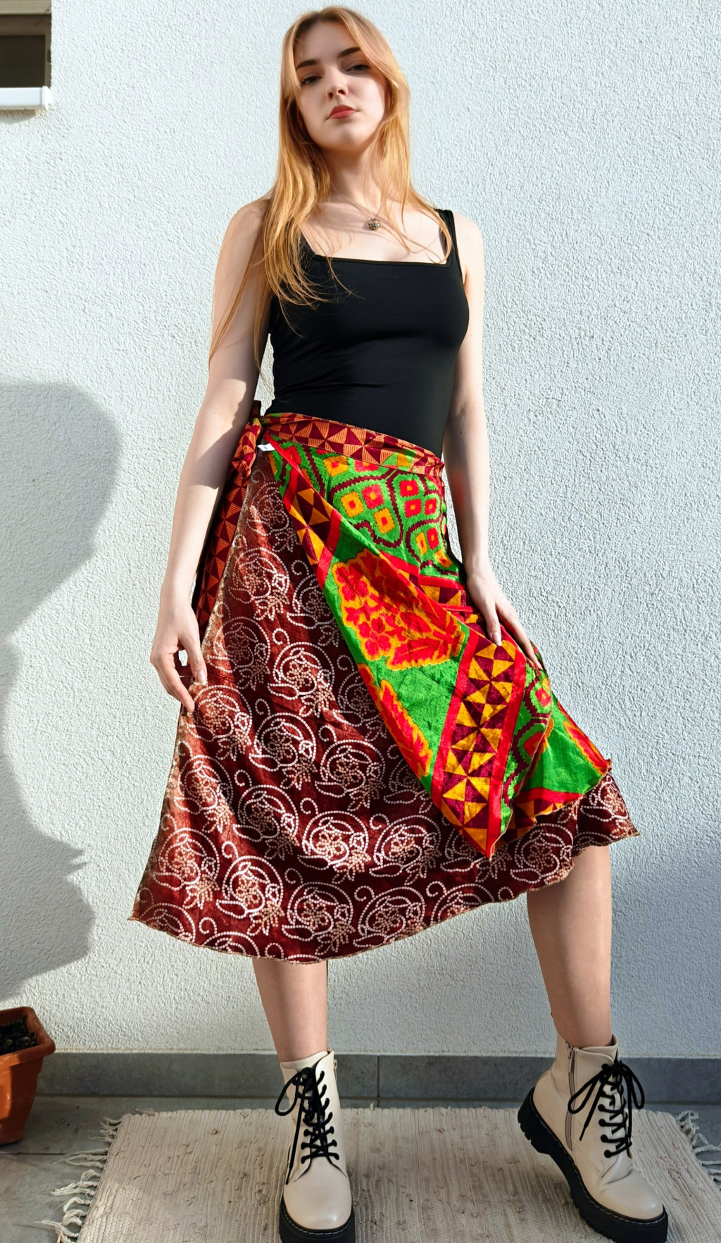 Lapszoknyáink újrahasznosított szárikból készülnek Indiában, egy hosszabb és egy rövidebb anyag derékban összevarrva! Két oldalú, kifordítható, mindkét oldala hordható, sokféleképpen köthető, variálható. Szoknyáinkból nincs két egyforma, mindegyikből csak EGY darab van, ha megtetszik, csapj le rá!