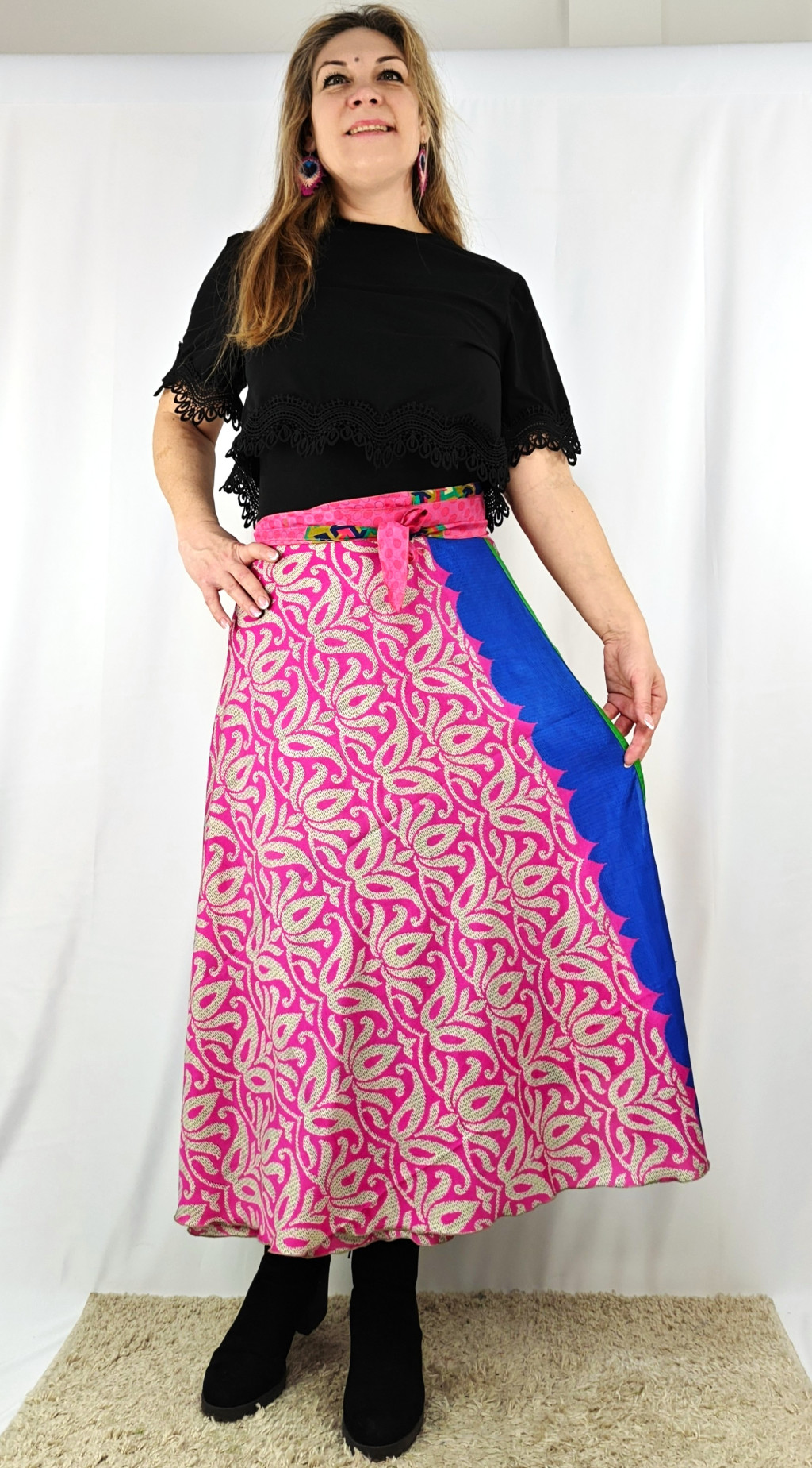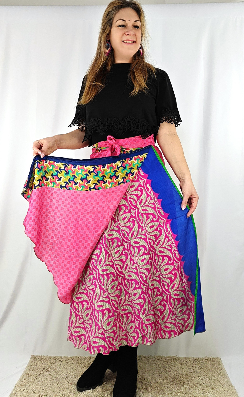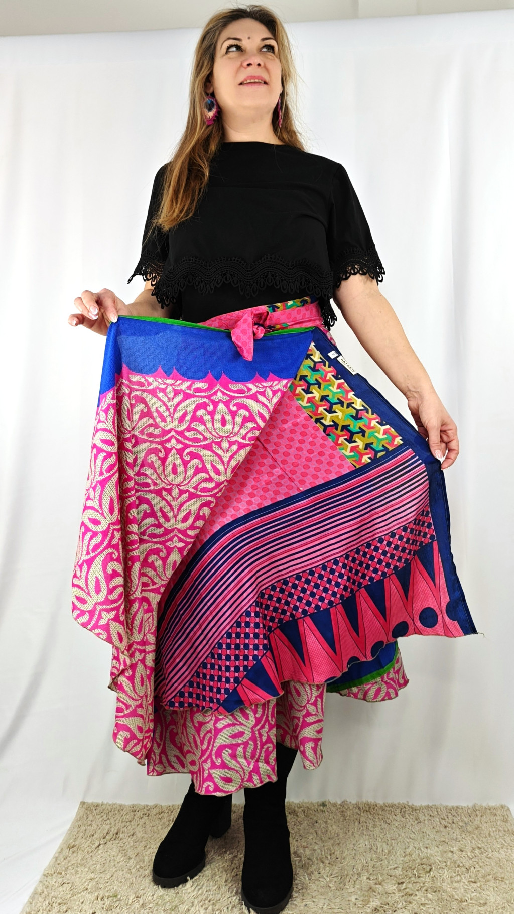 Lapszoknyáink újrahasznosított szárikból készülnek Indiában, egy hosszabb és egy rövidebb anyag derékban összevarrva! Két oldalú, kifordítható, mindkét oldala hordható, sokféleképpen köthető, variálható. Szoknyáinkból nincs két egyforma, mindegyikből csak EGY darab van, ha megtetszik, csapj le rá!