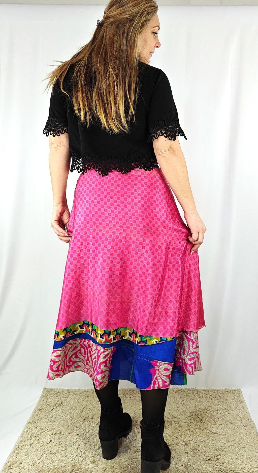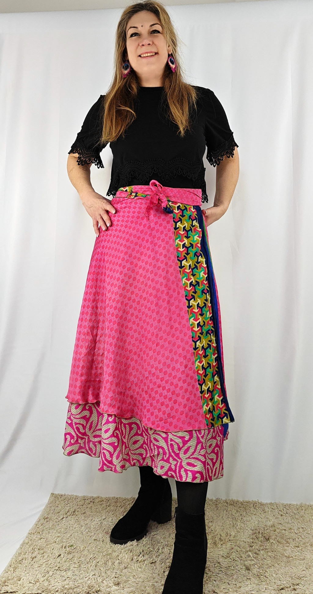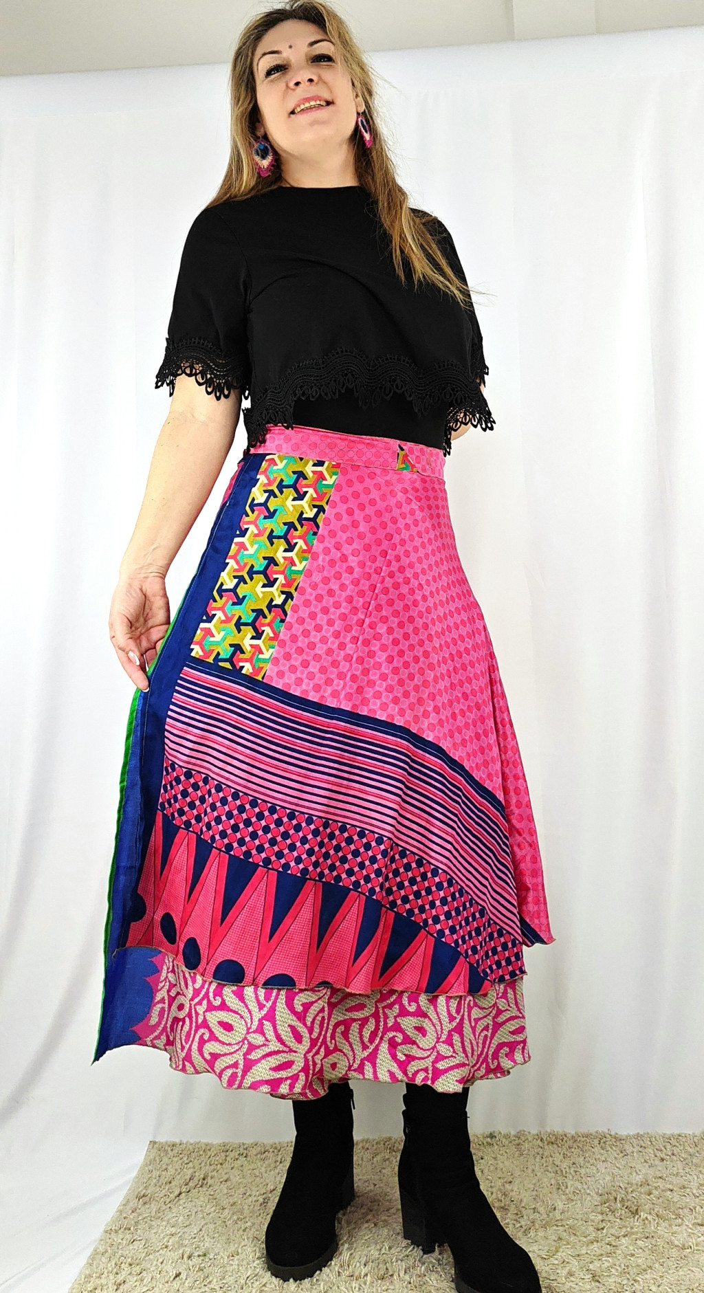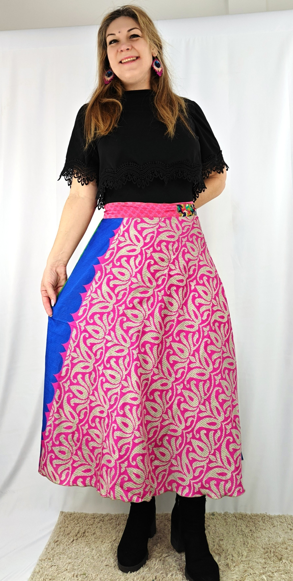 Lapszoknyáink újrahasznosított szárikból készülnek Indiában, egy hosszabb és egy rövidebb anyag derékban összevarrva! Két oldalú, kifordítható, mindkét oldala hordható, sokféleképpen köthető, variálható. Szoknyáinkból nincs két egyforma, mindegyikből csak EGY darab van, ha megtetszik, csapj le rá!