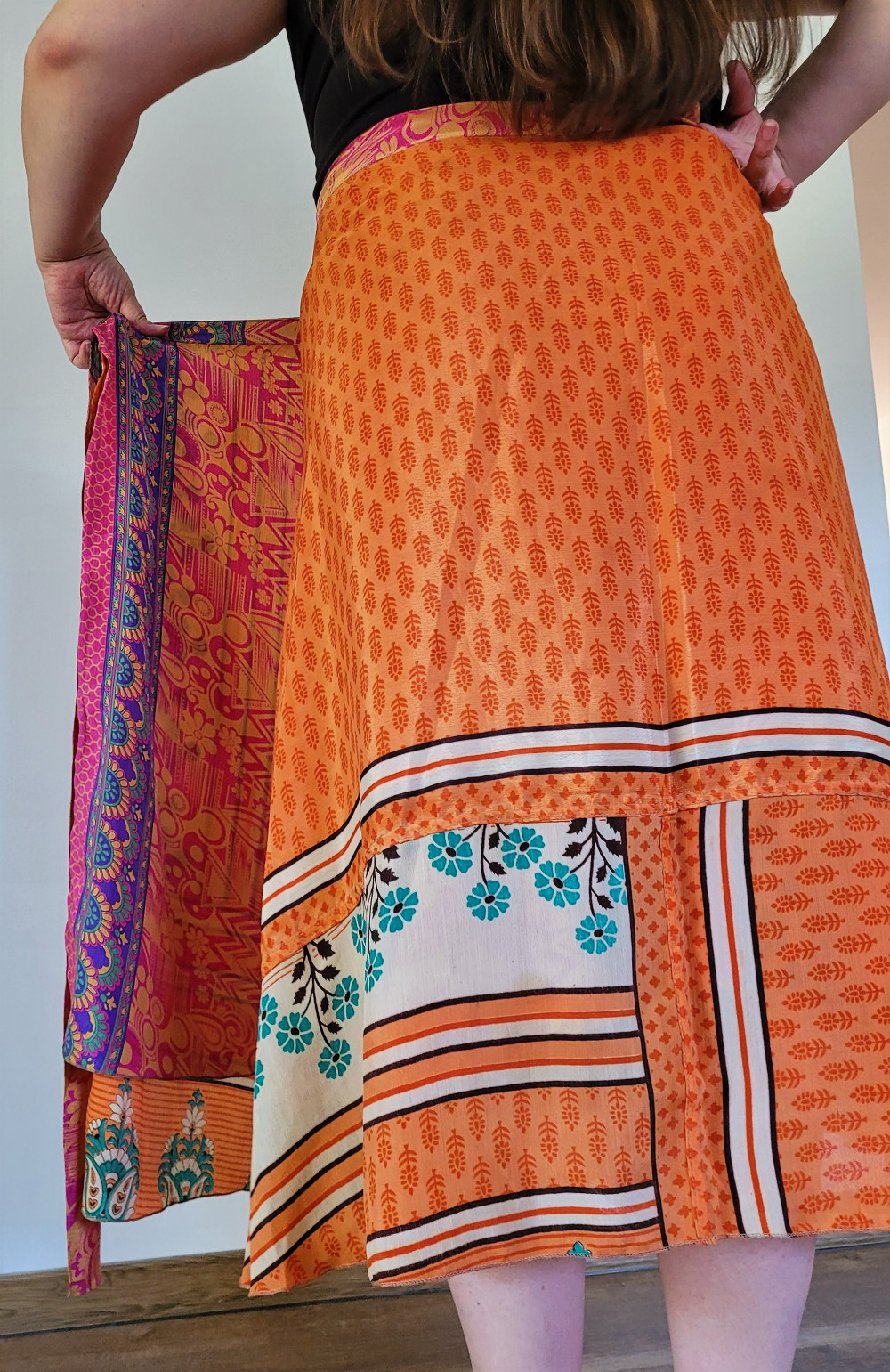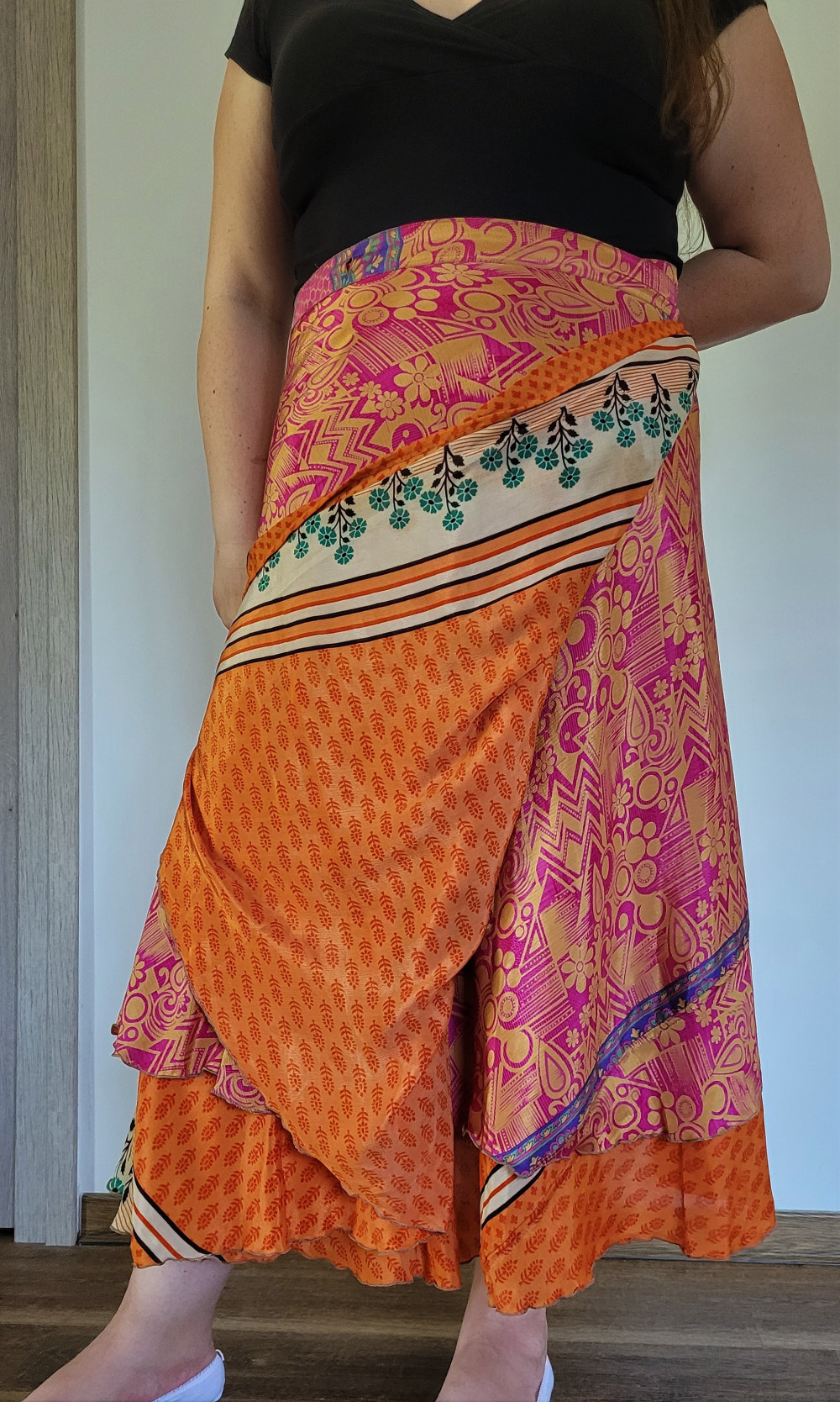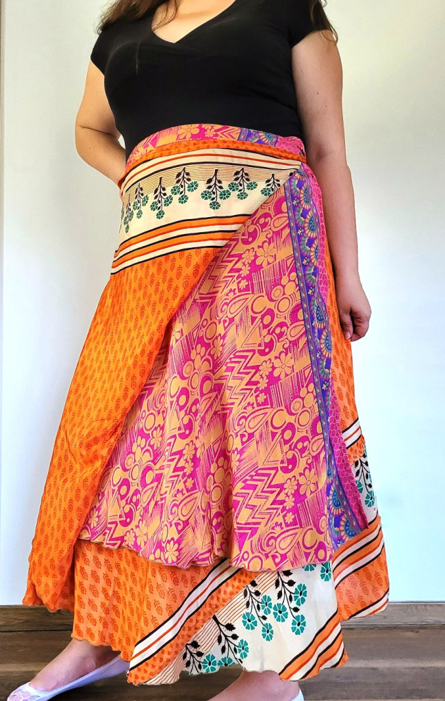 Lapszoknyáink újrahasznosított szárikból készülnek Indiában, egy hosszabb és egy rövidebb anyag derékban összevarrva! Kifordítható, mindkét oldala hordható, sokféleképpen köthető, variálható. Szoknyáinkból nincs két egyforma, mindegyikből csak EGY darab van, ha megtetszik, csapj le rá!