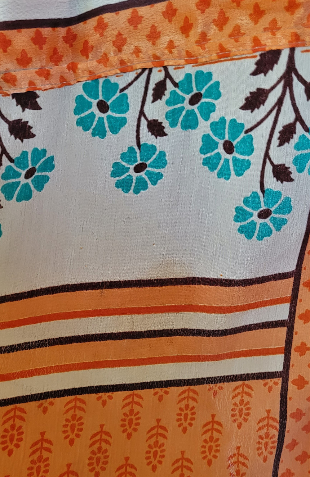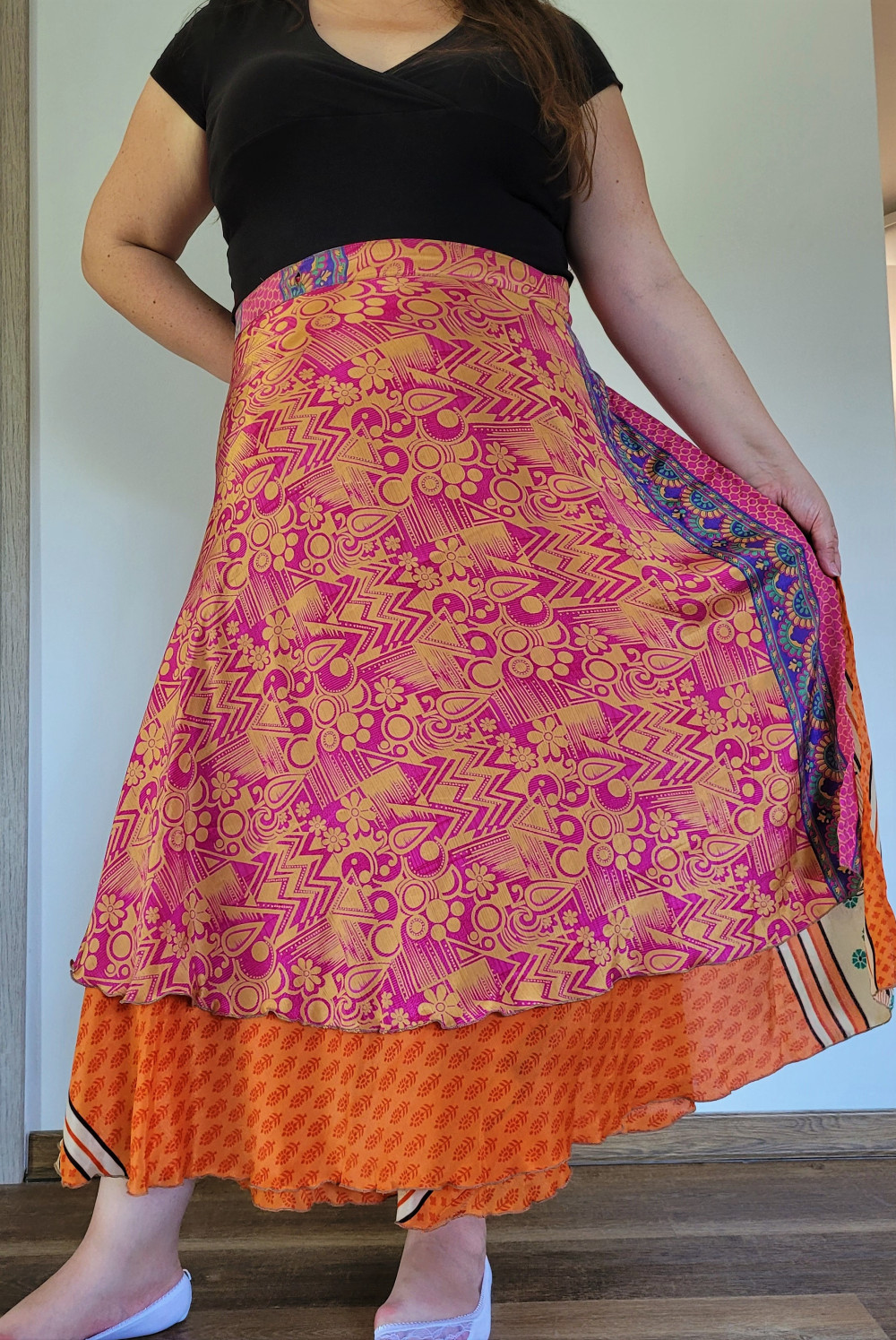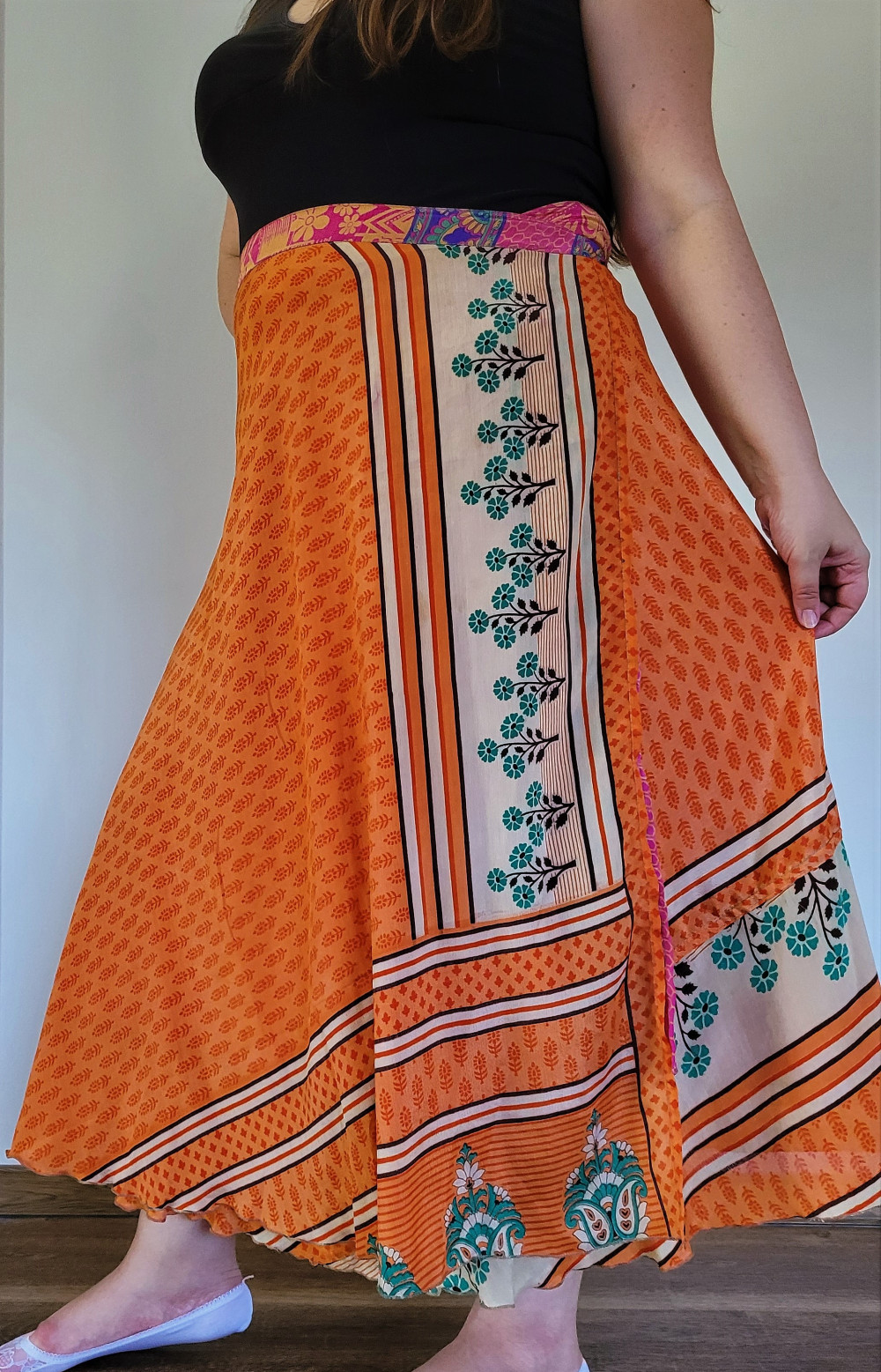 Lapszoknyáink újrahasznosított szárikból készülnek Indiában, egy hosszabb és egy rövidebb anyag derékban összevarrva! Kifordítható, mindkét oldala hordható, sokféleképpen köthető, variálható. Szoknyáinkból nincs két egyforma, mindegyikből csak EGY darab van, ha megtetszik, csapj le rá!