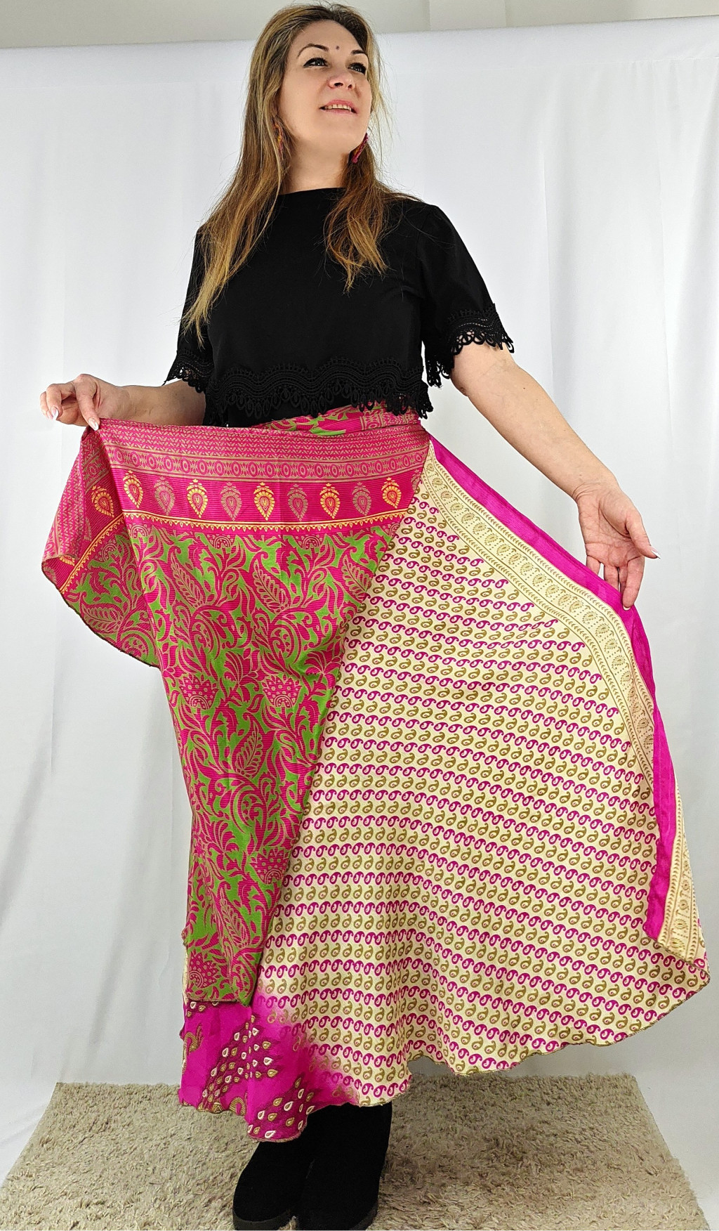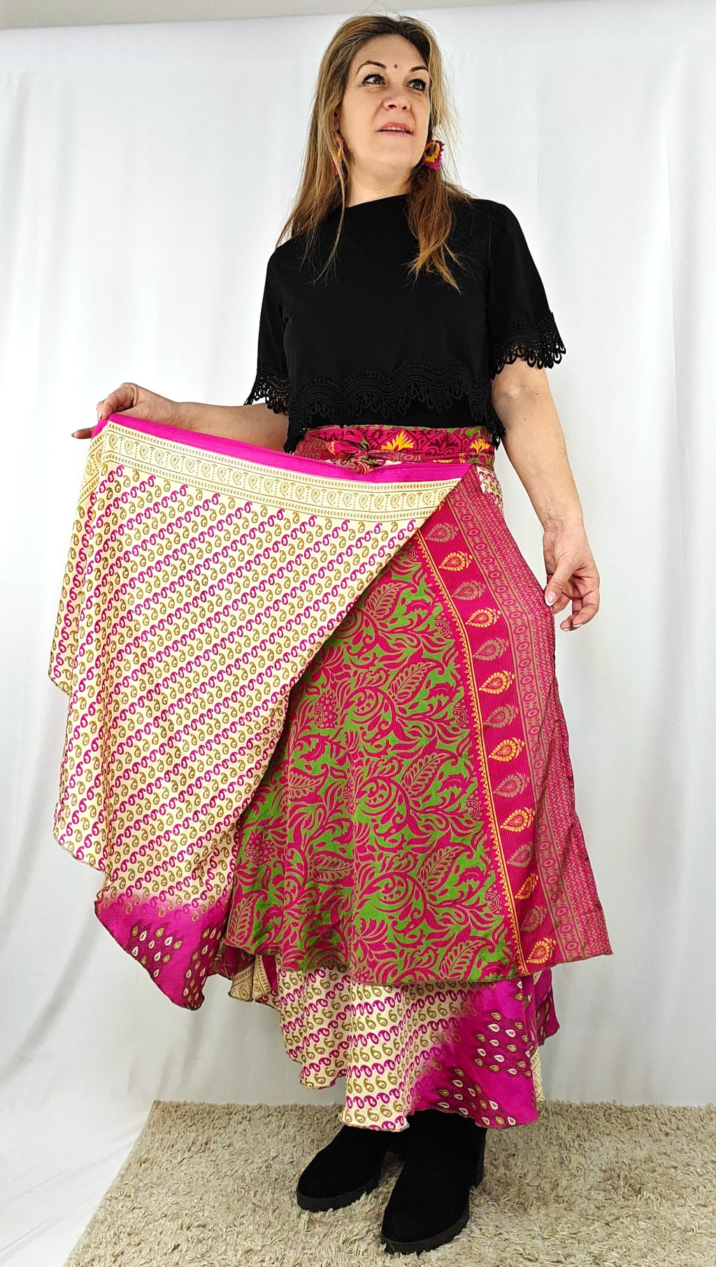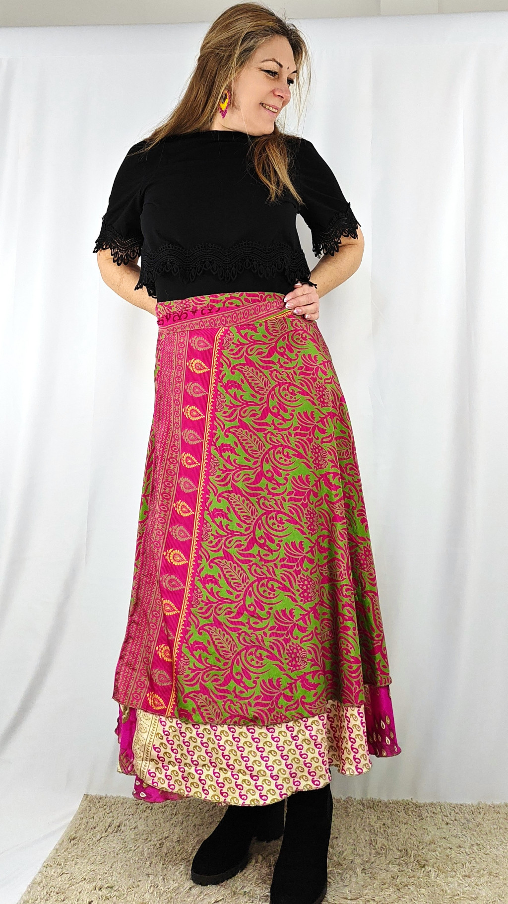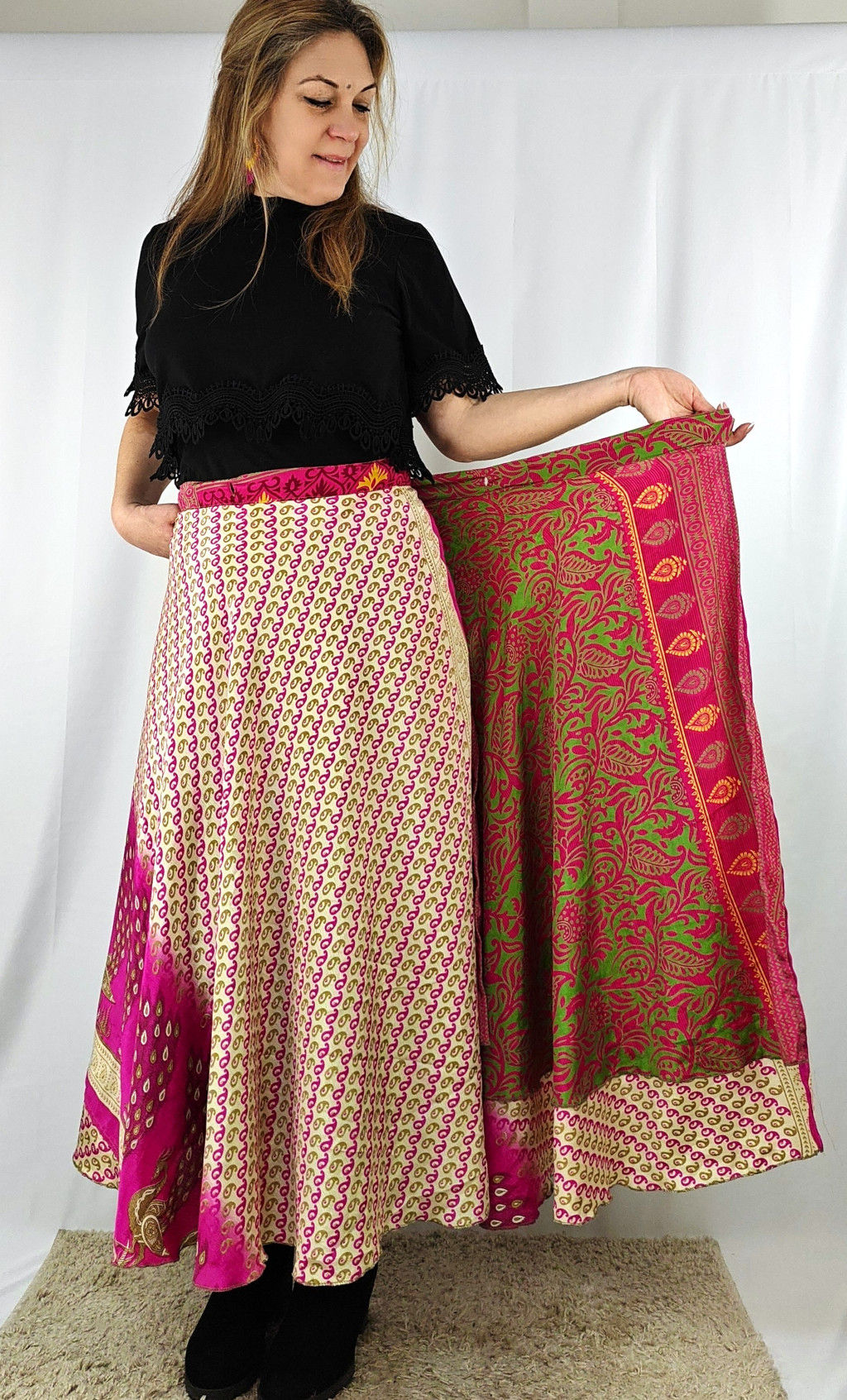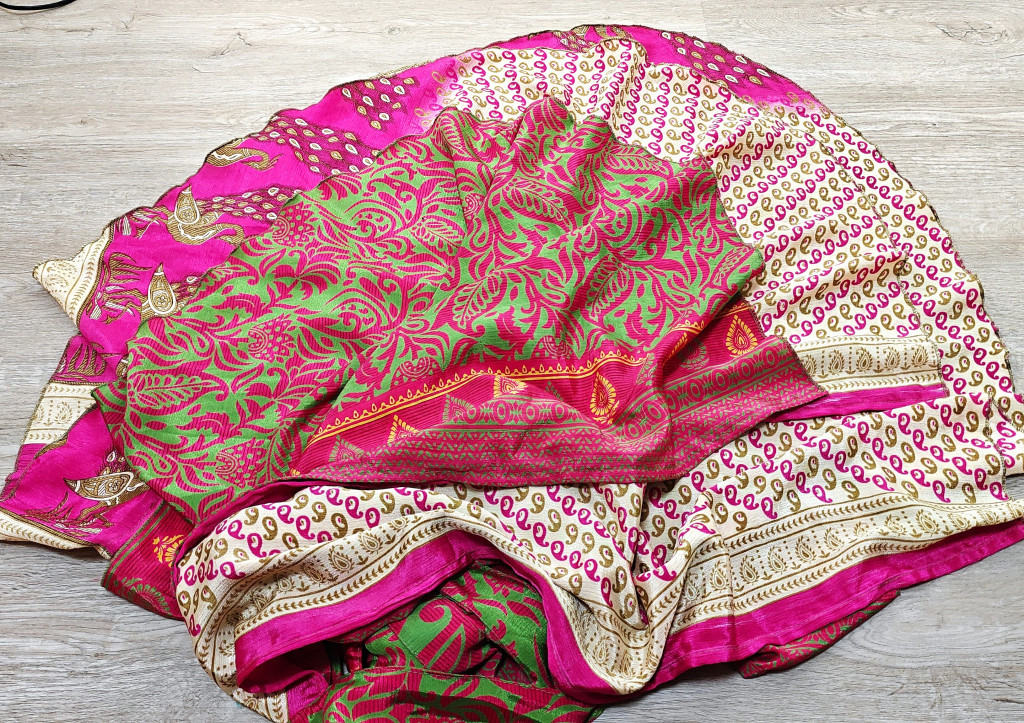 Lapszoknyáink újrahasznosított szárikból készülnek Indiában, egy hosszabb és egy rövidebb anyag derékban összevarrva! Két oldalú, kifordítható, mindkét oldala hordható, sokféleképpen köthető, variálható. Szoknyáinkból nincs két egyforma, mindegyikből csak EGY darab van, ha megtetszik, csapj le rá!