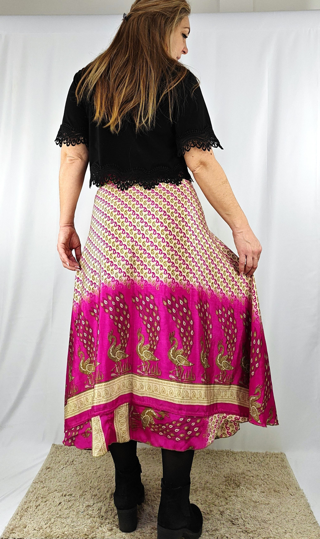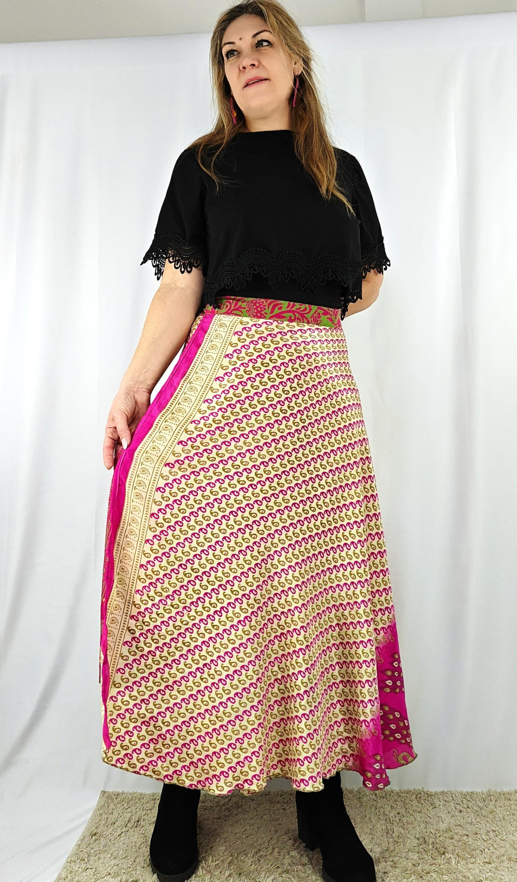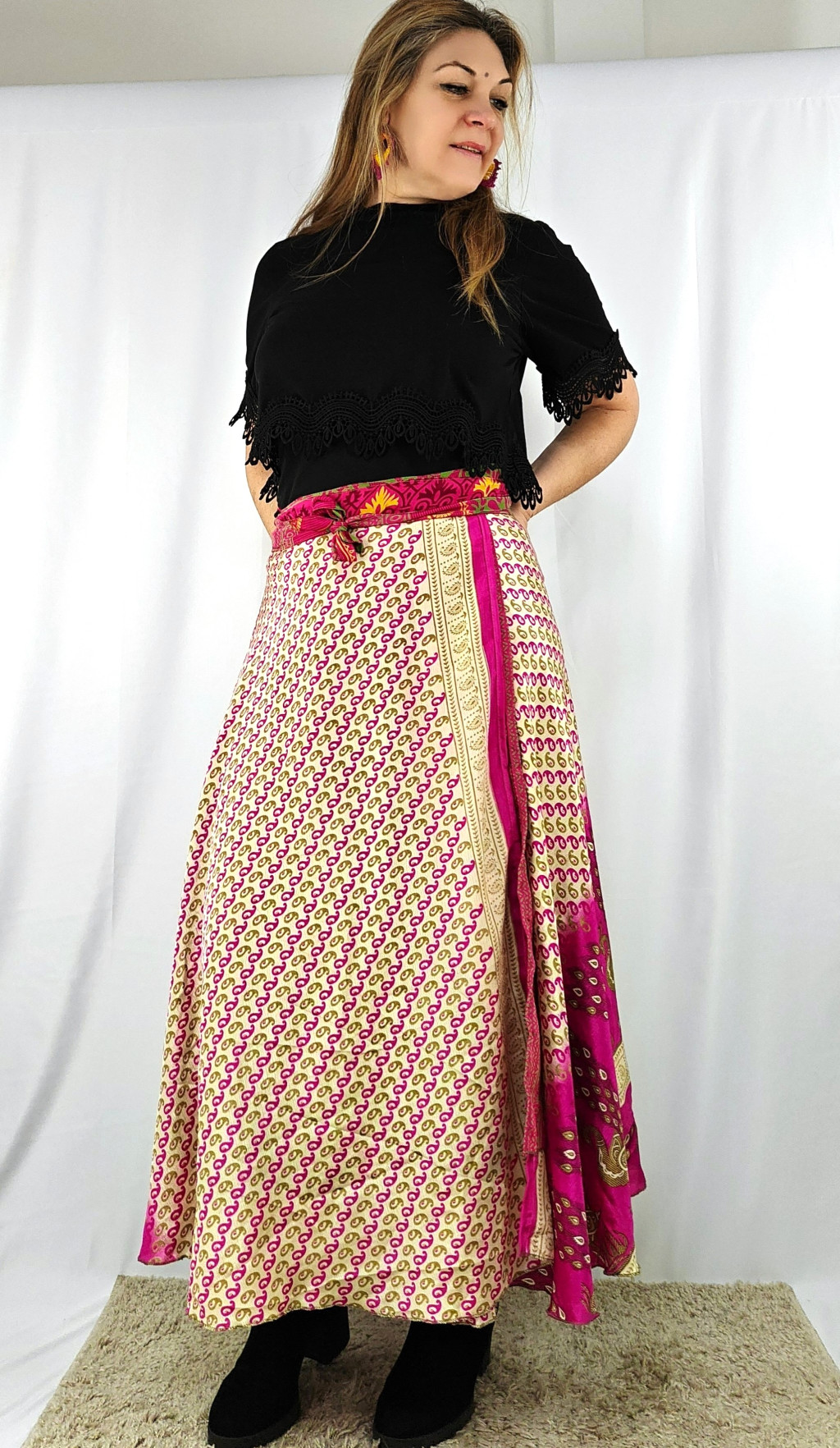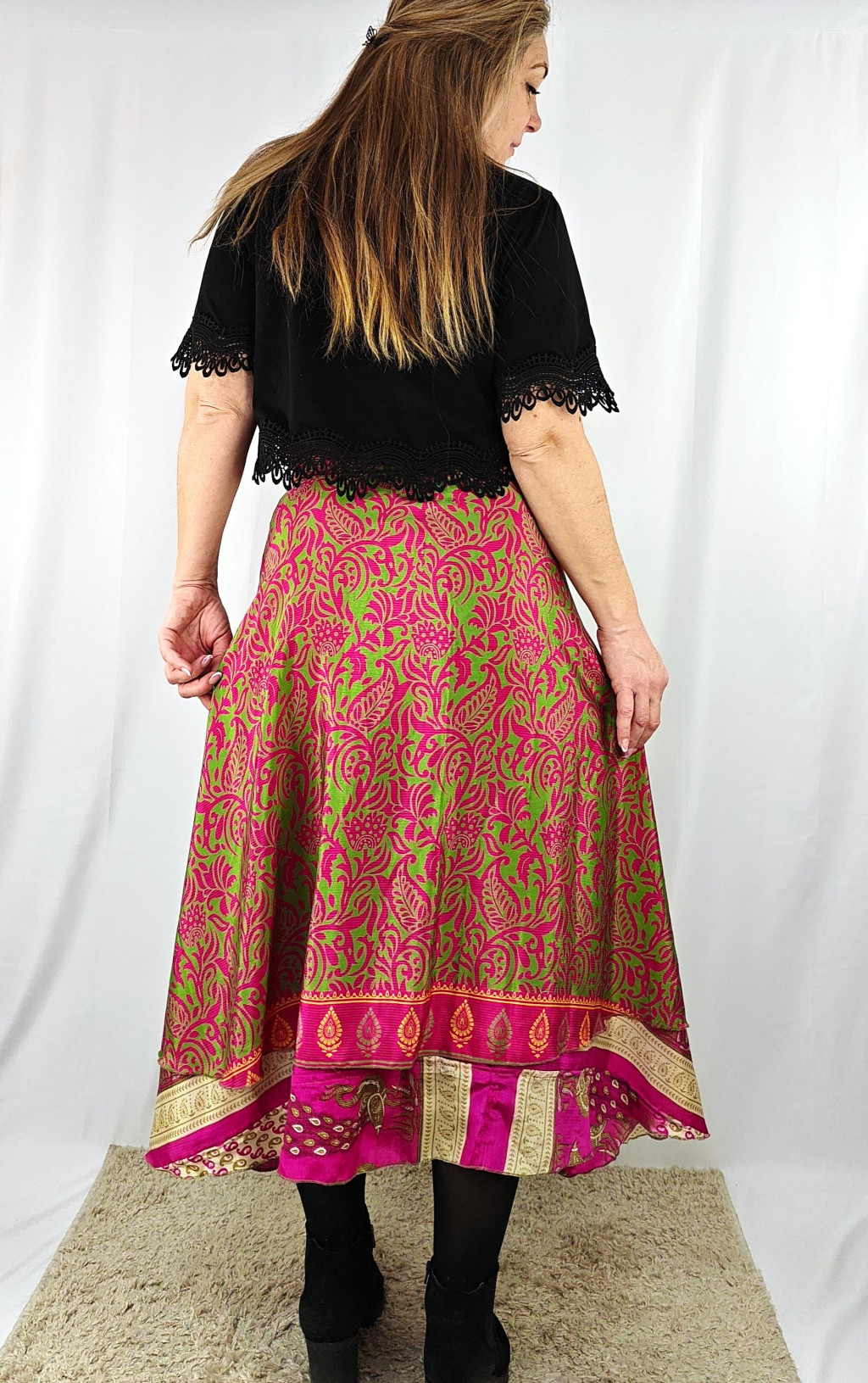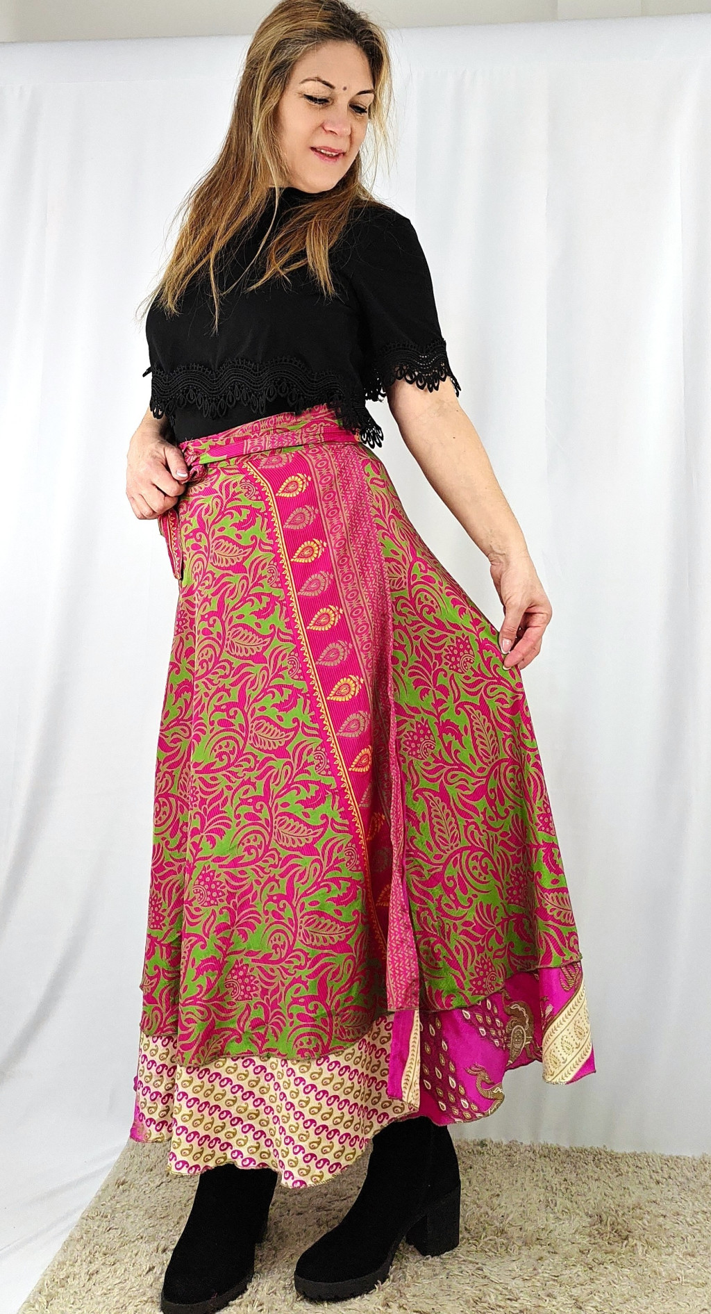 Lapszoknyáink újrahasznosított szárikból készülnek Indiában, egy hosszabb és egy rövidebb anyag derékban összevarrva! Két oldalú, kifordítható, mindkét oldala hordható, sokféleképpen köthető, variálható. Szoknyáinkból nincs két egyforma, mindegyikből csak EGY darab van, ha megtetszik, csapj le rá!