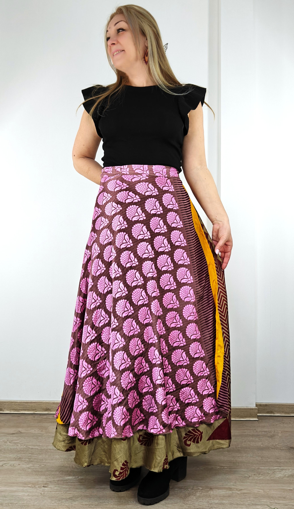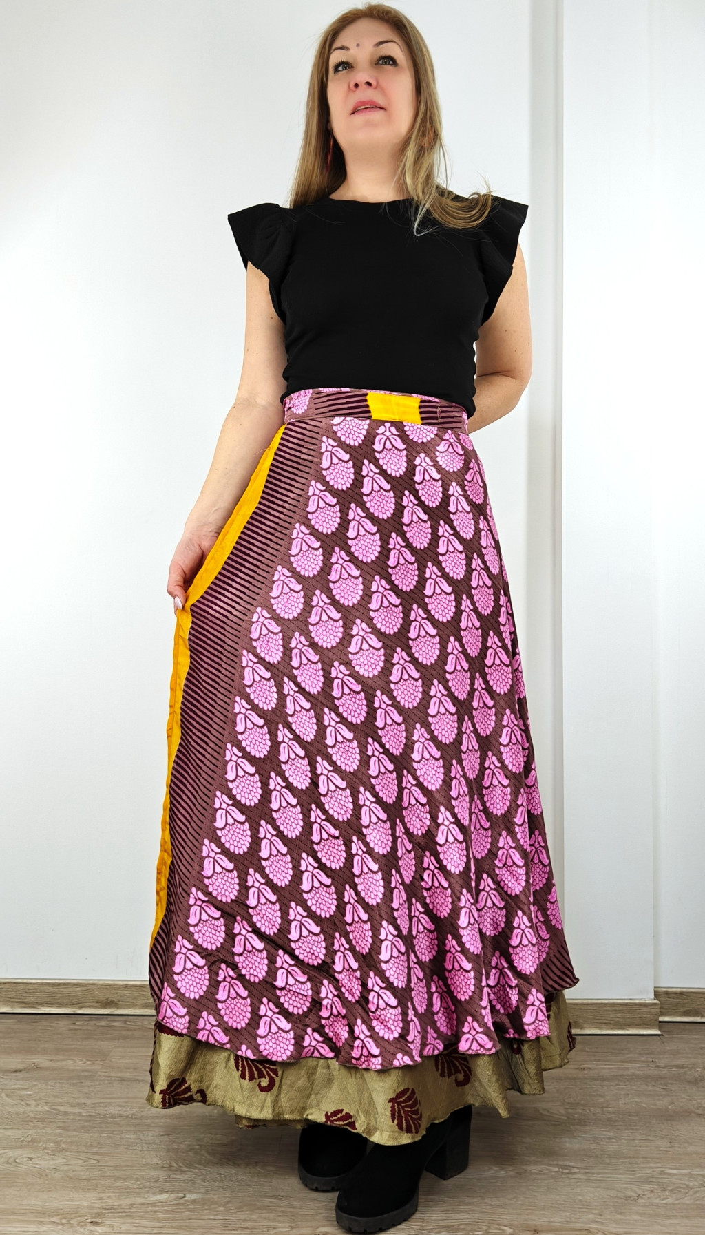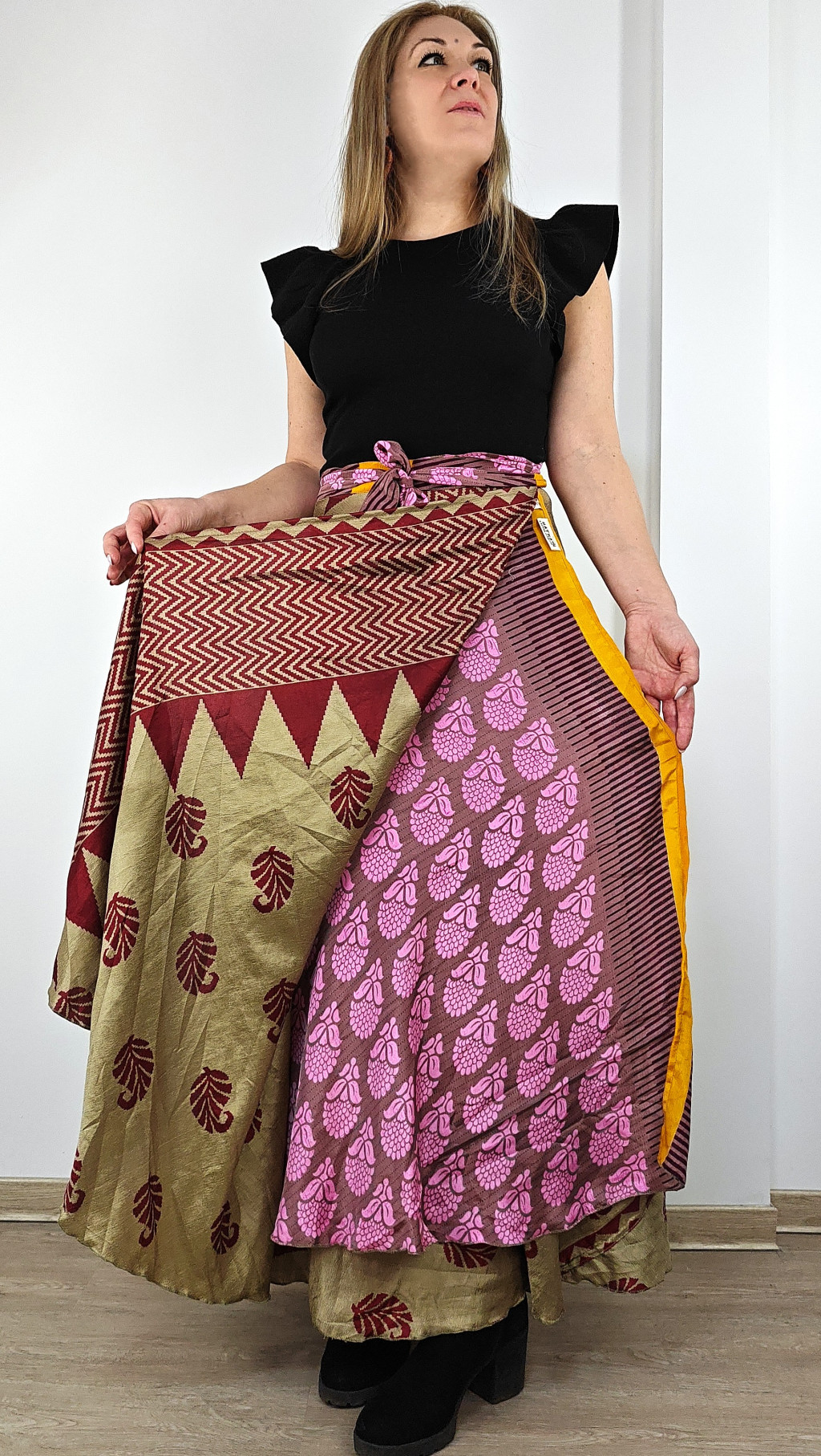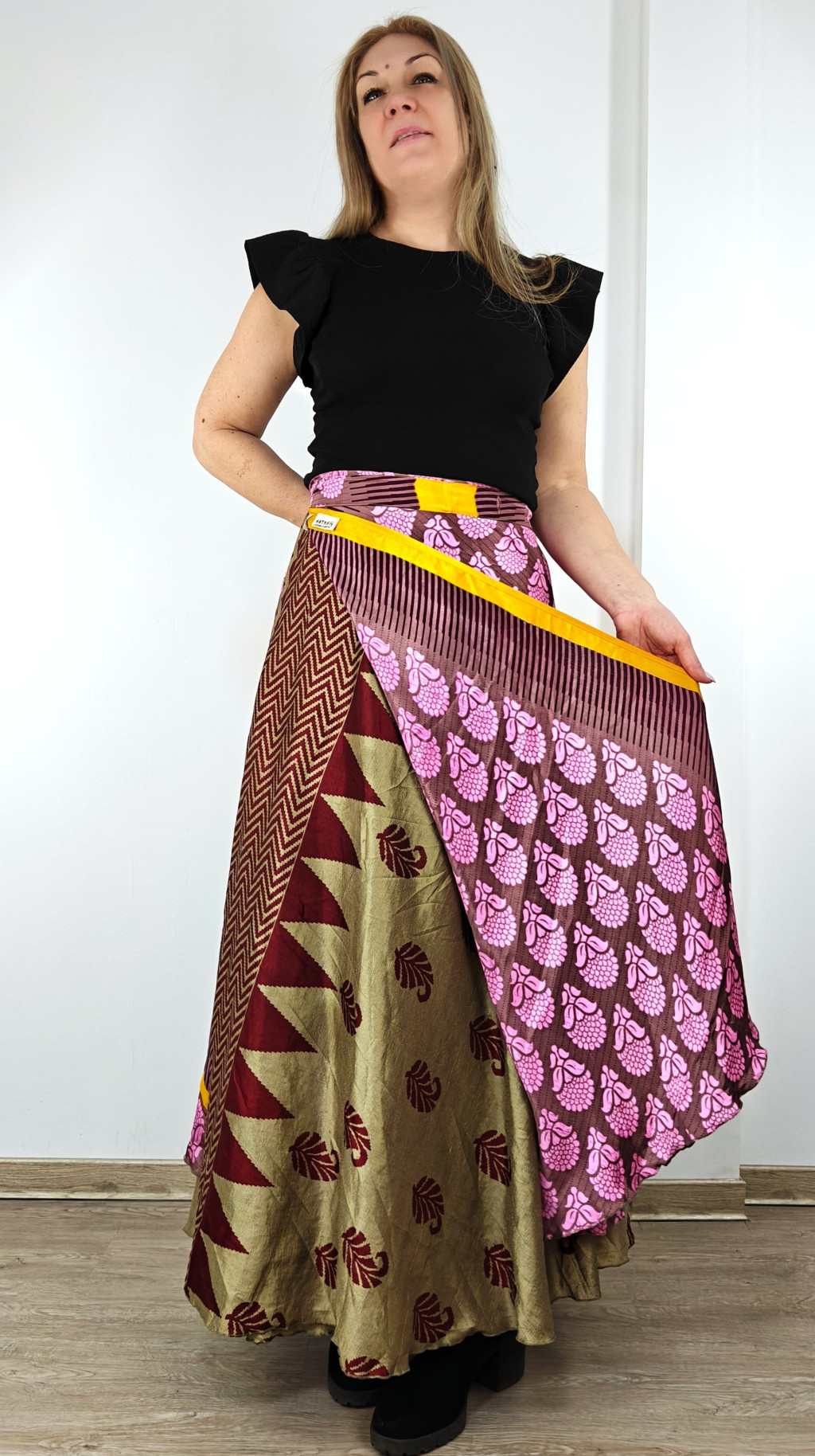 Lapszoknyáink újrahasznosított szárikból készülnek Indiában, egy hosszabb és egy rövidebb anyag derékban összevarrva! Két oldalú, kifordítható, mindkét oldala hordható, sokféleképpen köthető, variálható. Szoknyáinkból nincs két egyforma, mindegyikből csak EGY darab van, ha megtetszik, csapj le rá!