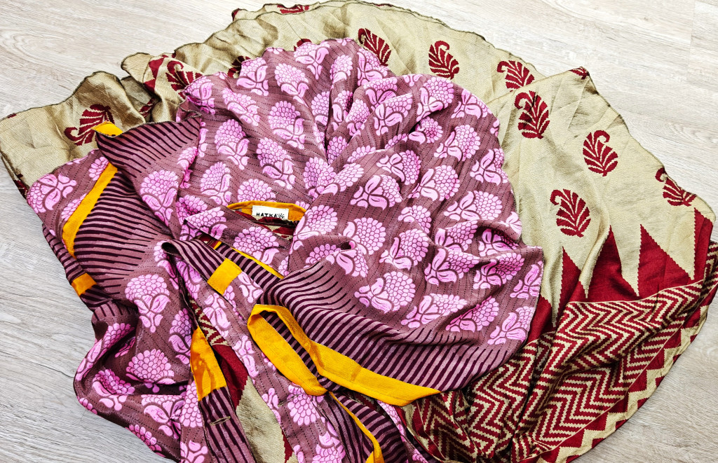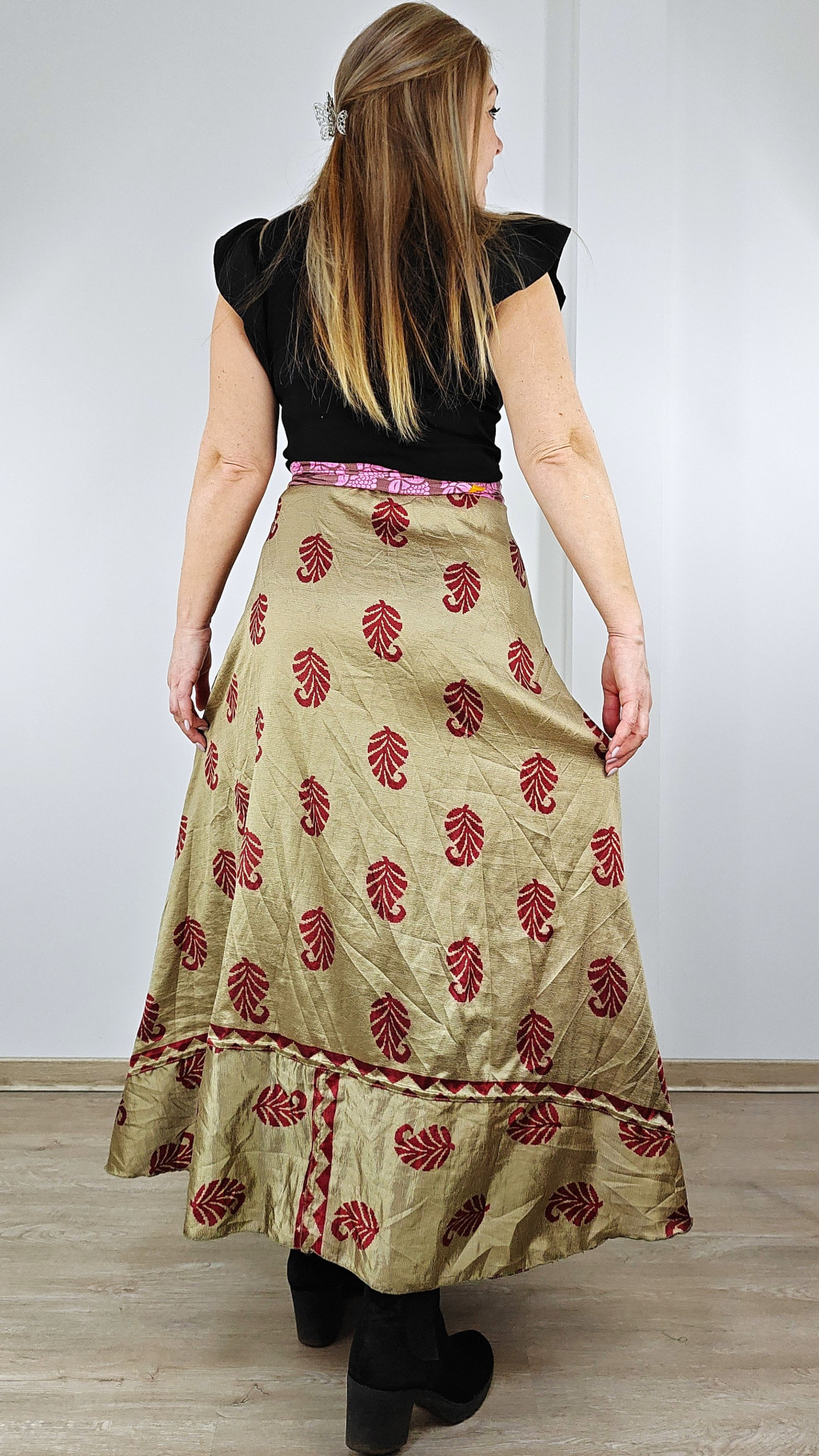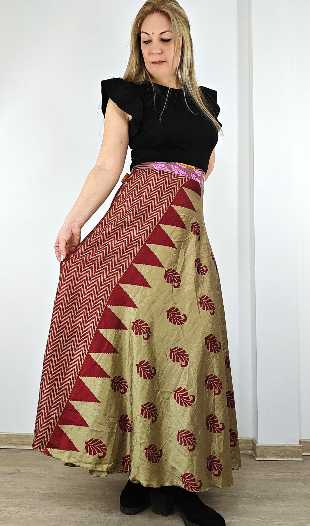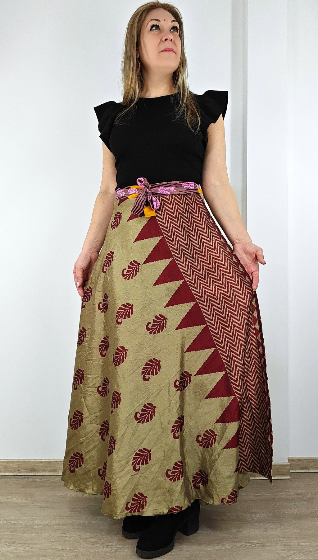 Lapszoknyáink újrahasznosított szárikból készülnek Indiában, egy hosszabb és egy rövidebb anyag derékban összevarrva! Két oldalú, kifordítható, mindkét oldala hordható, sokféleképpen köthető, variálható. Szoknyáinkból nincs két egyforma, mindegyikből csak EGY darab van, ha megtetszik, csapj le rá!