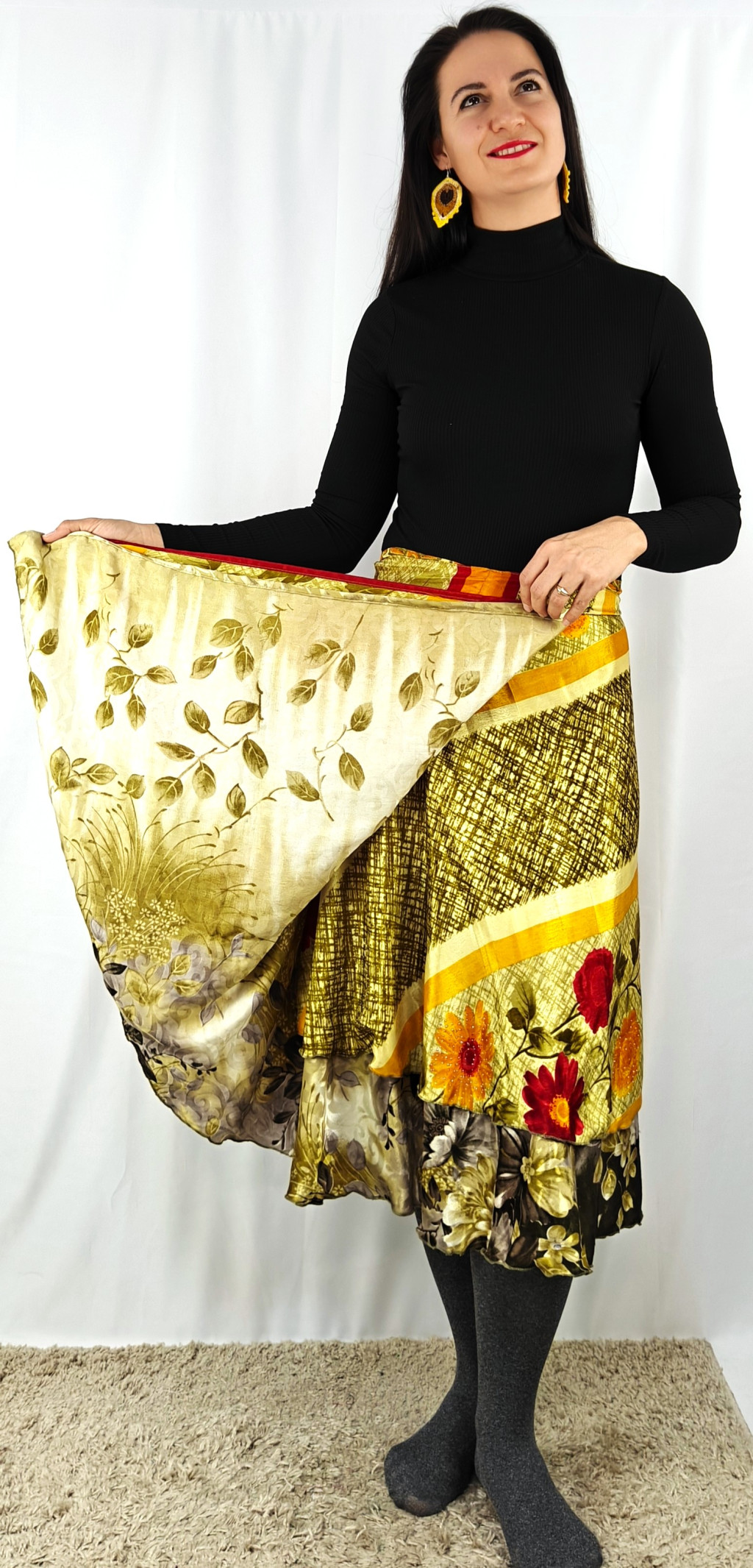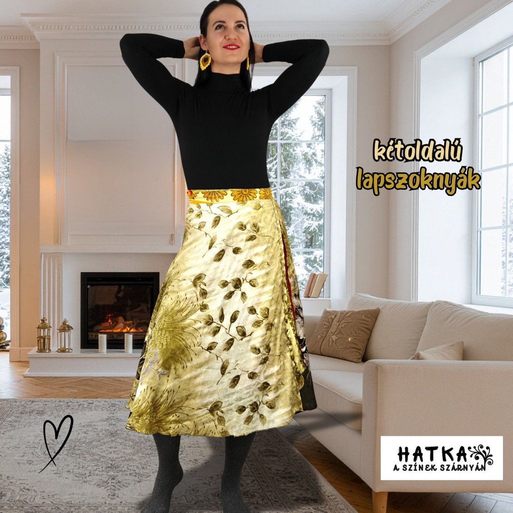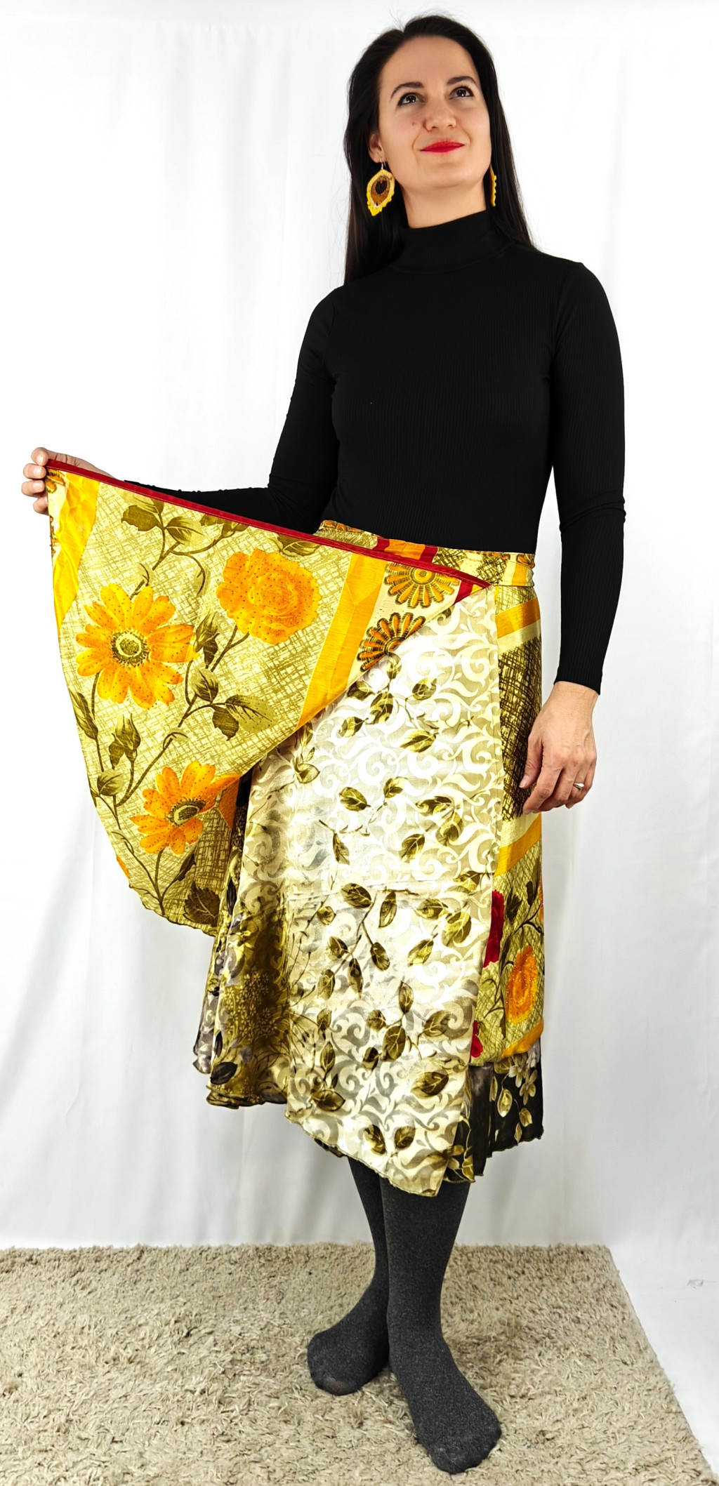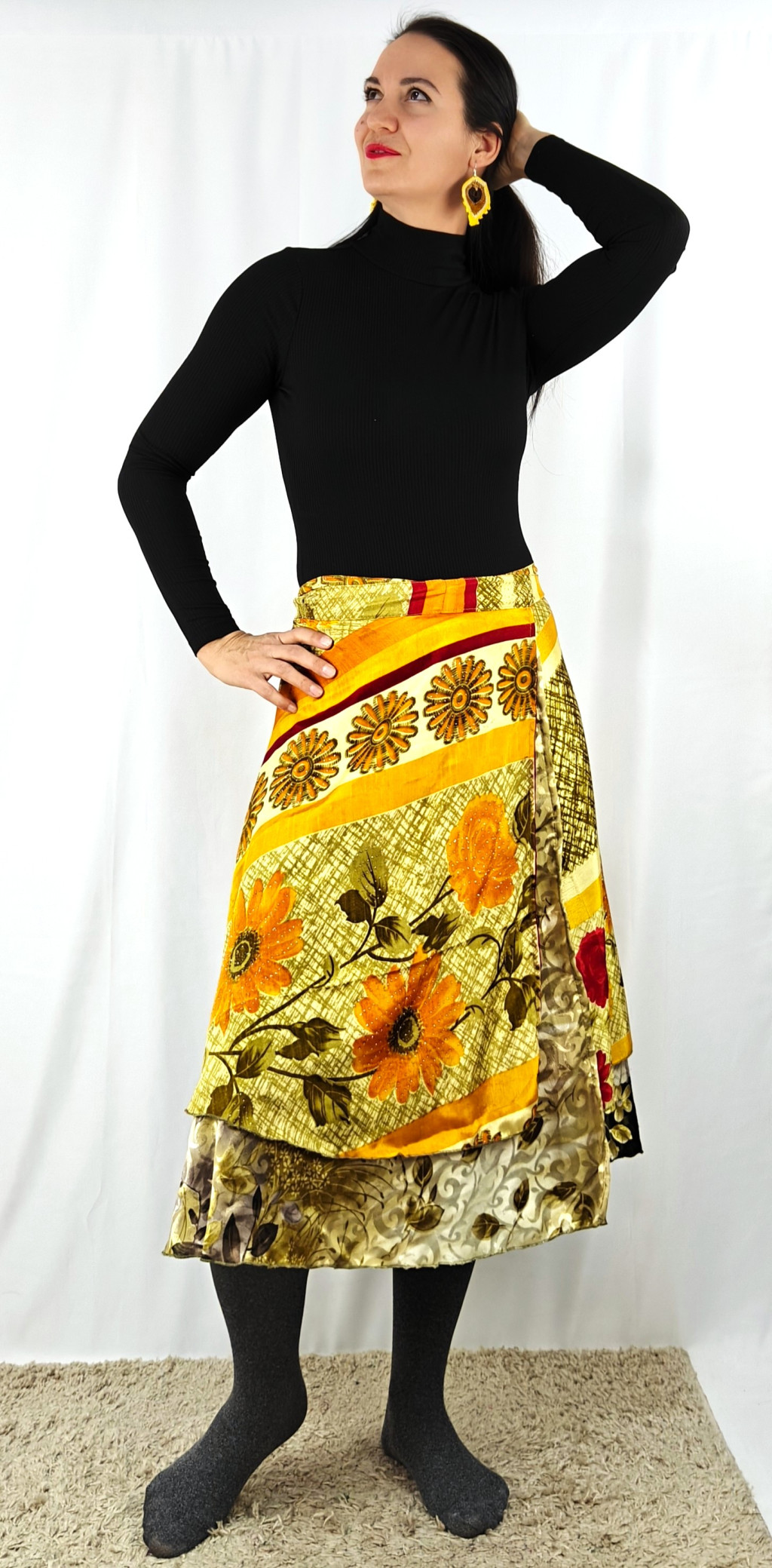 Lapszoknyáink újrahasznosított szárikból készülnek Indiában, egy hosszabb és egy rövidebb anyag derékban összevarrva! Két oldalú, kifordítható, mindkét oldala hordható, sokféleképpen köthető, variálható. Szoknyáinkból nincs két egyforma, mindegyikből csak EGY darab van, ha megtetszik, csapj le rá!