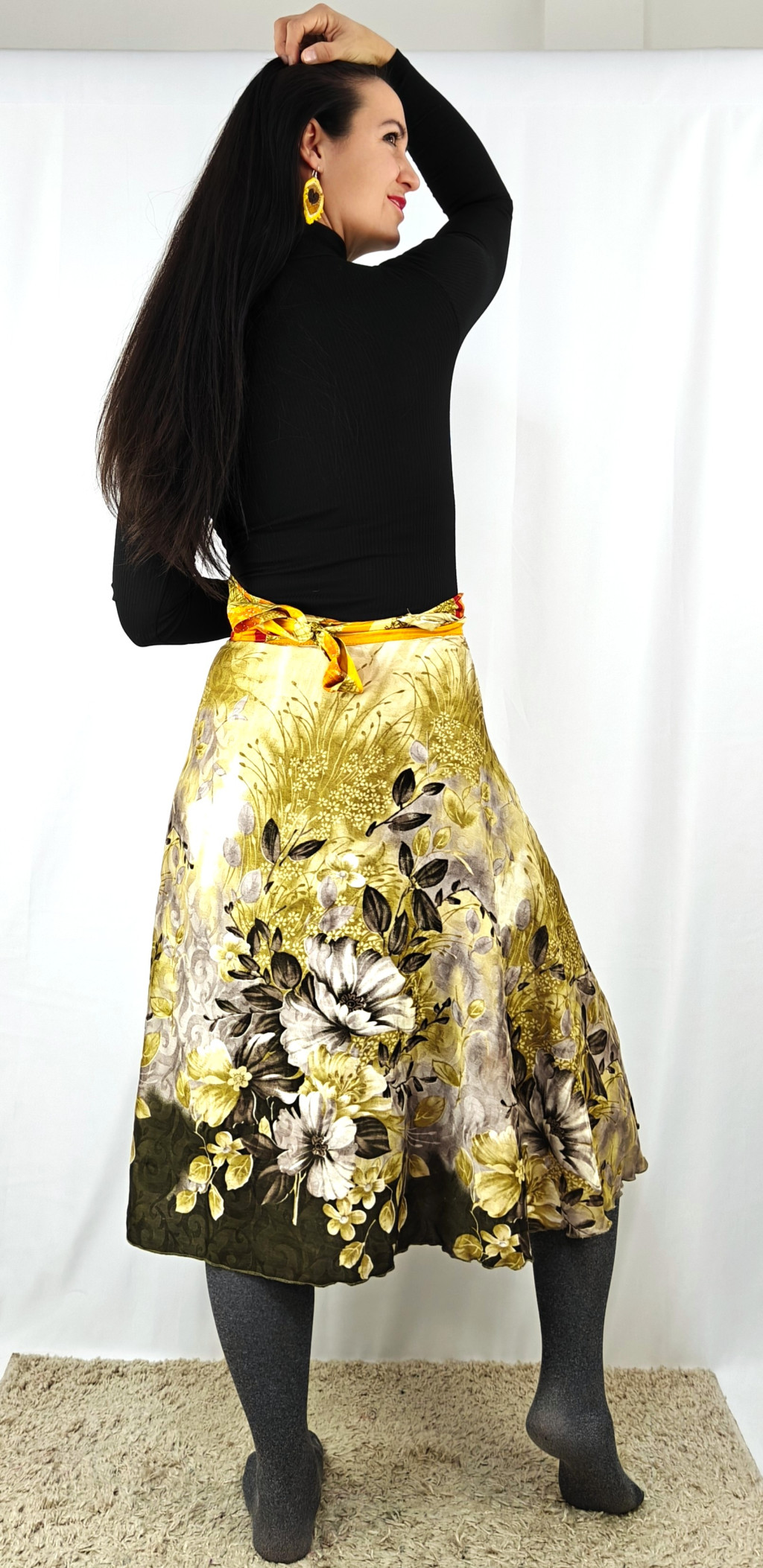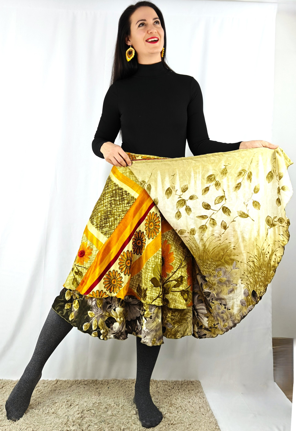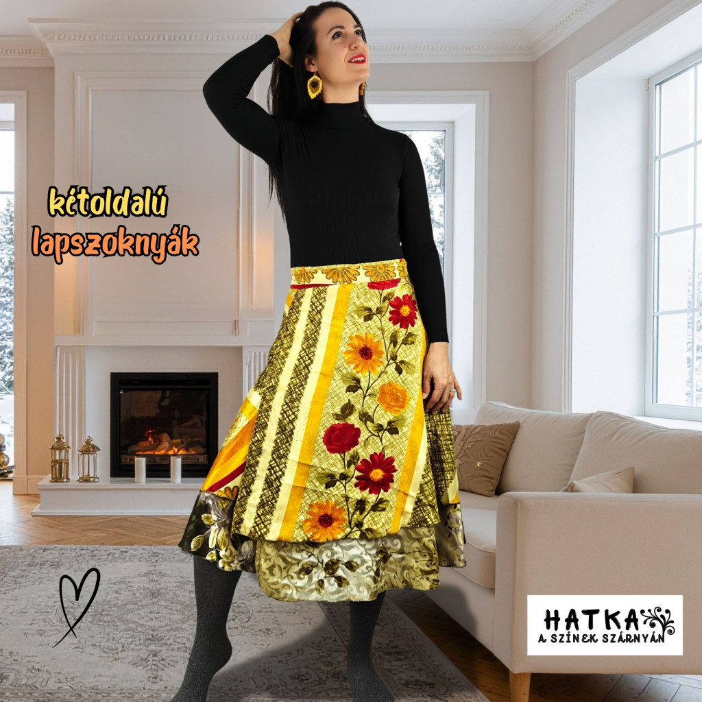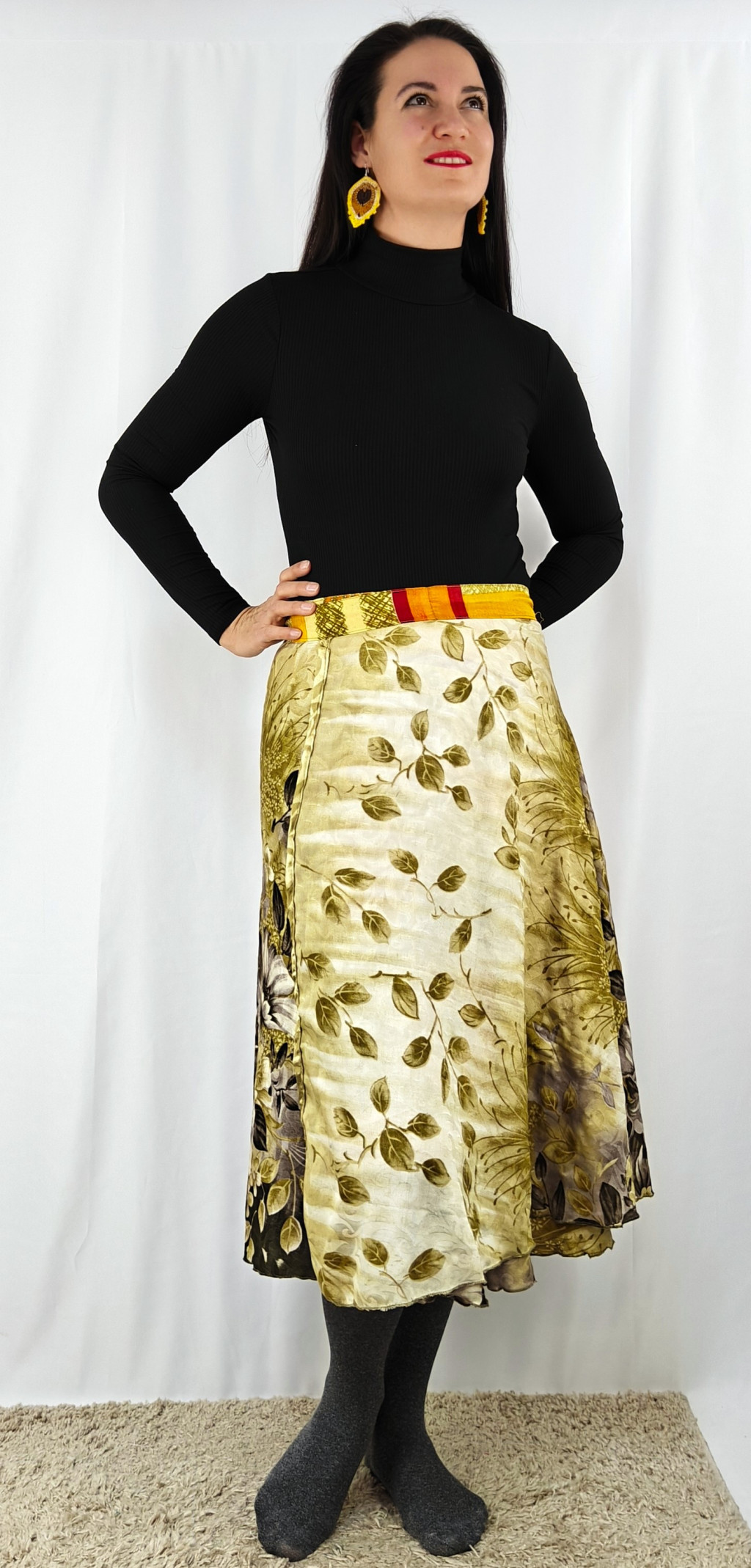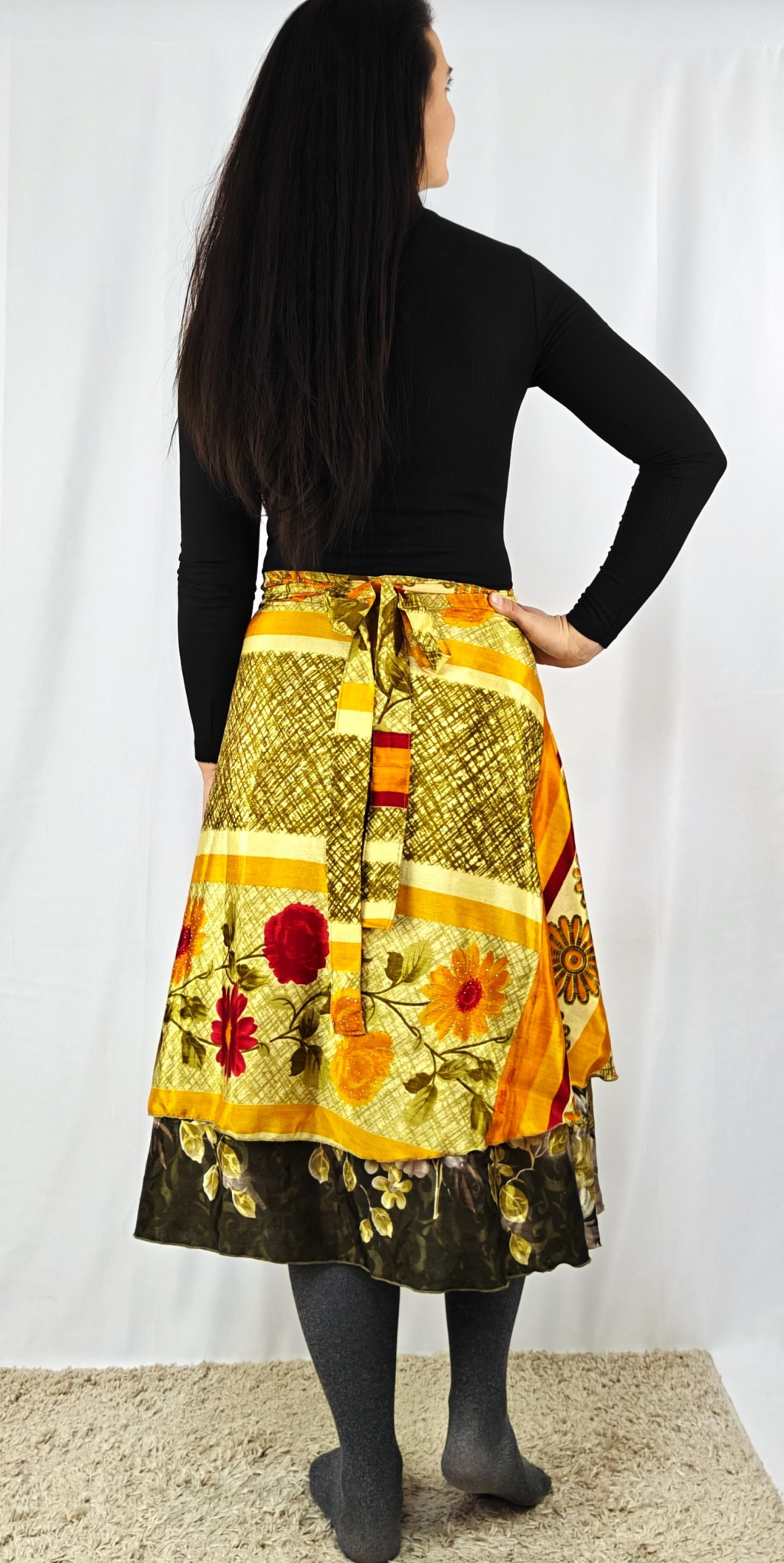 Lapszoknyáink újrahasznosított szárikból készülnek Indiában, egy hosszabb és egy rövidebb anyag derékban összevarrva! Két oldalú, kifordítható, mindkét oldala hordható, sokféleképpen köthető, variálható. Szoknyáinkból nincs két egyforma, mindegyikből csak EGY darab van, ha megtetszik, csapj le rá!