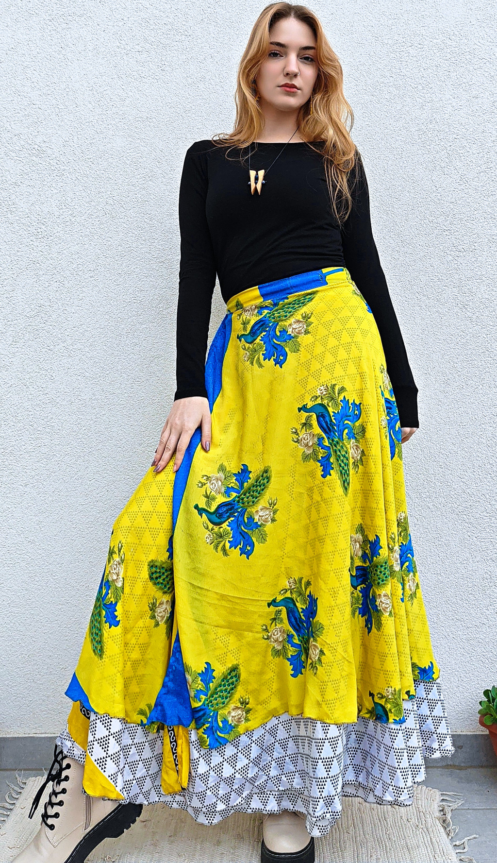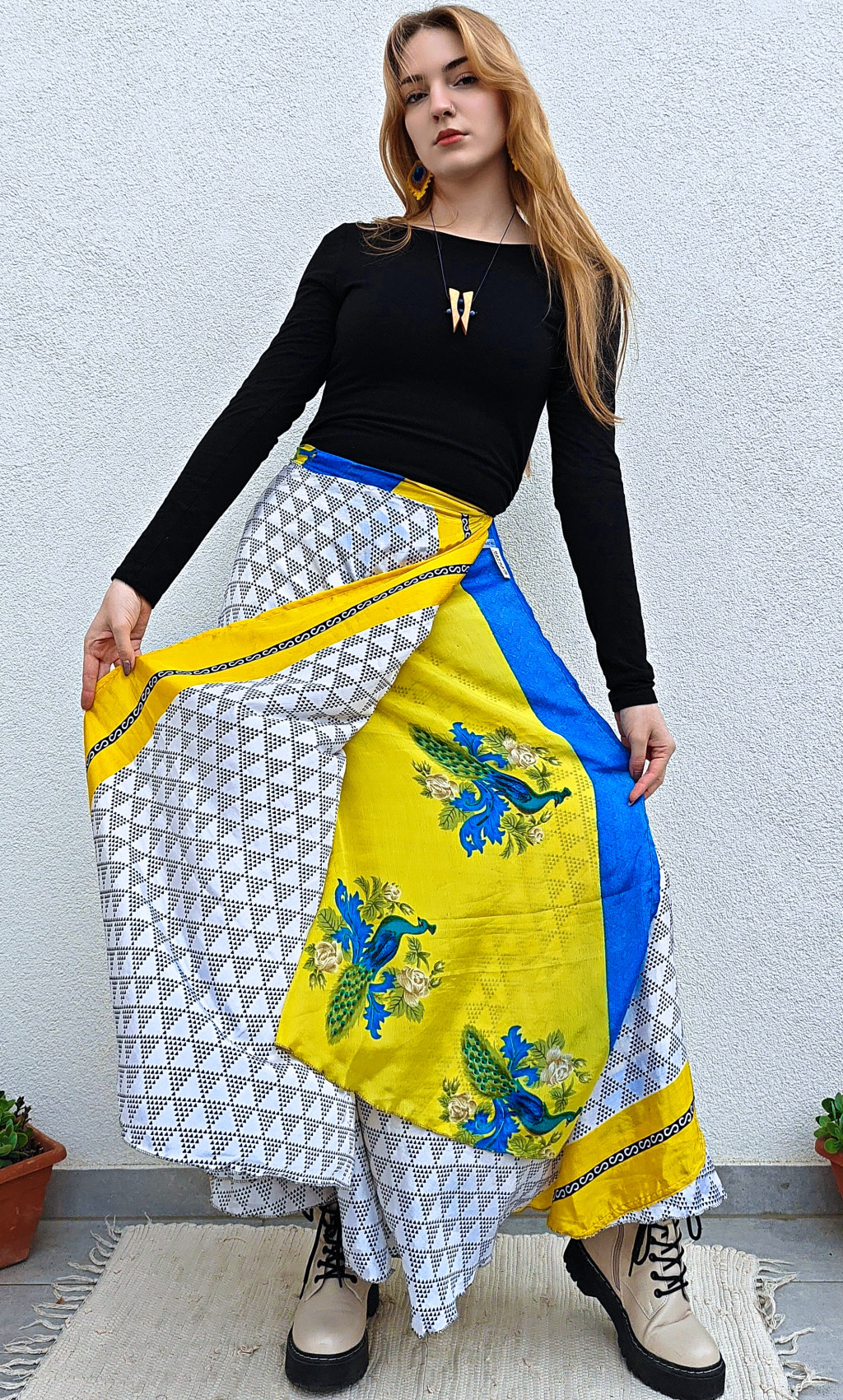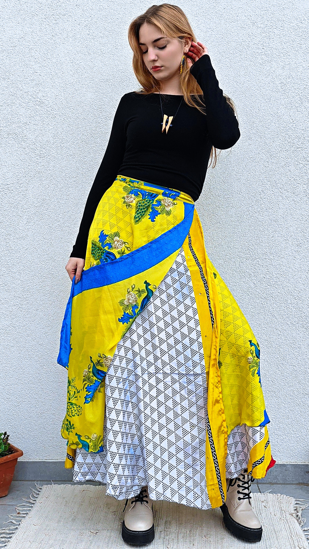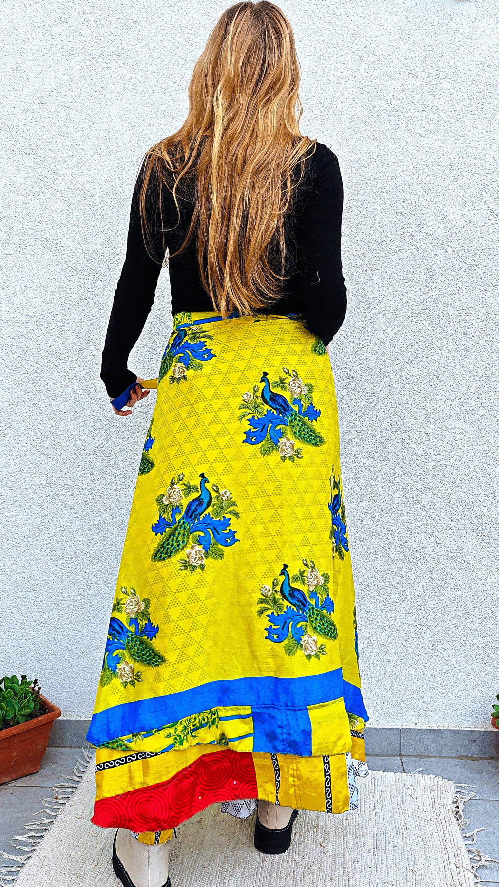 Lapszoknyáink újrahasznosított szárikból készülnek Indiában, egy hosszabb és egy rövidebb anyag derékban összevarrva! Két oldalú, kifordítható, mindkét oldala hordható, sokféleképpen köthető, variálható. Szoknyáinkból nincs két egyforma, mindegyikből csak EGY darab van, ha megtetszik, csapj le rá!