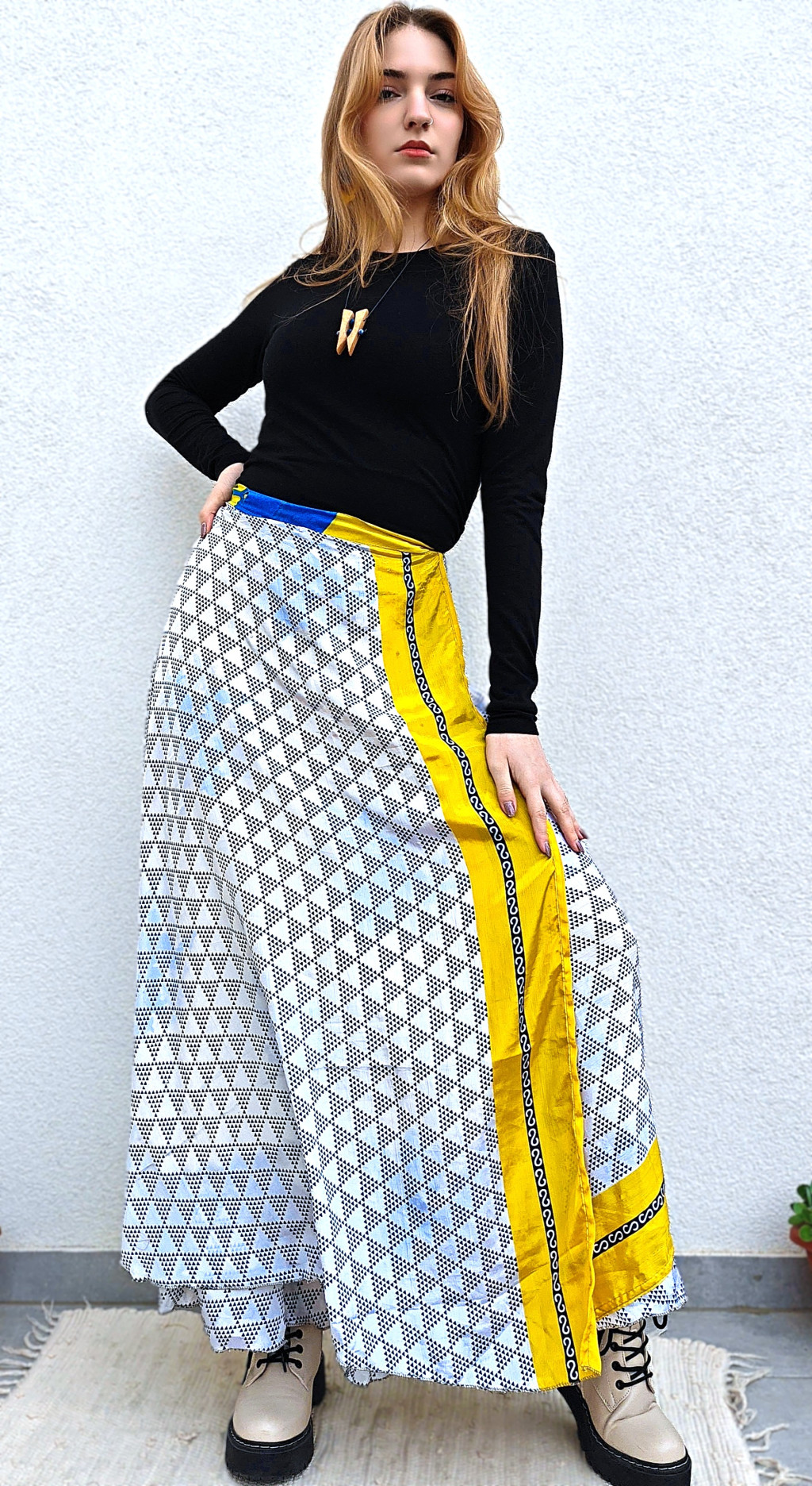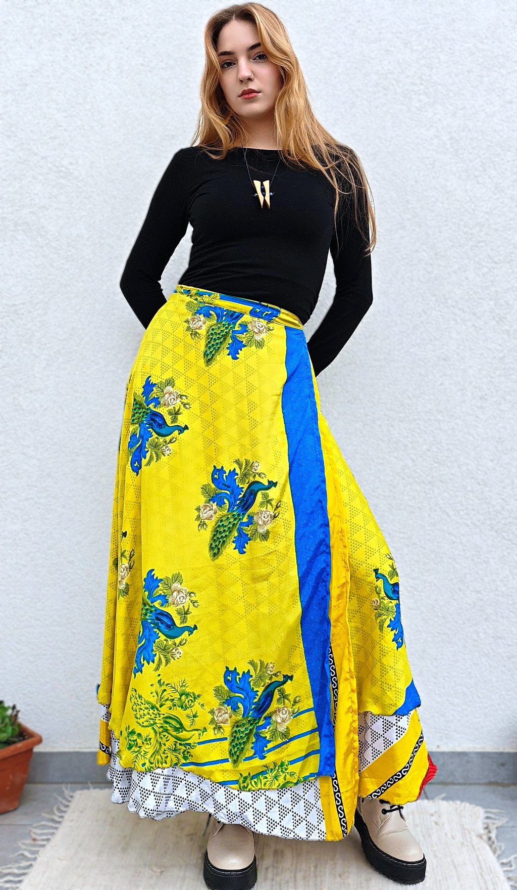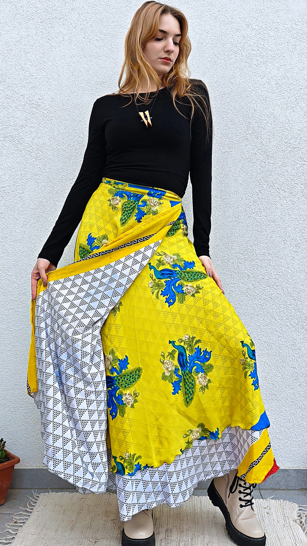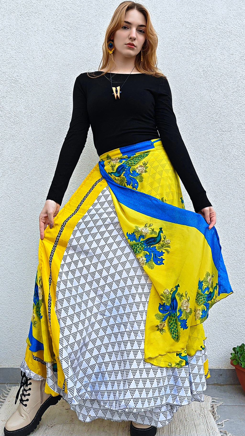 Lapszoknyáink újrahasznosított szárikból készülnek Indiában, egy hosszabb és egy rövidebb anyag derékban összevarrva! Két oldalú, kifordítható, mindkét oldala hordható, sokféleképpen köthető, variálható. Szoknyáinkból nincs két egyforma, mindegyikből csak EGY darab van, ha megtetszik, csapj le rá!