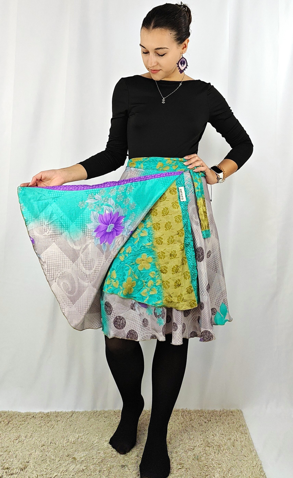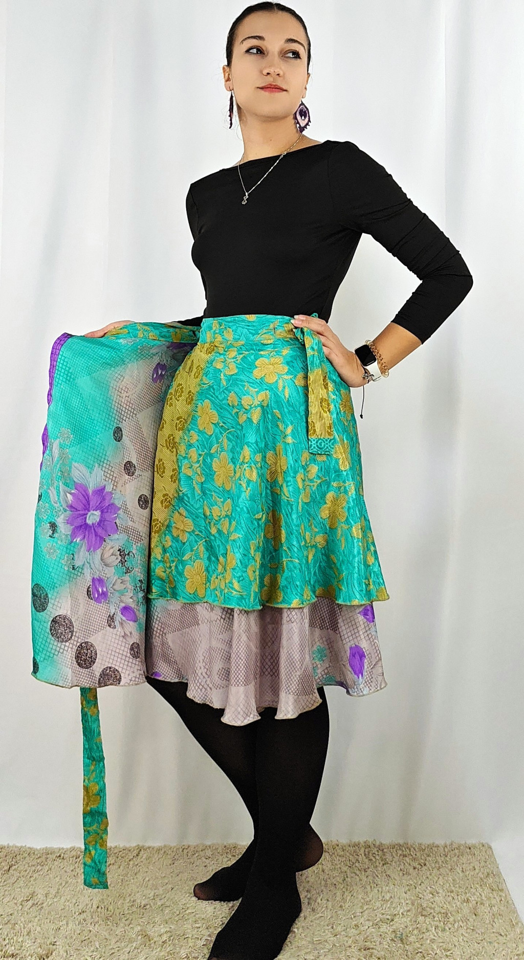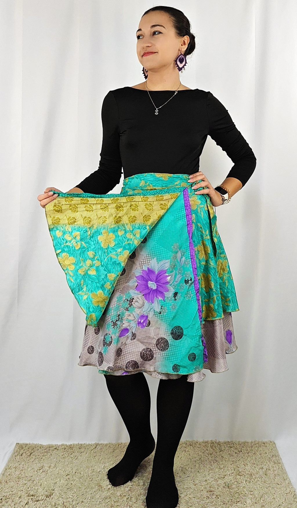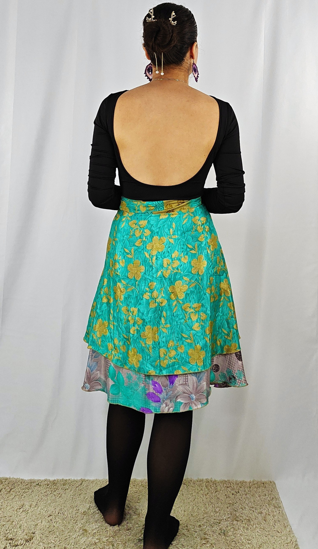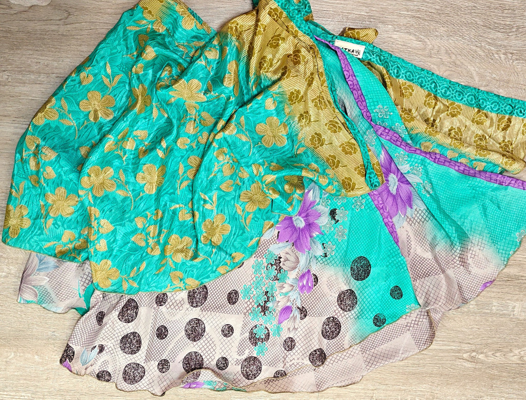 Lapszoknyáink újrahasznosított szárikból készülnek Indiában, egy hosszabb és egy rövidebb anyag derékban összevarrva! Két oldalú, kifordítható, mindkét oldala hordható, sokféleképpen köthető, variálható. Szoknyáinkból nincs két egyforma, mindegyikből csak EGY darab van, ha megtetszik, csapj le rá!