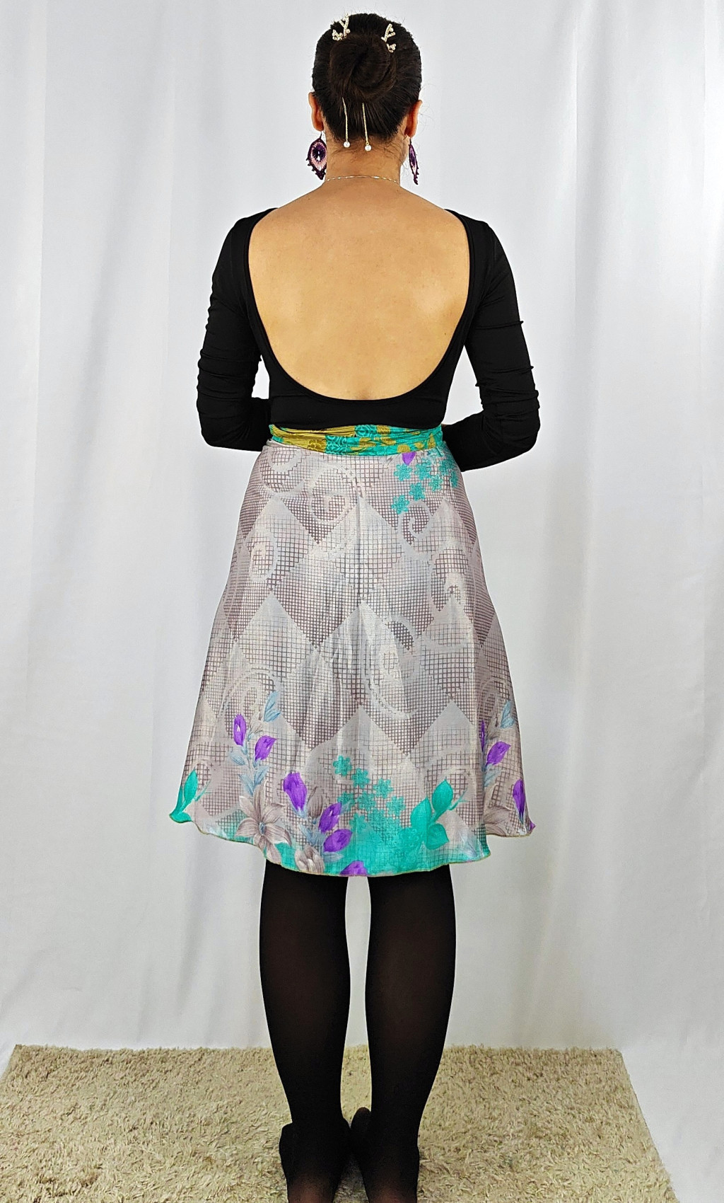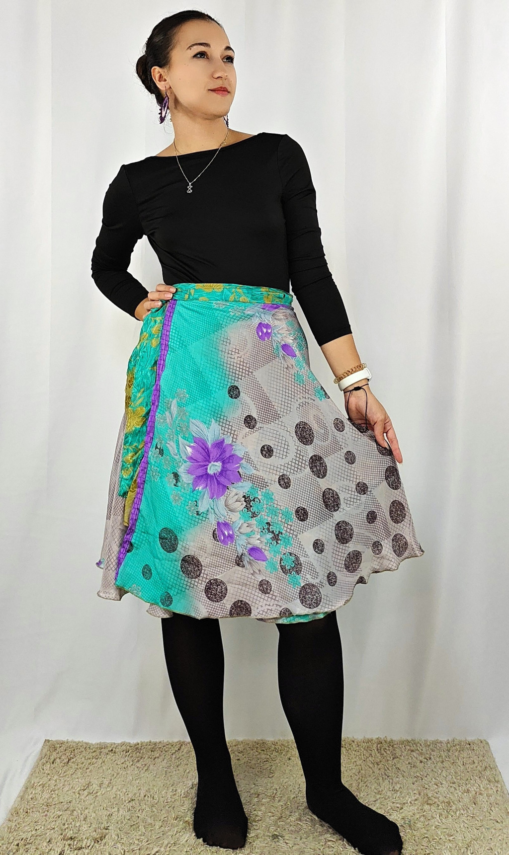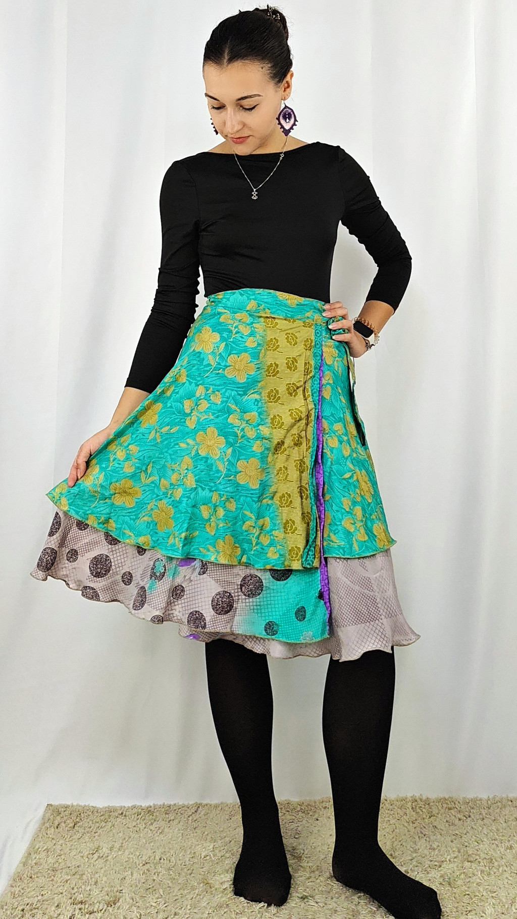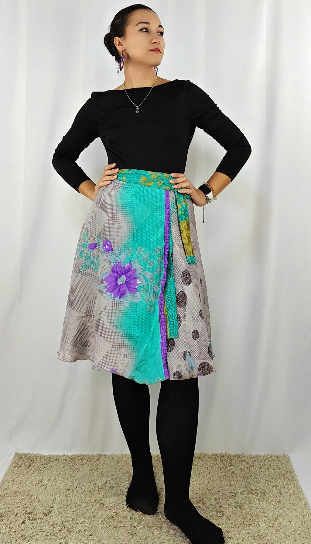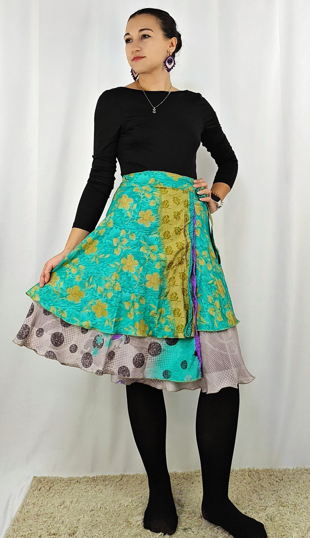 Lapszoknyáink újrahasznosított szárikból készülnek Indiában, egy hosszabb és egy rövidebb anyag derékban összevarrva! Két oldalú, kifordítható, mindkét oldala hordható, sokféleképpen köthető, variálható. Szoknyáinkból nincs két egyforma, mindegyikből csak EGY darab van, ha megtetszik, csapj le rá!