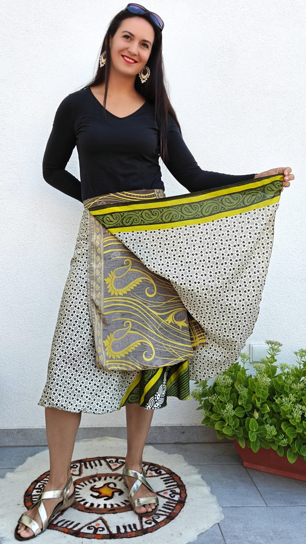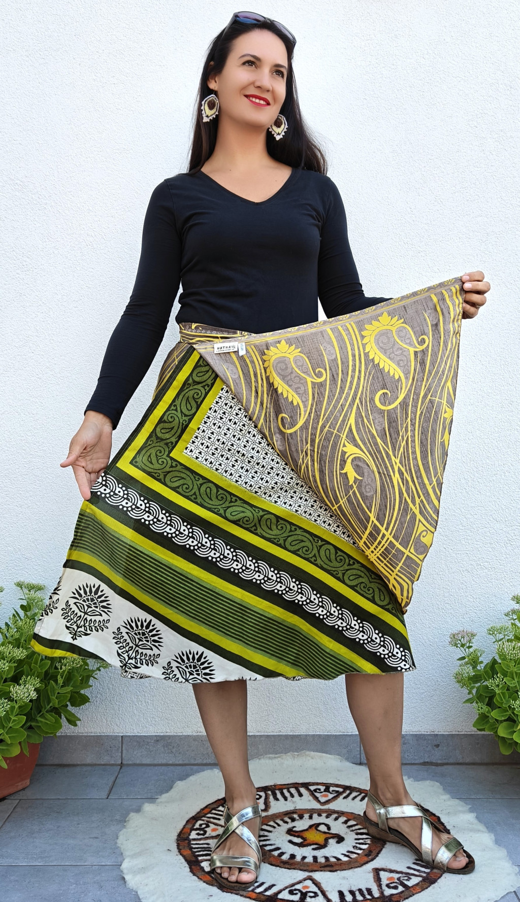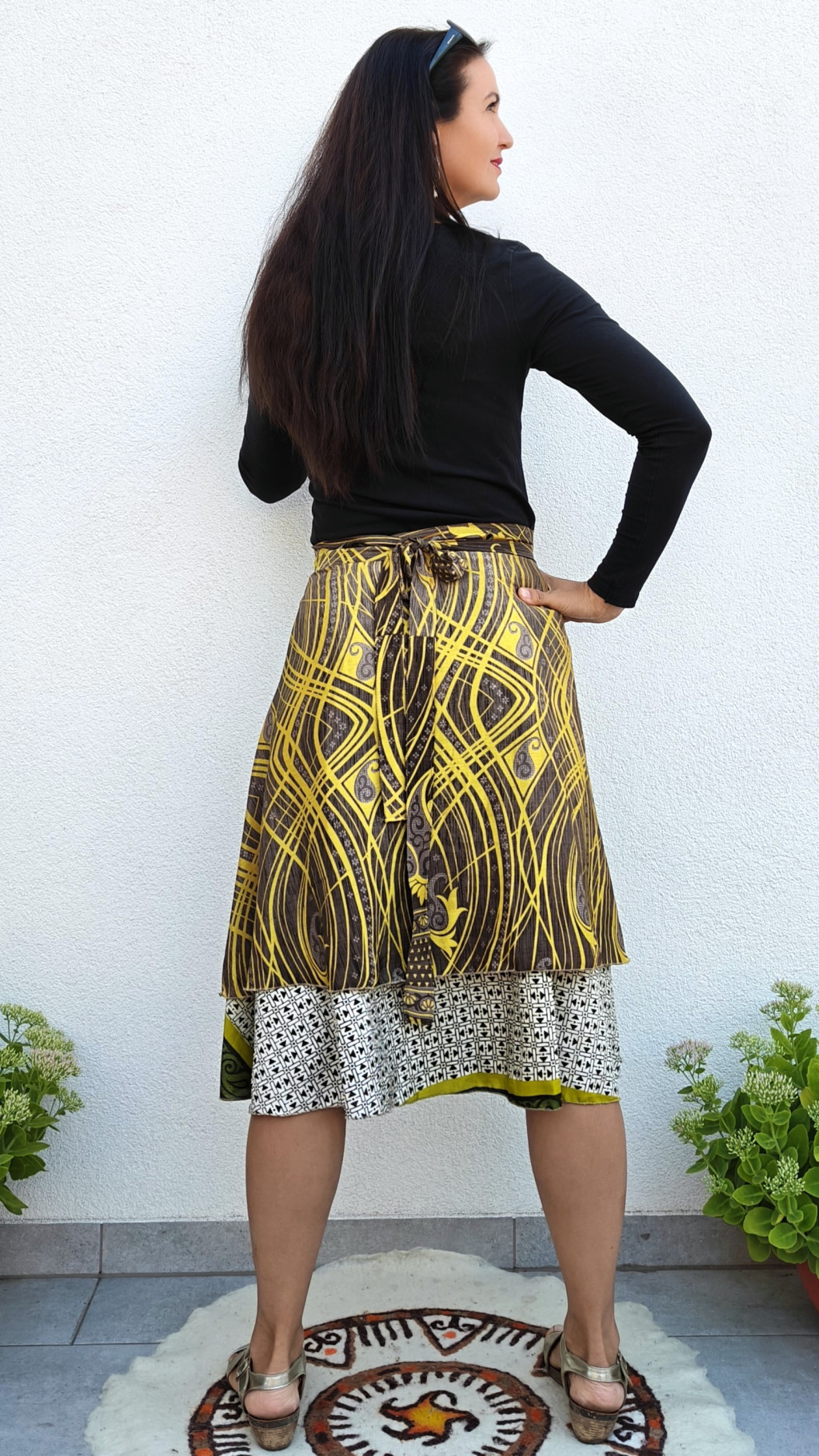 Lapszoknyáink újrahasznosított szárikból készülnek Indiában, egy hosszabb és egy rövidebb anyag derékban összevarrva! Két oldalú, kifordítható, mindkét oldala hordható, sokféleképpen köthető, variálható. Szoknyáinkból nincs két egyforma, mindegyikből csak EGY darab van, ha megtetszik, csapj le rá!